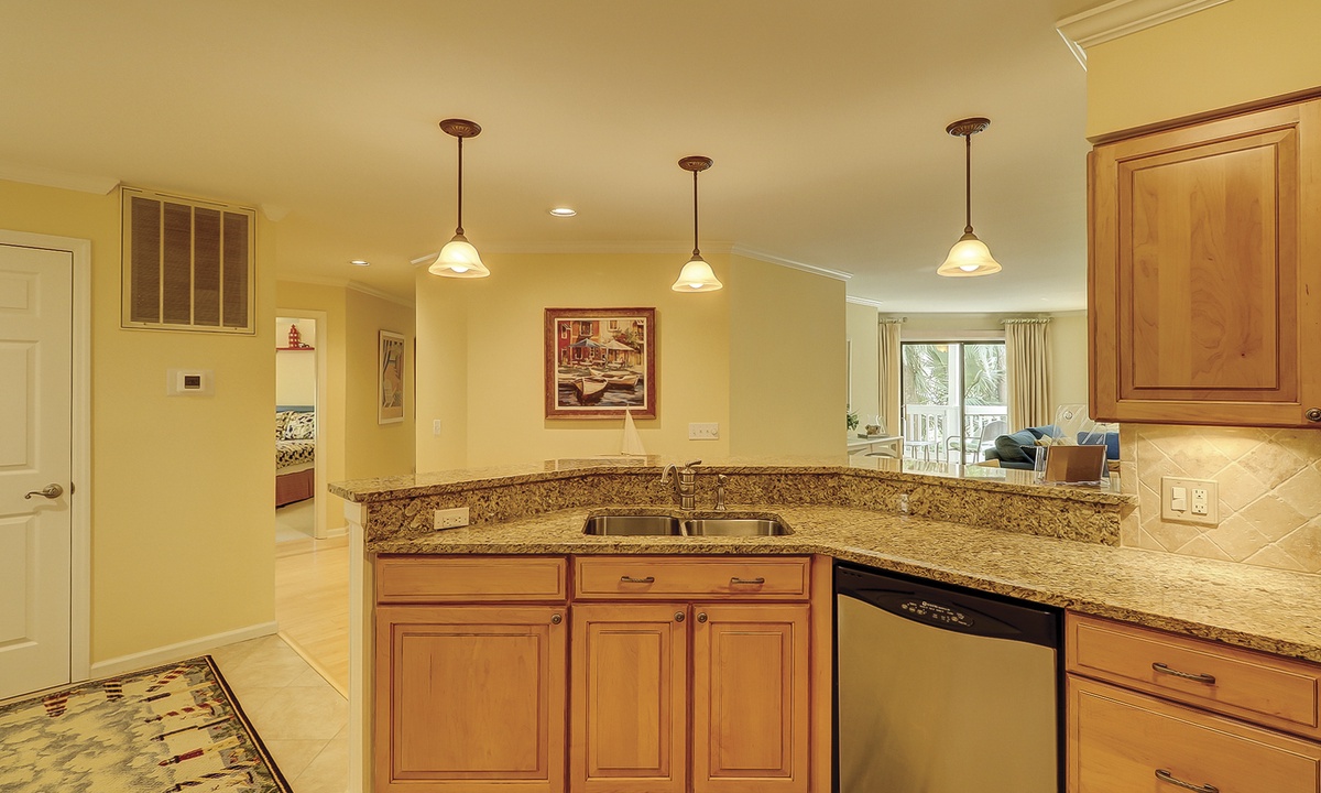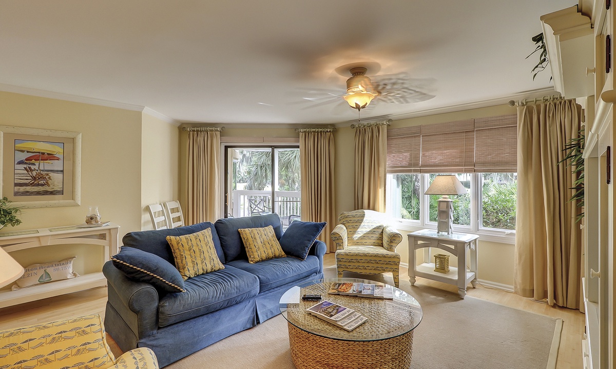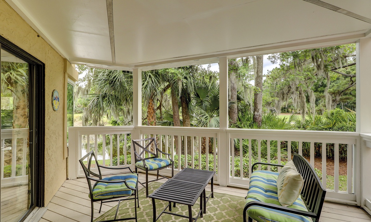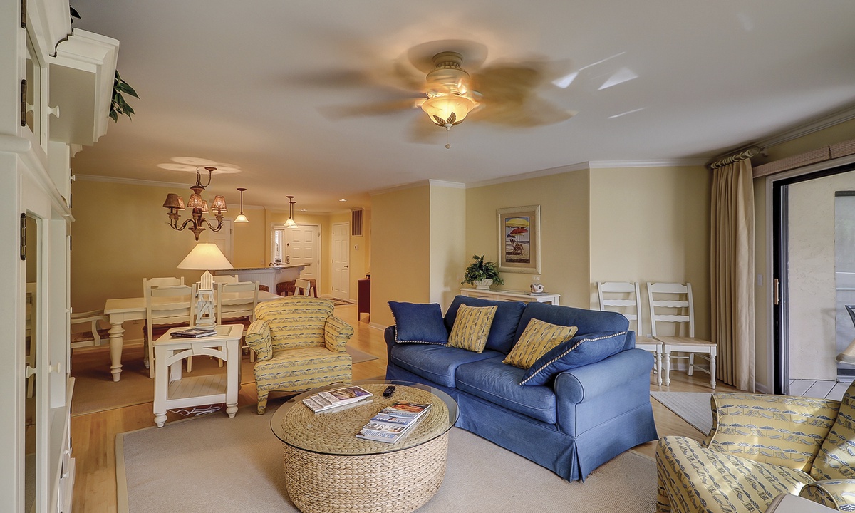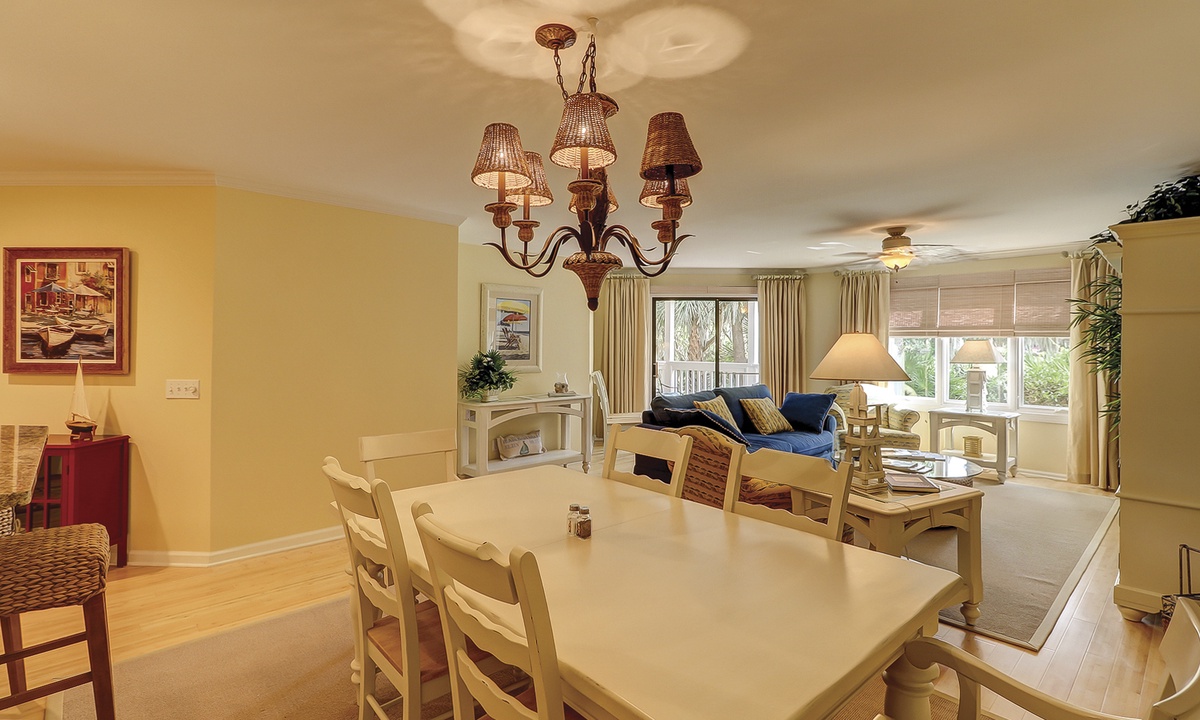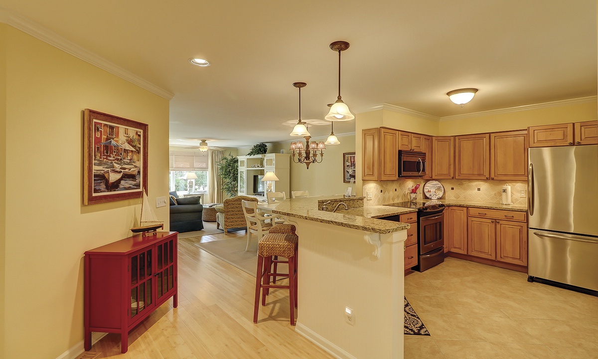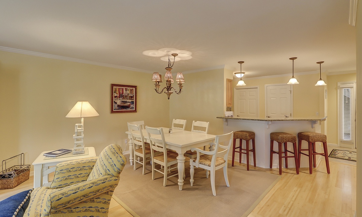 The dining table seats 6 comfortably, with additional seating at the kitchen bar. The living area, just off the dining room, features a comfortable sofa, two club chairs and access to the private patio overlooking the golf course and lagoon.