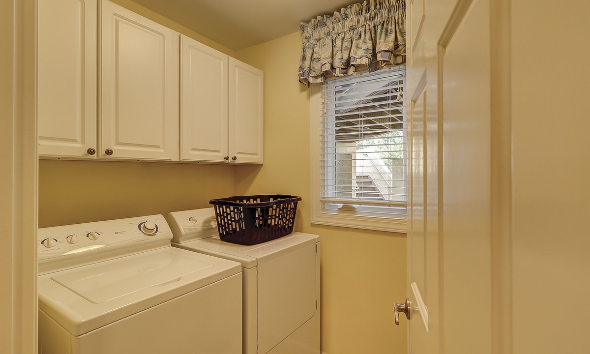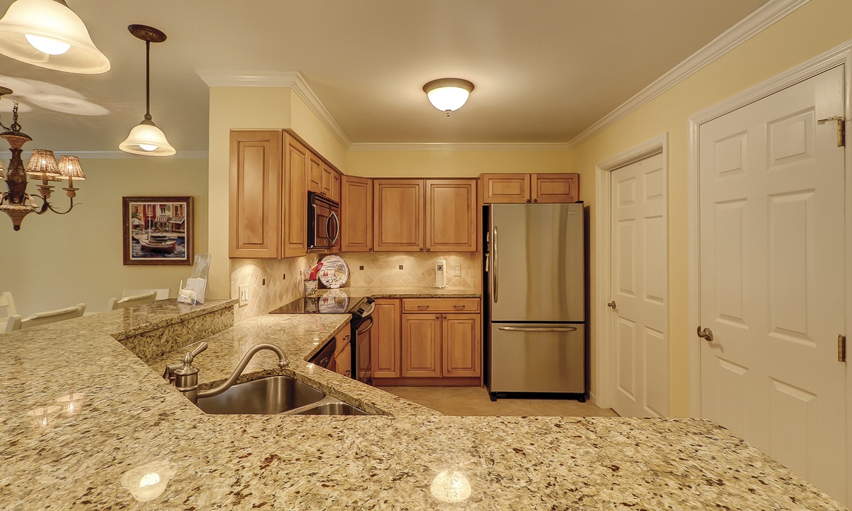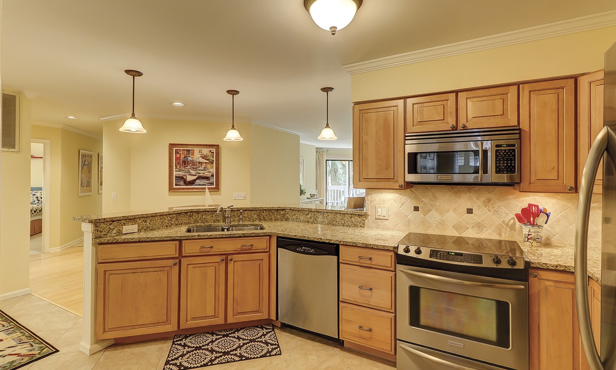 The kitchen features granite counters, stainless appliances and a tiled backsplash. Equipped with all you’ll need to prepare a meal for your family, this kitchen will make dining in your preferred option!