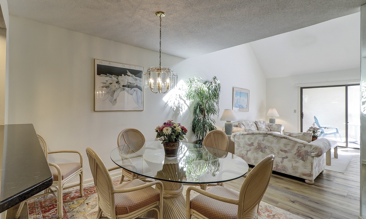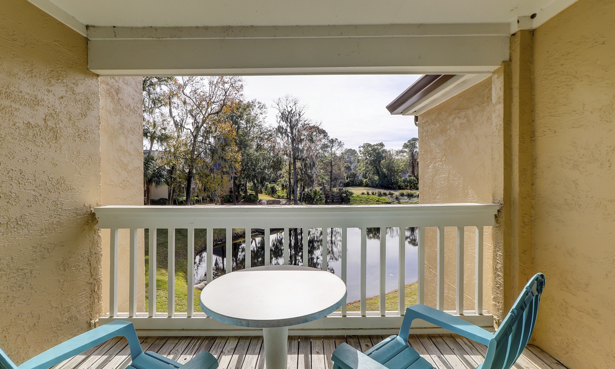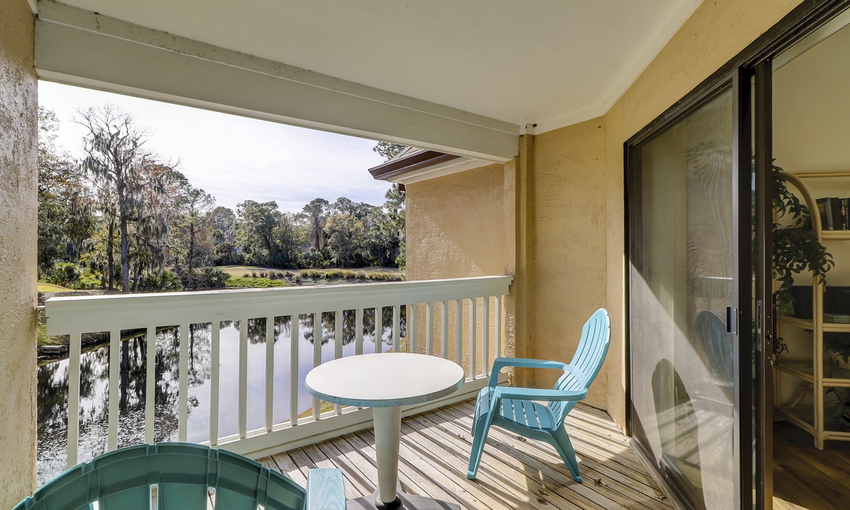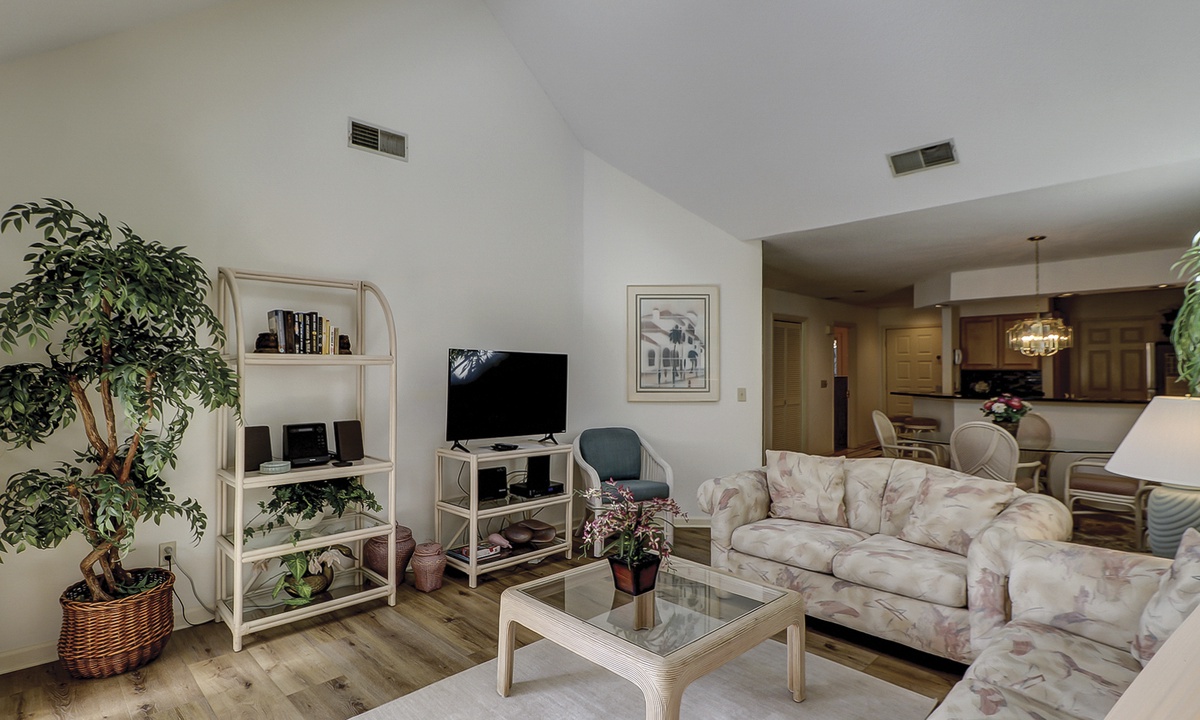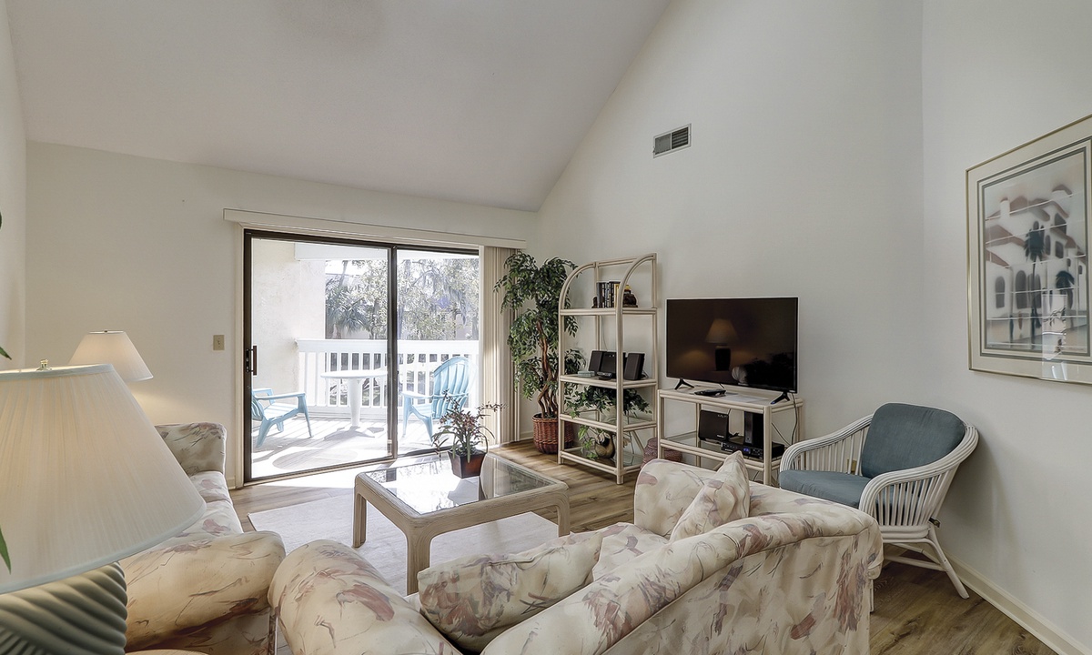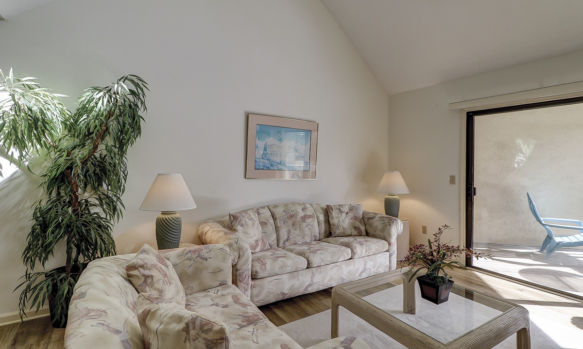 The adjacent living room features comfortable seating, an entertainment center with a TV and DVD player for your indoor entertainment and a private balcony to relax and enjoy the Hilton Head Island outdoor lifestyle.