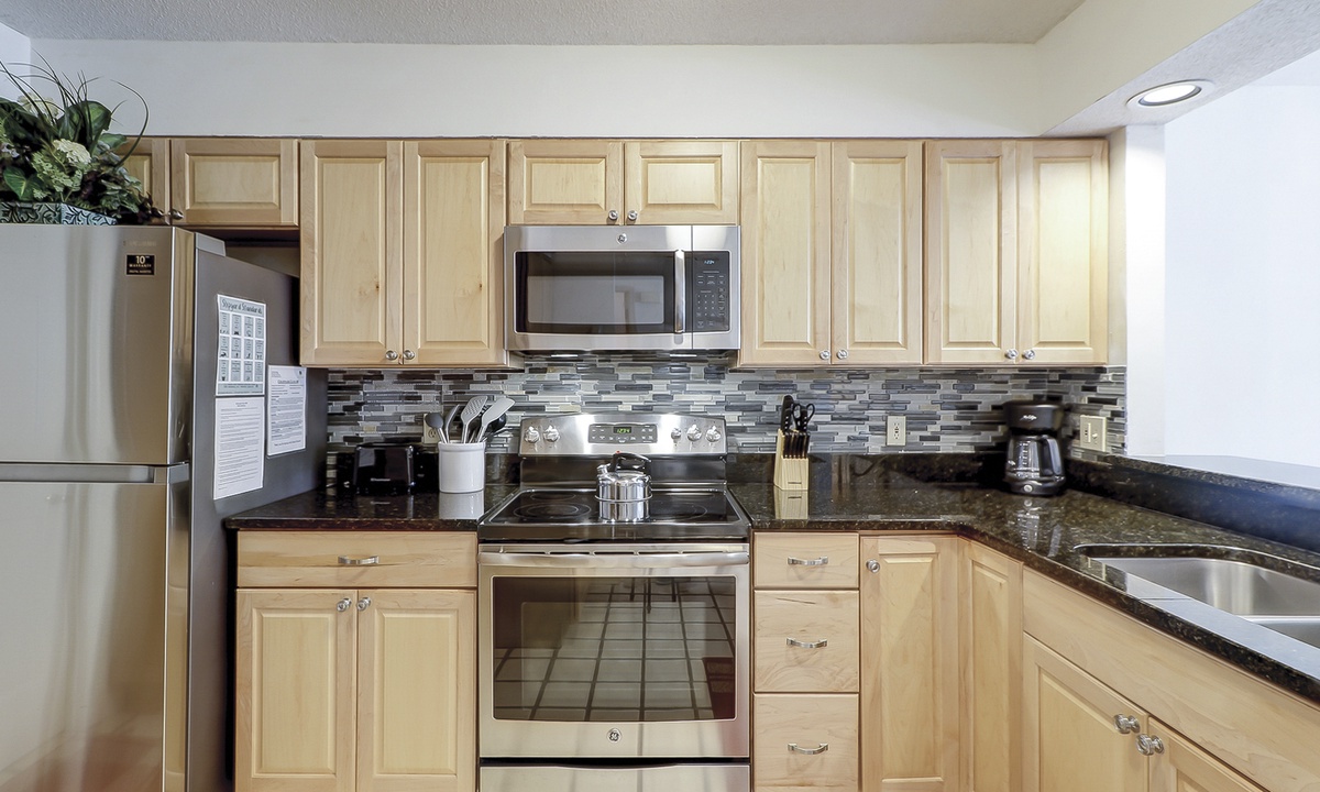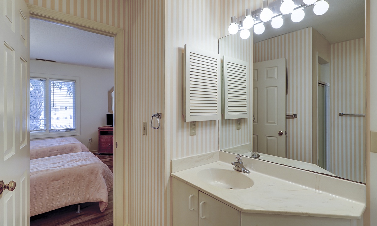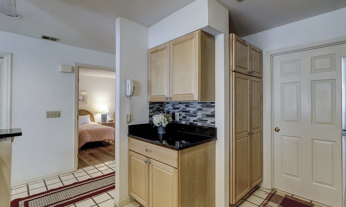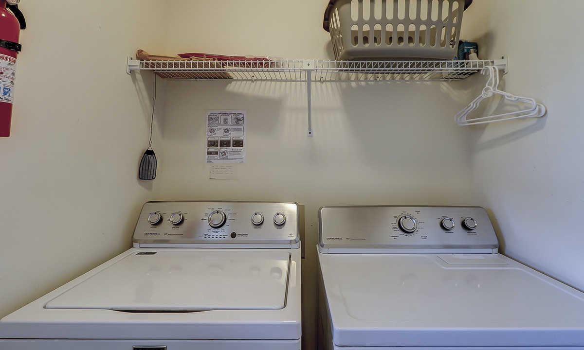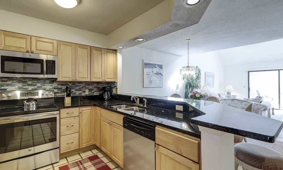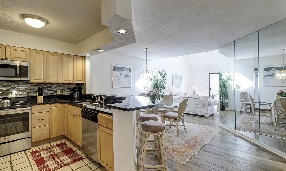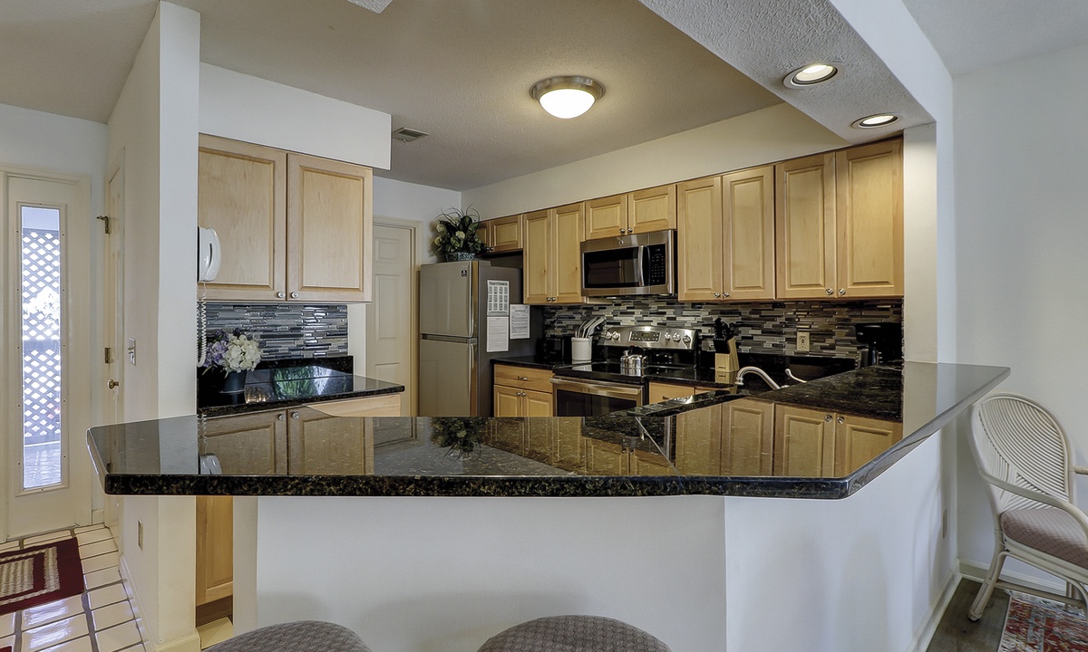 To the right of the entry foyer is a bedroom with 2 twin beds, a TV and a connecting door to the hall bathroom. On the left of the foyer is the fully equipped kitchen. Just off the kitchen you will find the laundry room containing a full-size washer and dryer. In addition, the kitchen has a convenient dining/serving counter with 2 barstools that is open to the formal dining area, where there is a table with seating for 6.