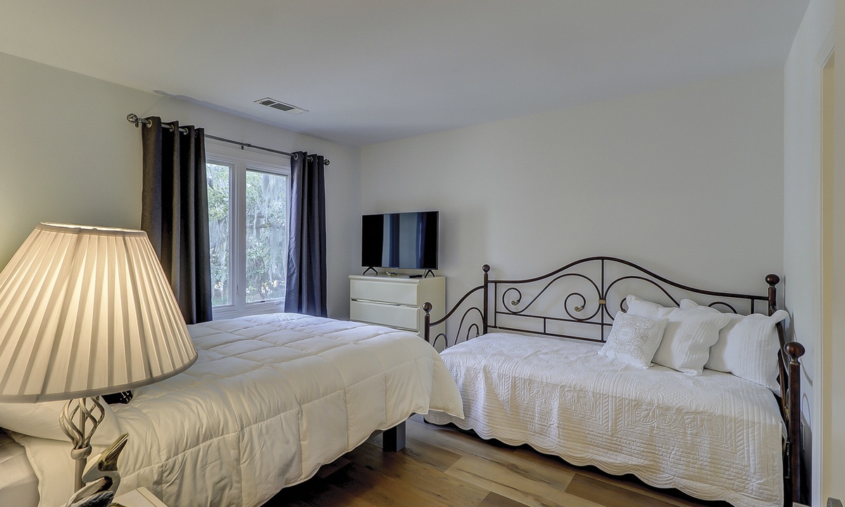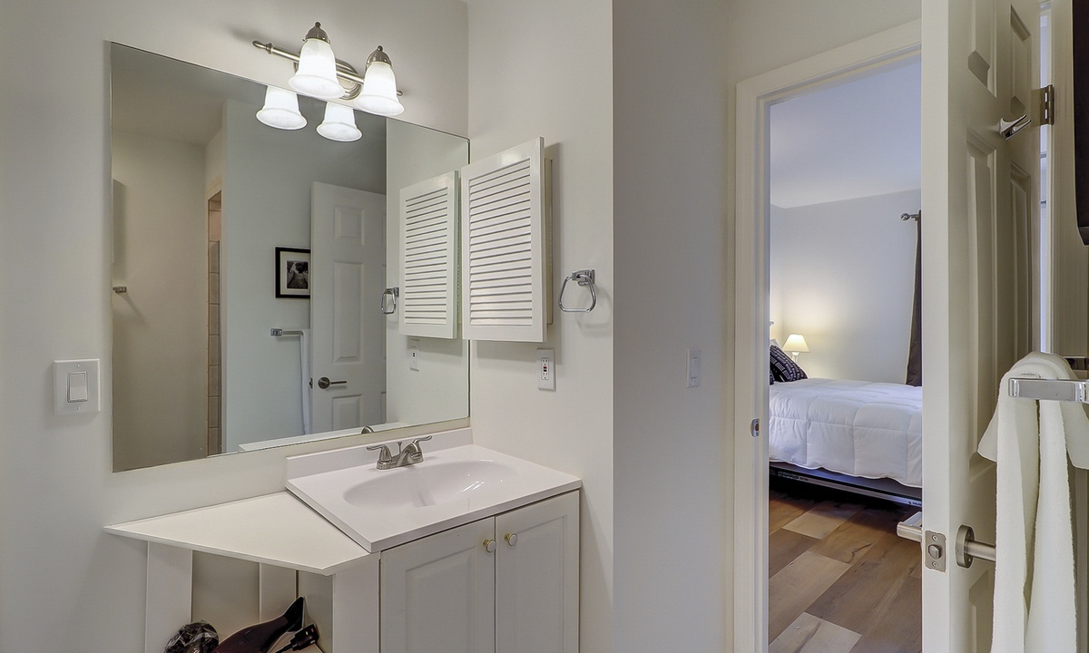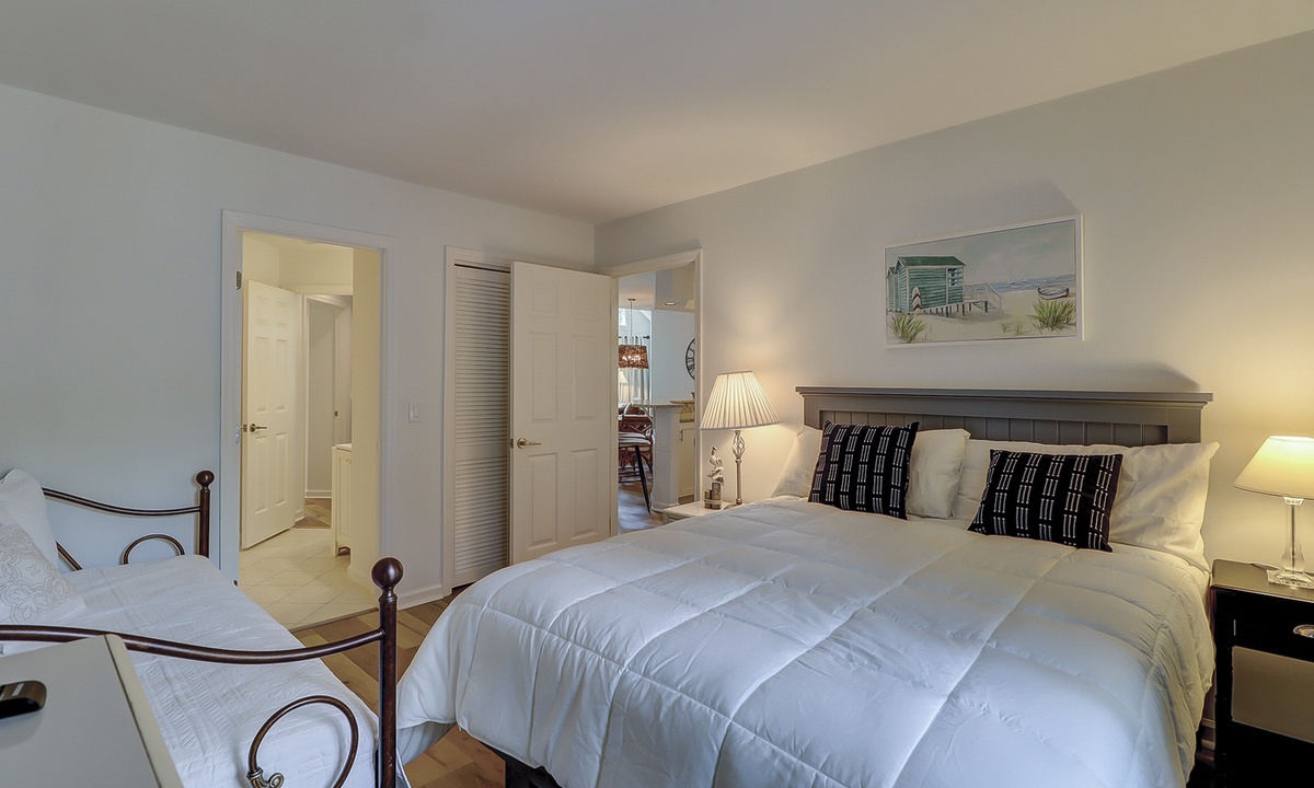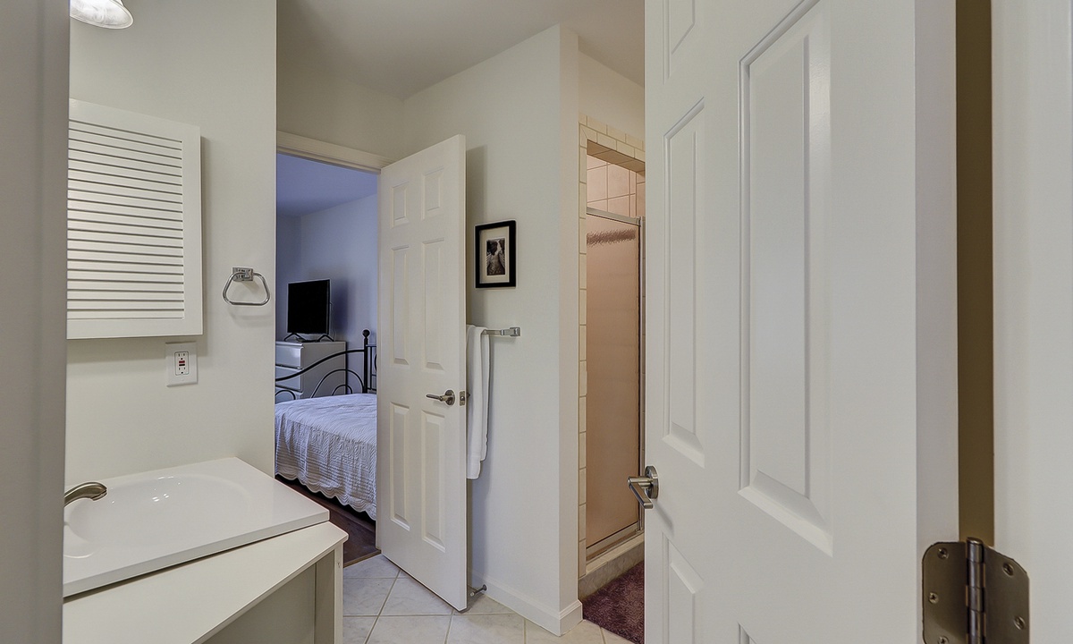 The guest bedroom features a queen bed, as well as a day bed, and a flat screen TV. You can enter the bathroom from the hall or guest bedroom, and it has tiled walk-in shower.