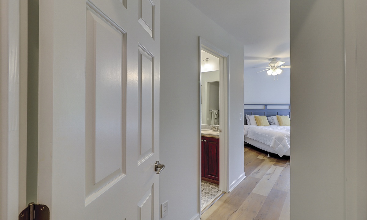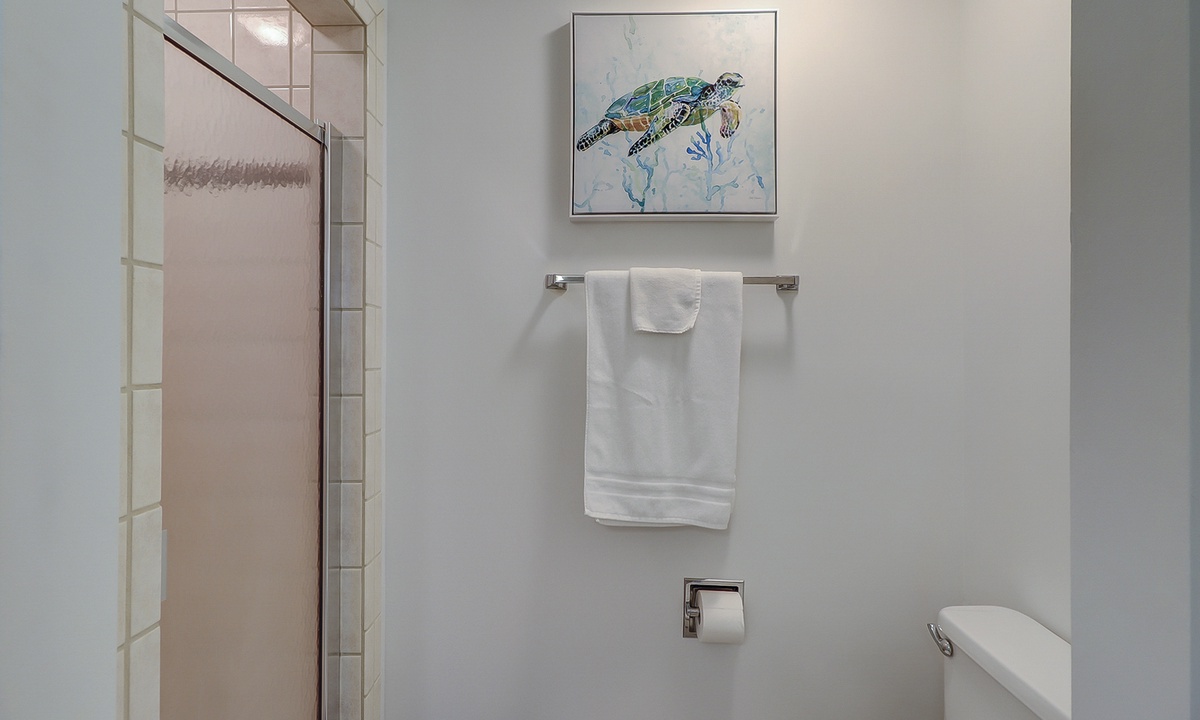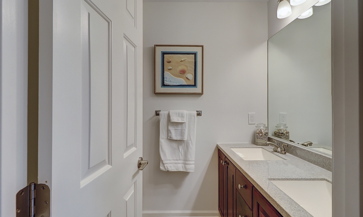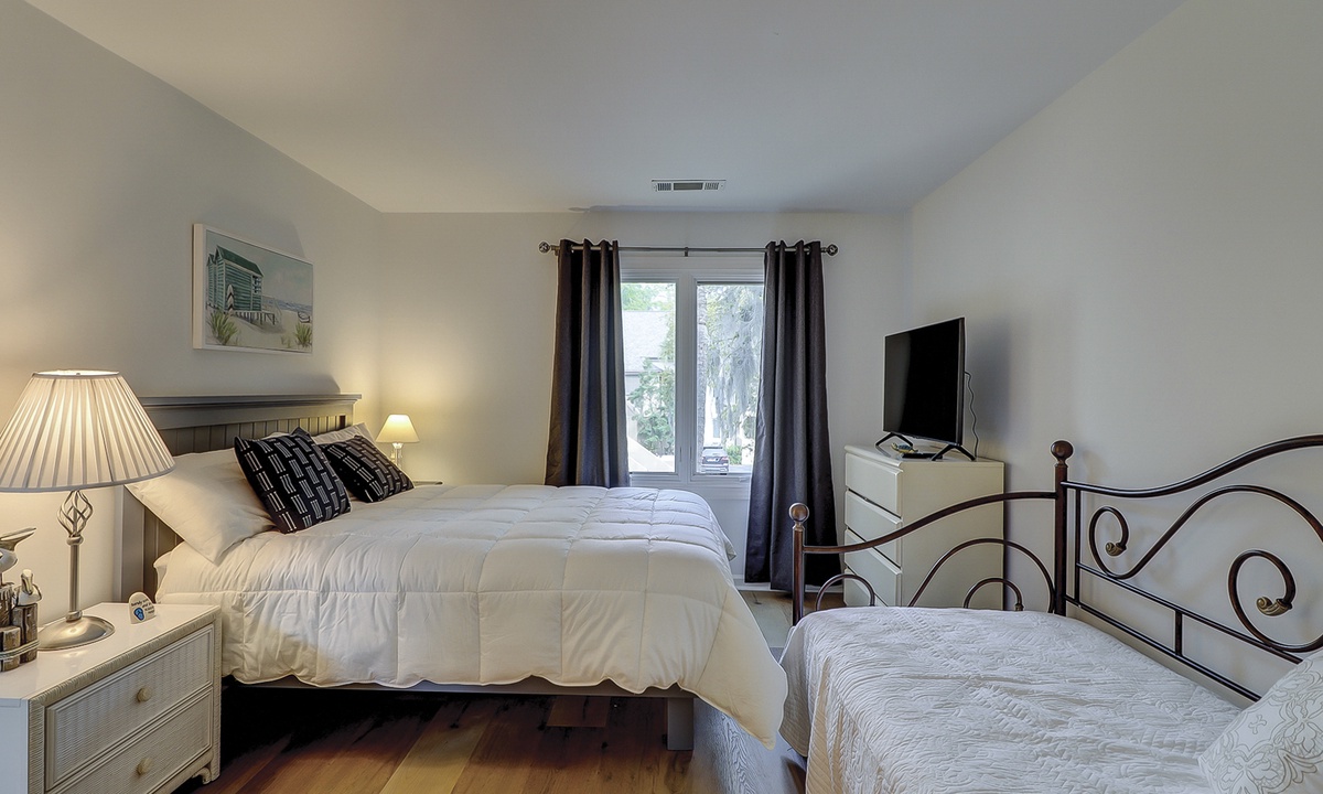 The guest bedroom features a queen bed, as well as a day bed, and a flat screen TV. You can enter the bathroom from the hall or guest bedroom, and it has tiled walk-in shower.