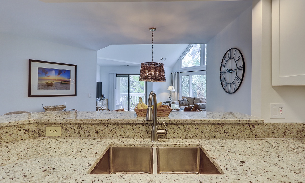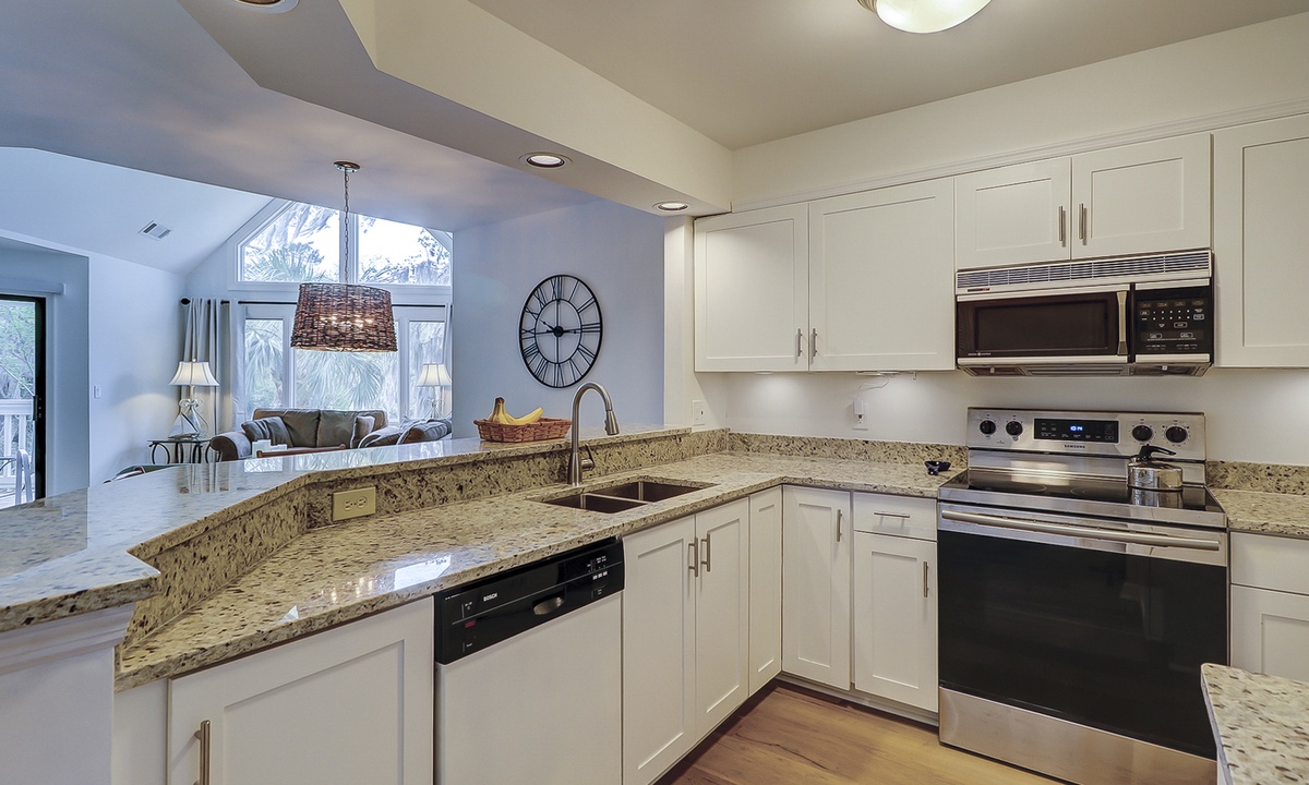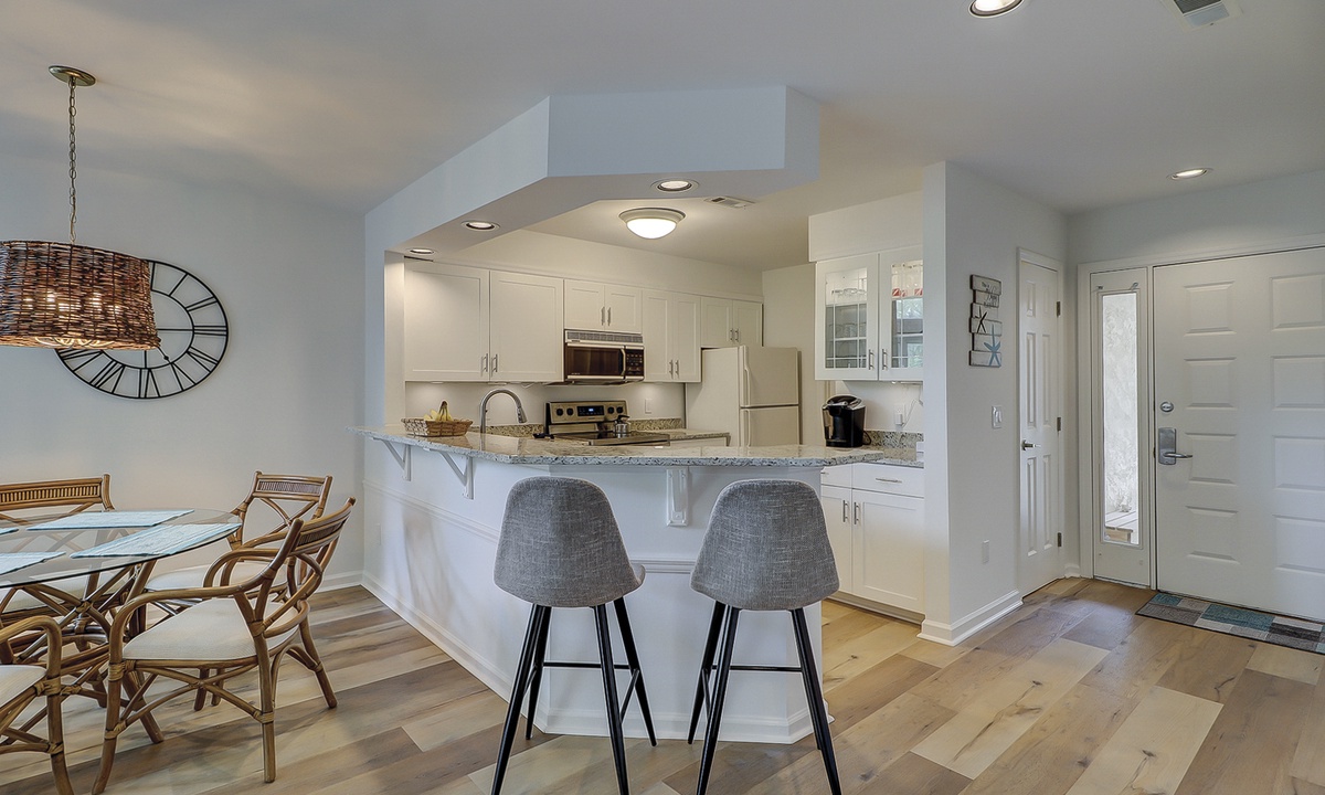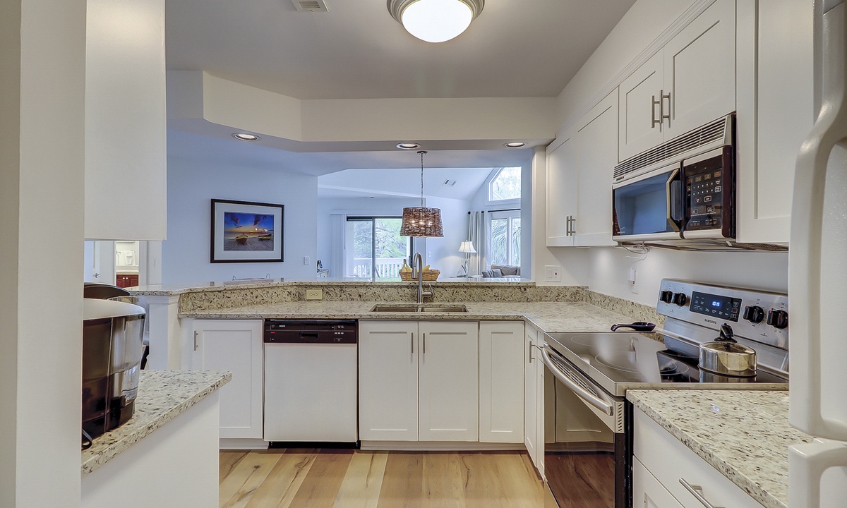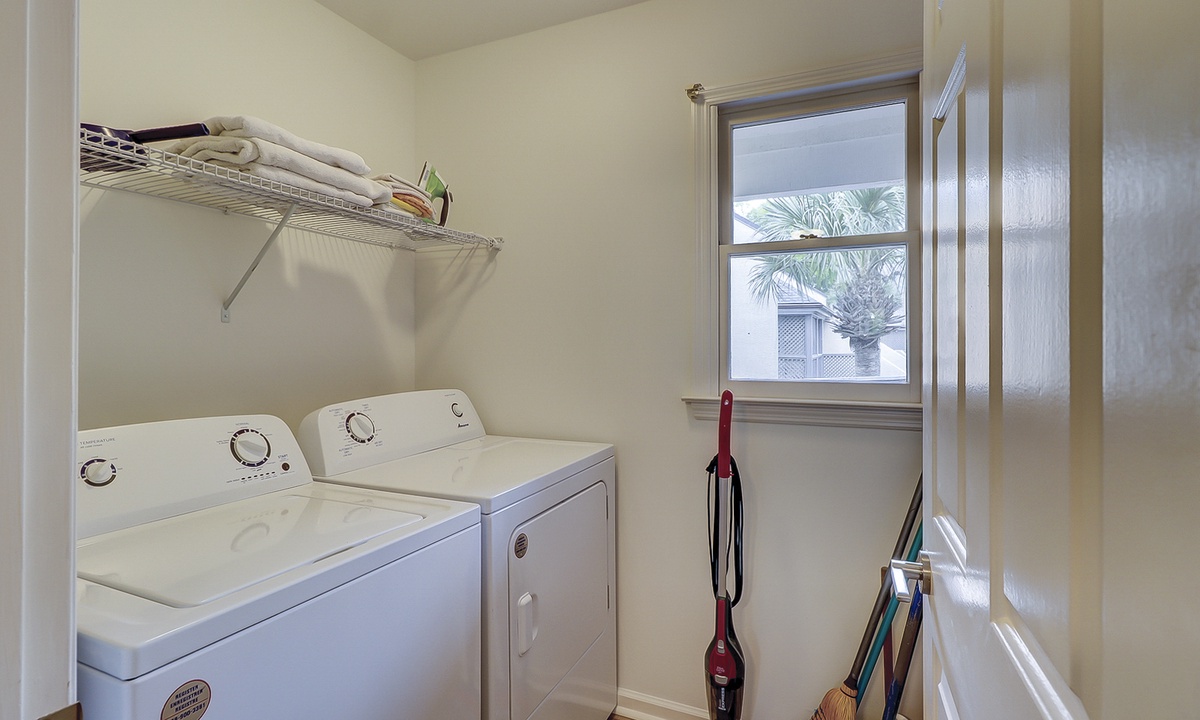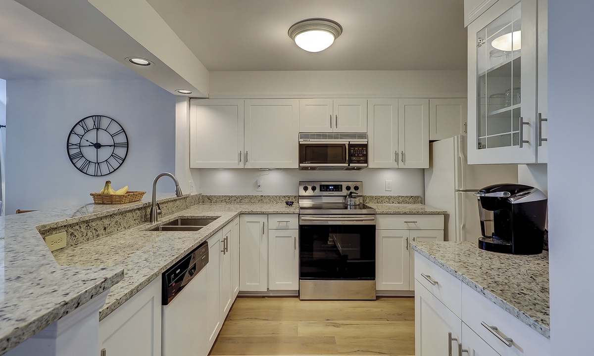 The spacious kitchen features granite counters, a Keurig coffee maker and plenty of supplies to cook a meal for your guests. The separate laundry room is located just off the kitchen as well.