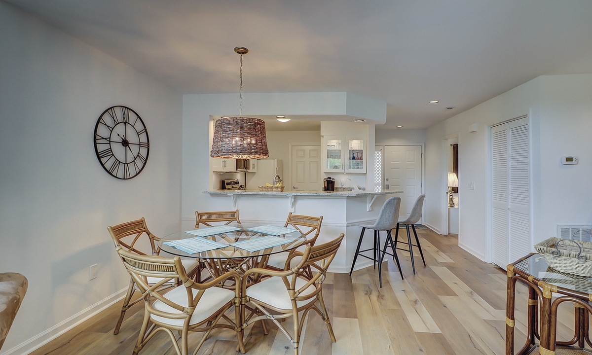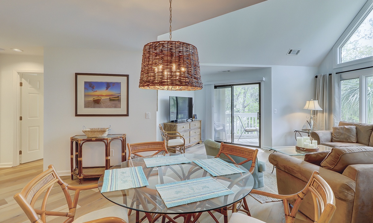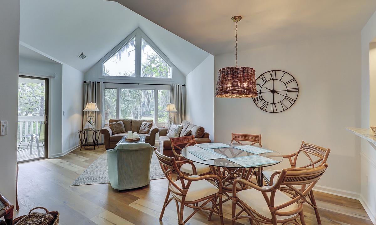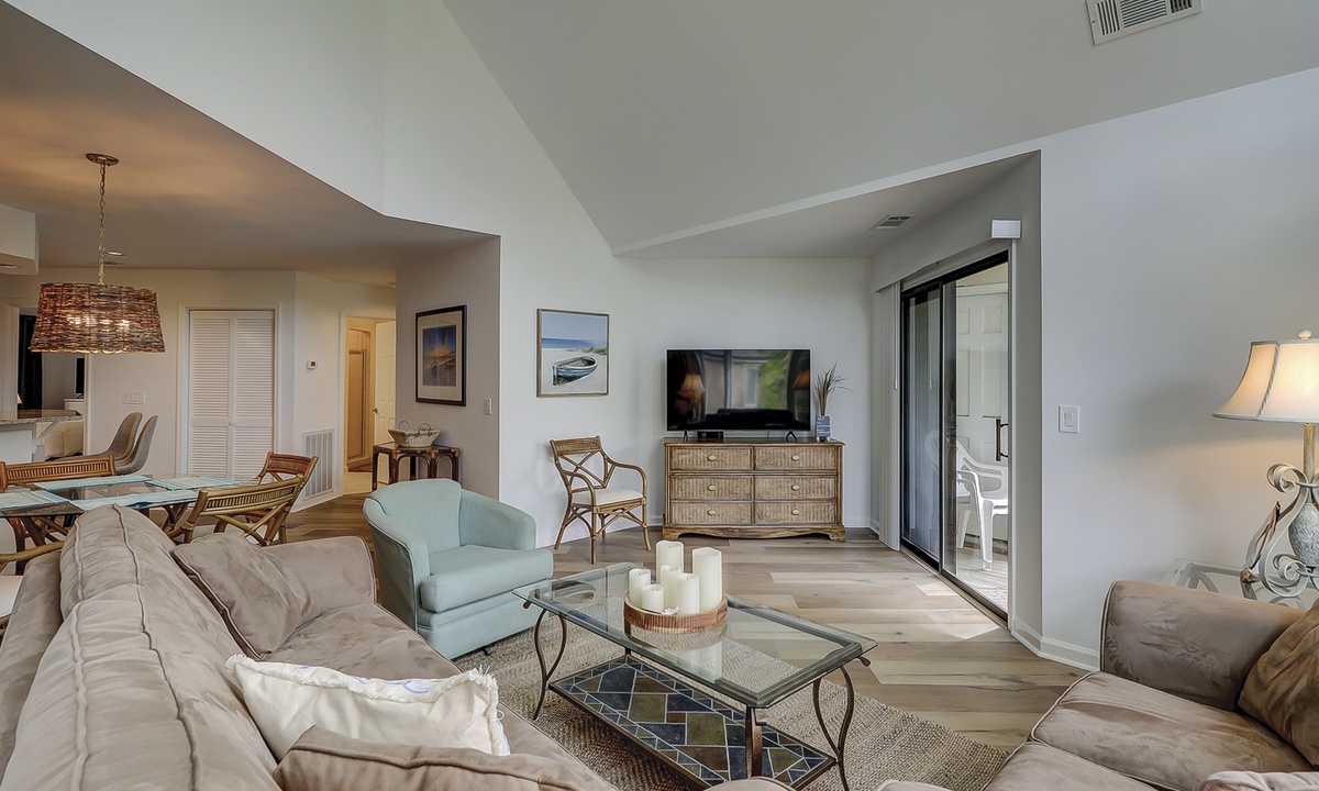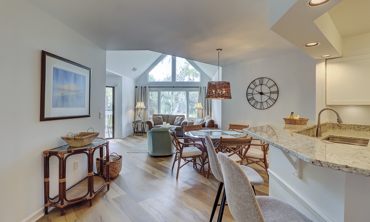 The open-concept floor plan features a living area with a queen sleeper sofa, large Smart TV and access to the private balcony overlooking the lagoon and golf course. The dining area seats 5 comfortably with additional seating for 2 at the kitchen bar.