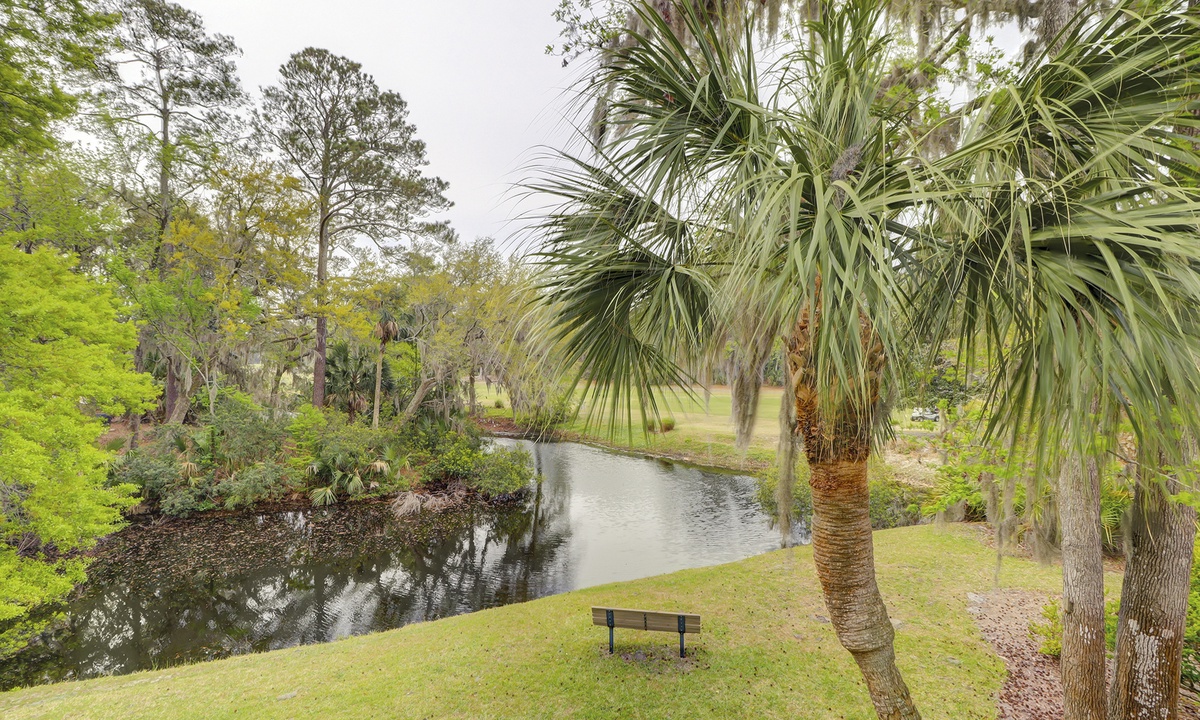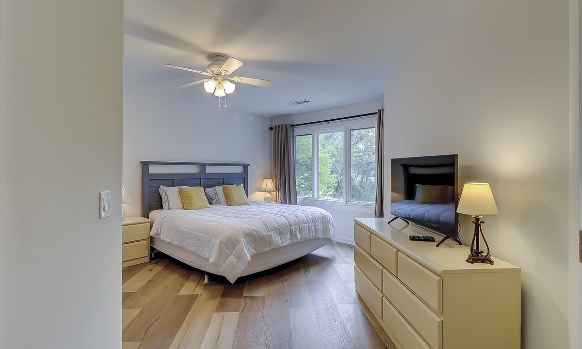 The main bedroom features a king bed, flat screen TV and views of the lagoon and golf course. The private bathroom has an updated vanity area with a tub/shower combination.