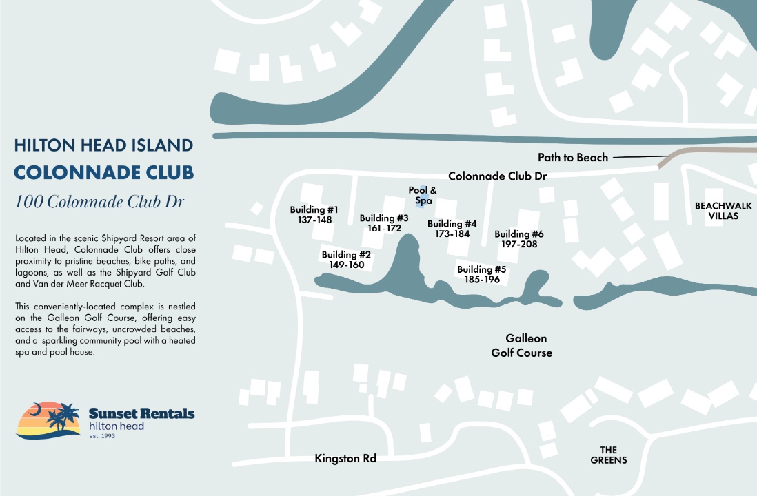 Explore an array of Colonnade Club rentals - a wonderful vacation destination within Shipyard. This complex is close to the beach with an on-site pool (open April 15th through September), pool house, heated spa and community BBQ grills. Please note Colonnade Club is not equipped with elevators and use of stairs is required. All beach distances are measured from the center of the complex.