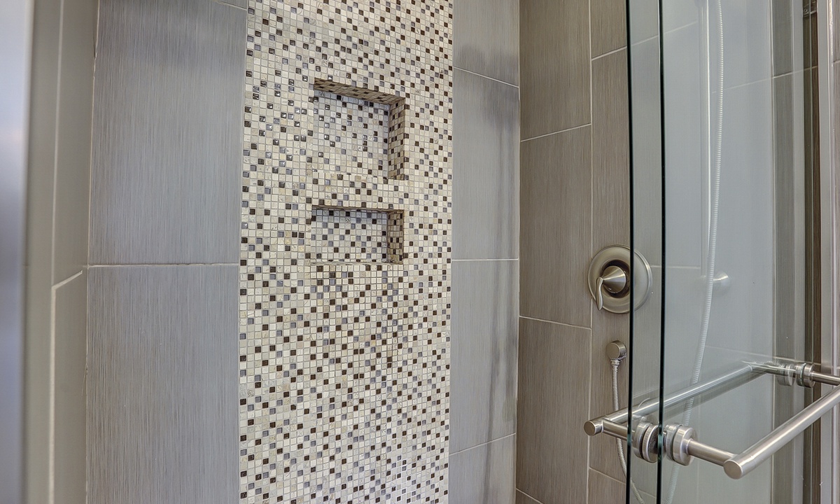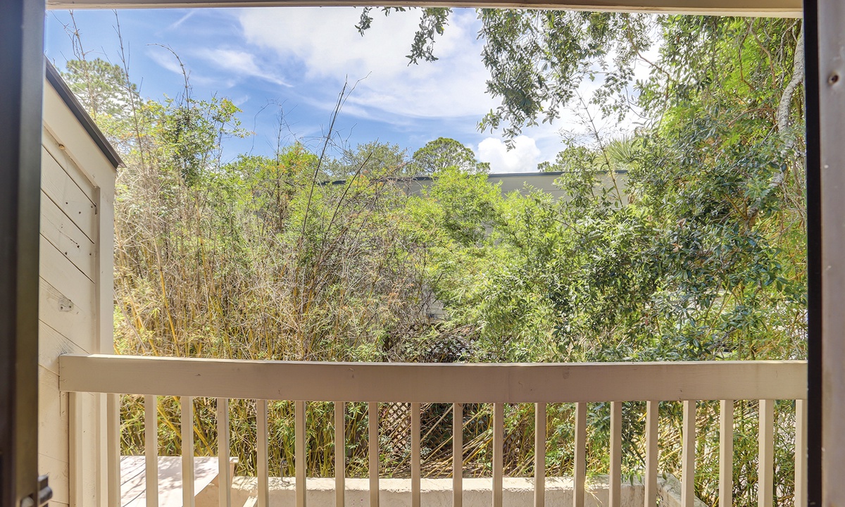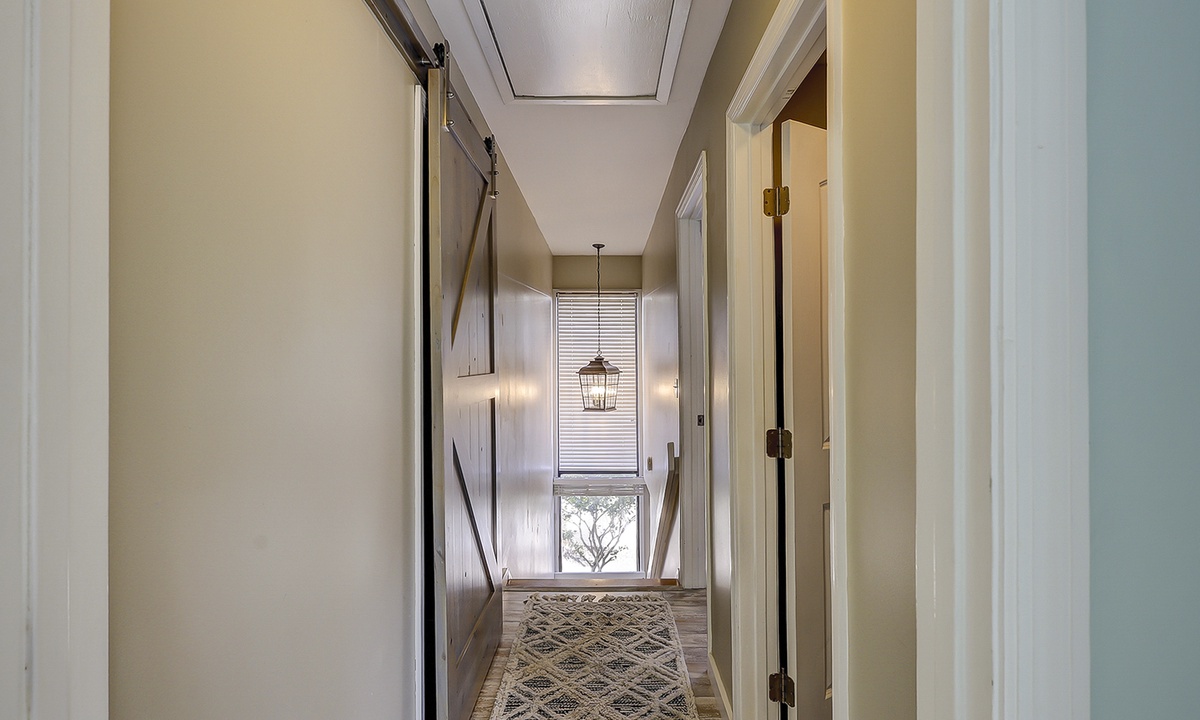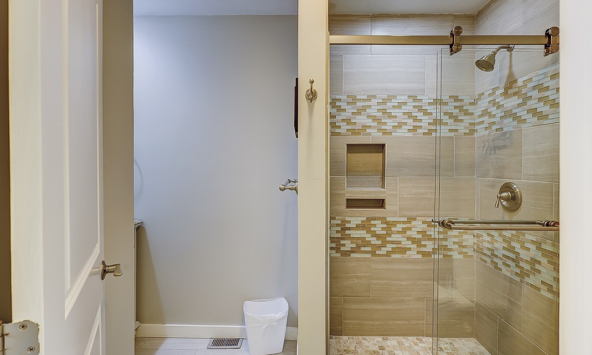 Up the stairs, you'll find 2 guest rooms. The first has a king bed, a private balcony overlooking the patio area, Smart TV and a private bathroom with a tiled walk-in shower. The second bedroom has a double and a twin bed with access to a private bath with a tiled walk-in shower.