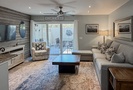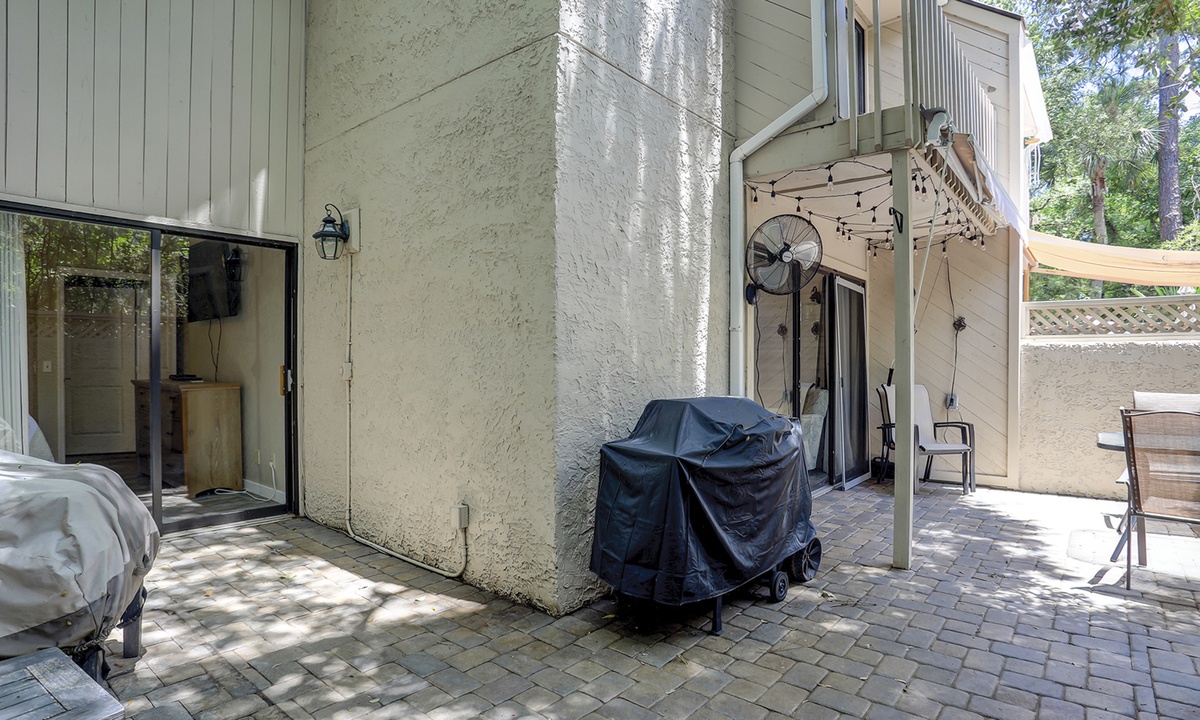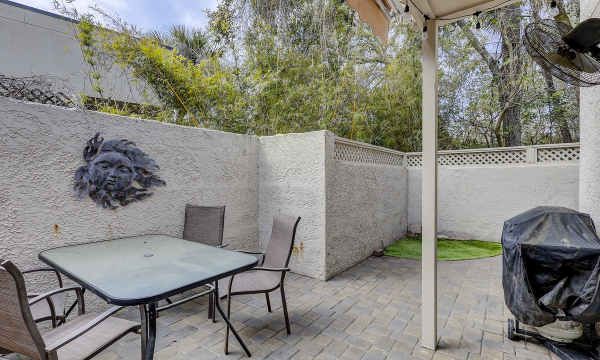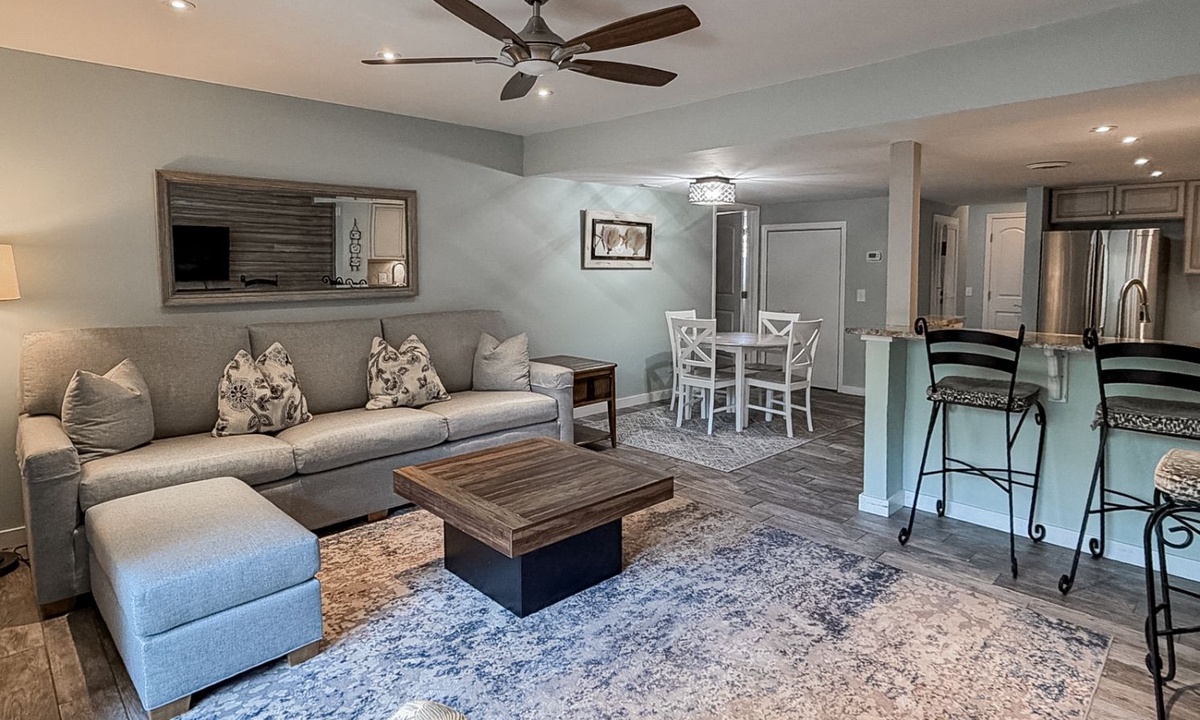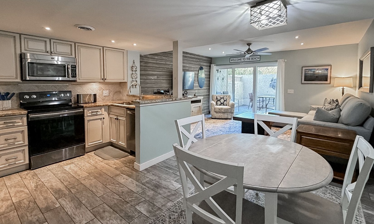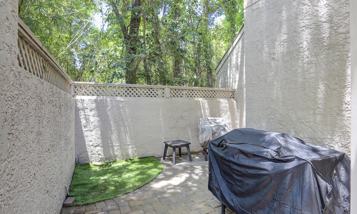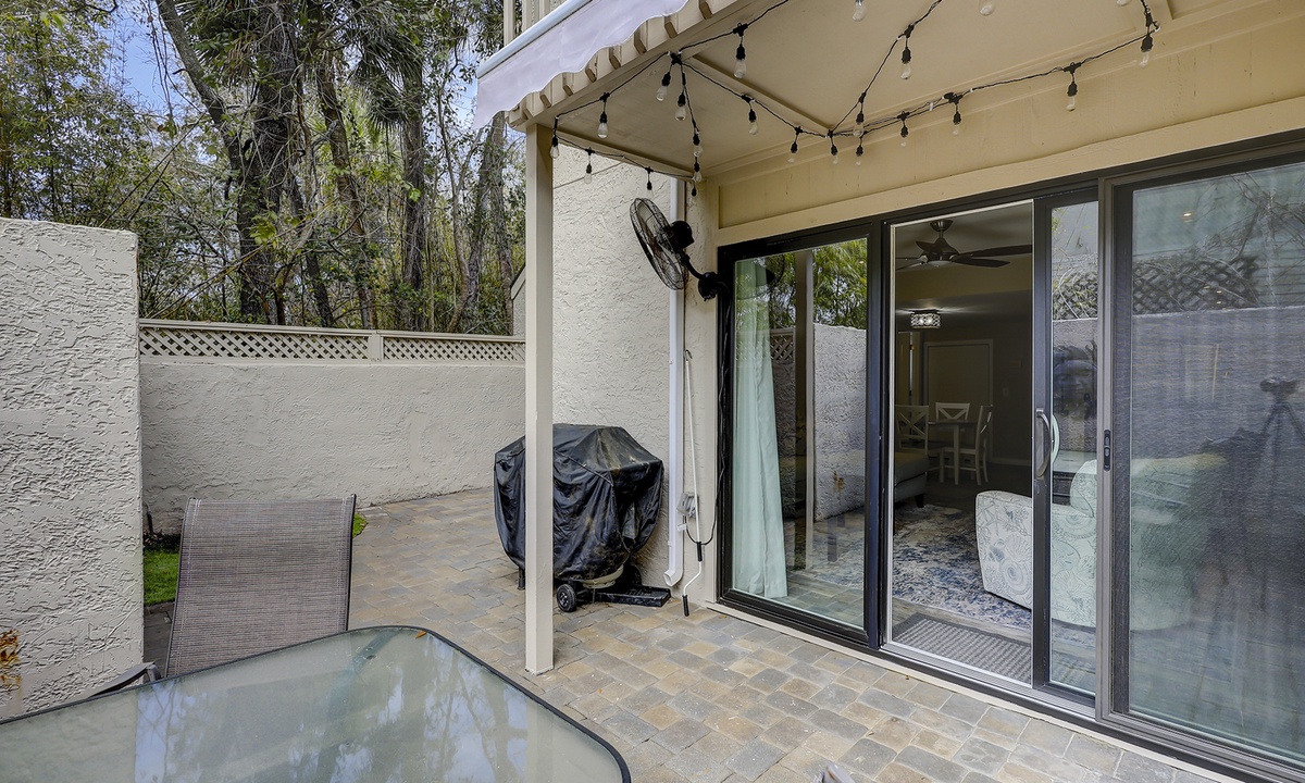 The stair-free 1st level of the property features an open-concept floor plan with a comfortable living area featuring a Smart TV and access to the private patio. This large, well-manicured patio has plenty of seating space and a propane grill.
