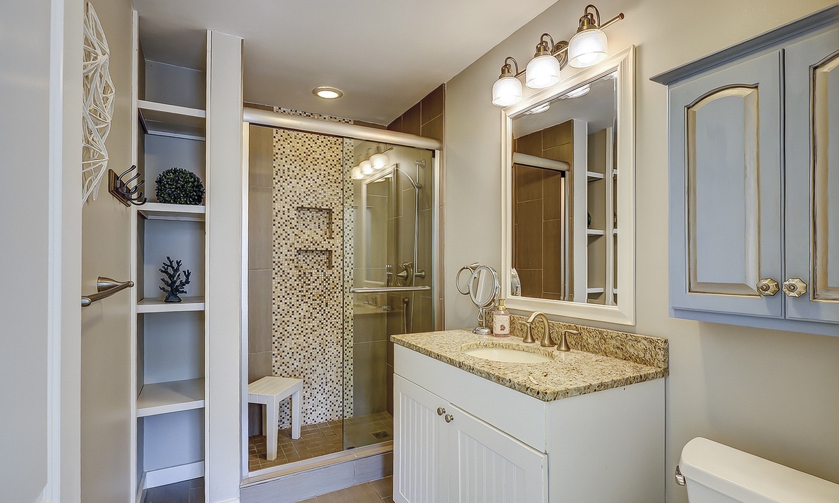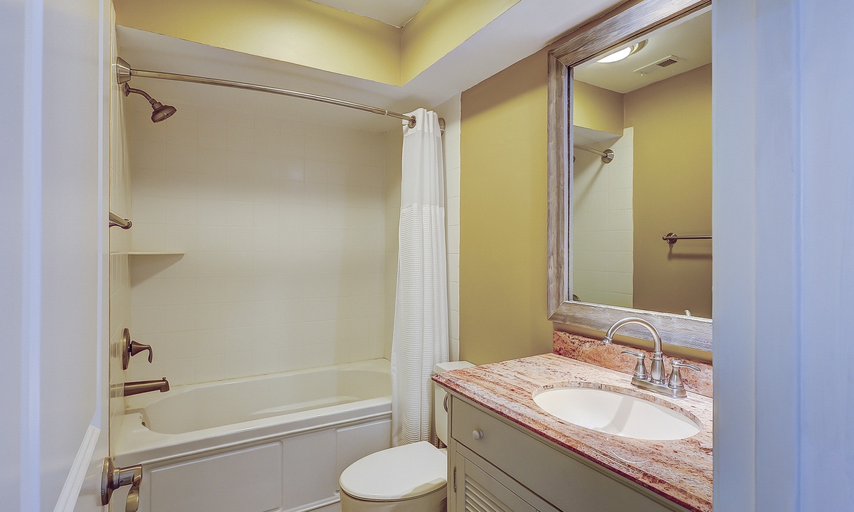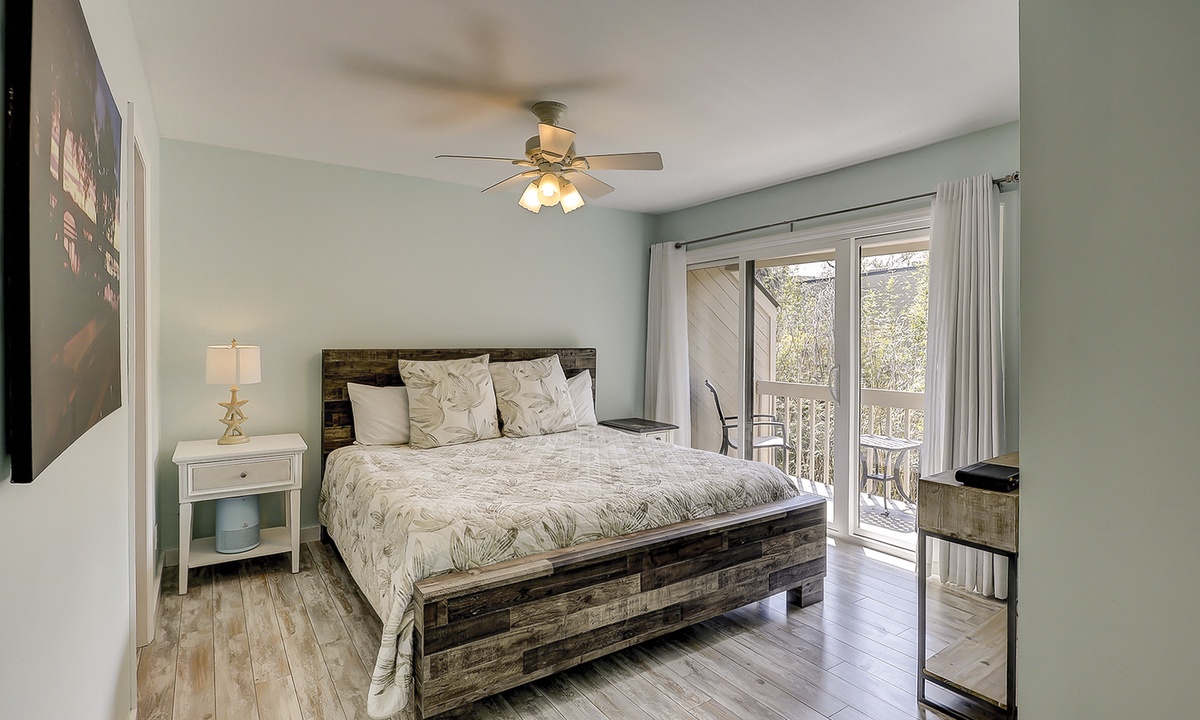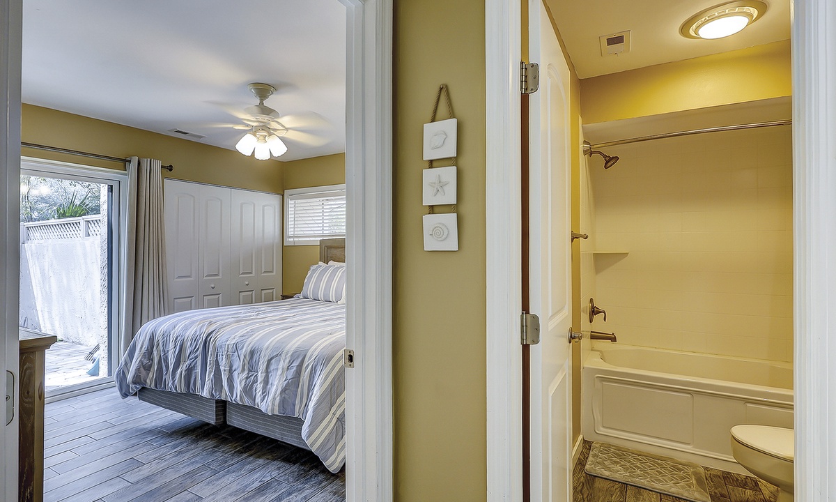 The main bedroom is also on this level. This room features a king bed, Smart TV, access to the private patio and a private bathroom with a tub/shower combination.