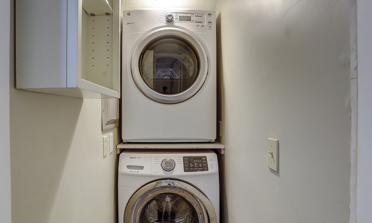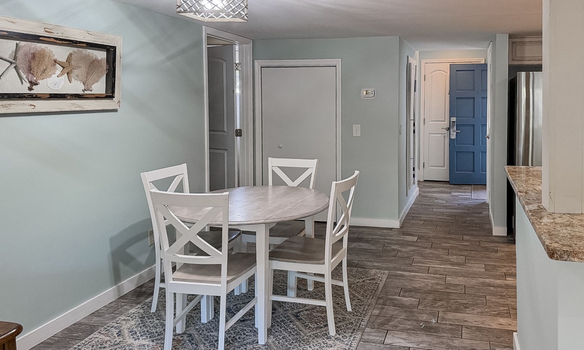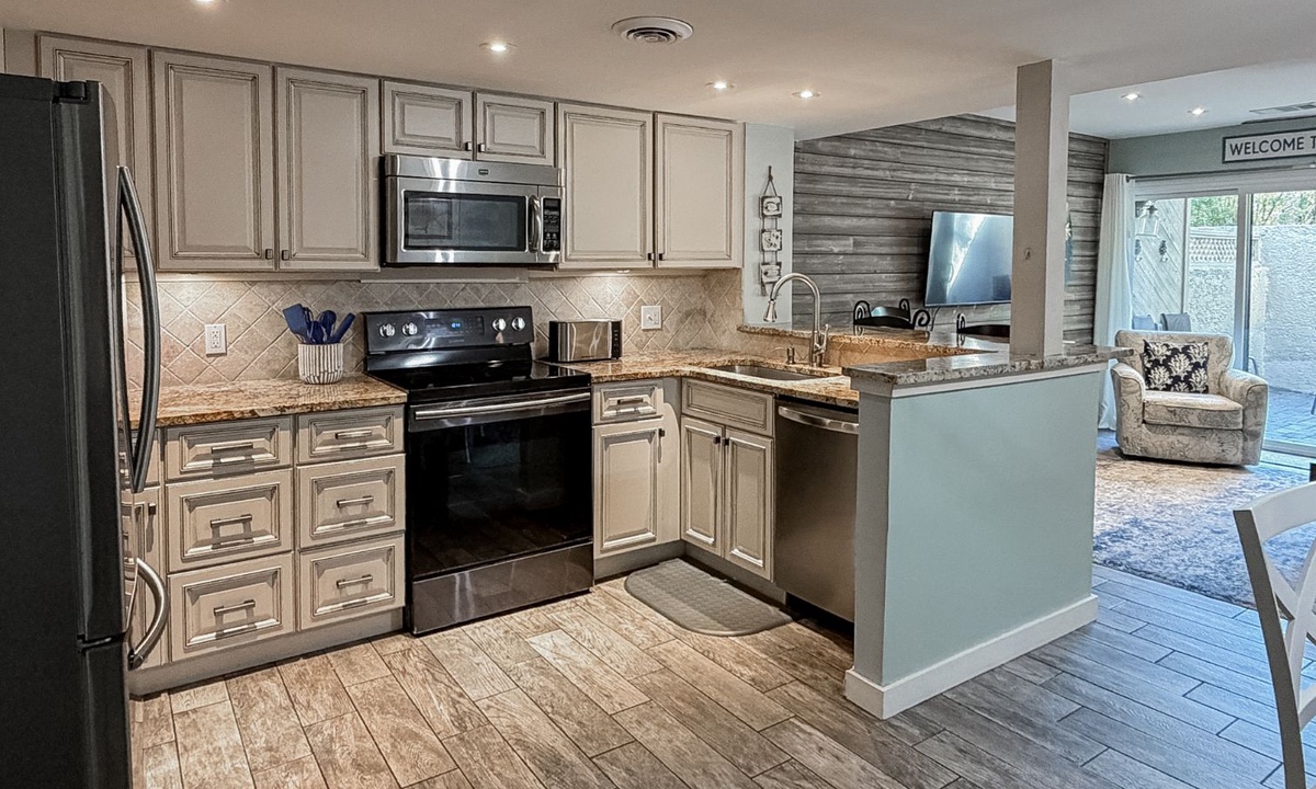 Back inside, you'll find a dining table for 4 with additional seating for 2 at the kitchen bar. The kitchen features granite counters, stainless appliances, custom cabinets and a full-size laundry center.