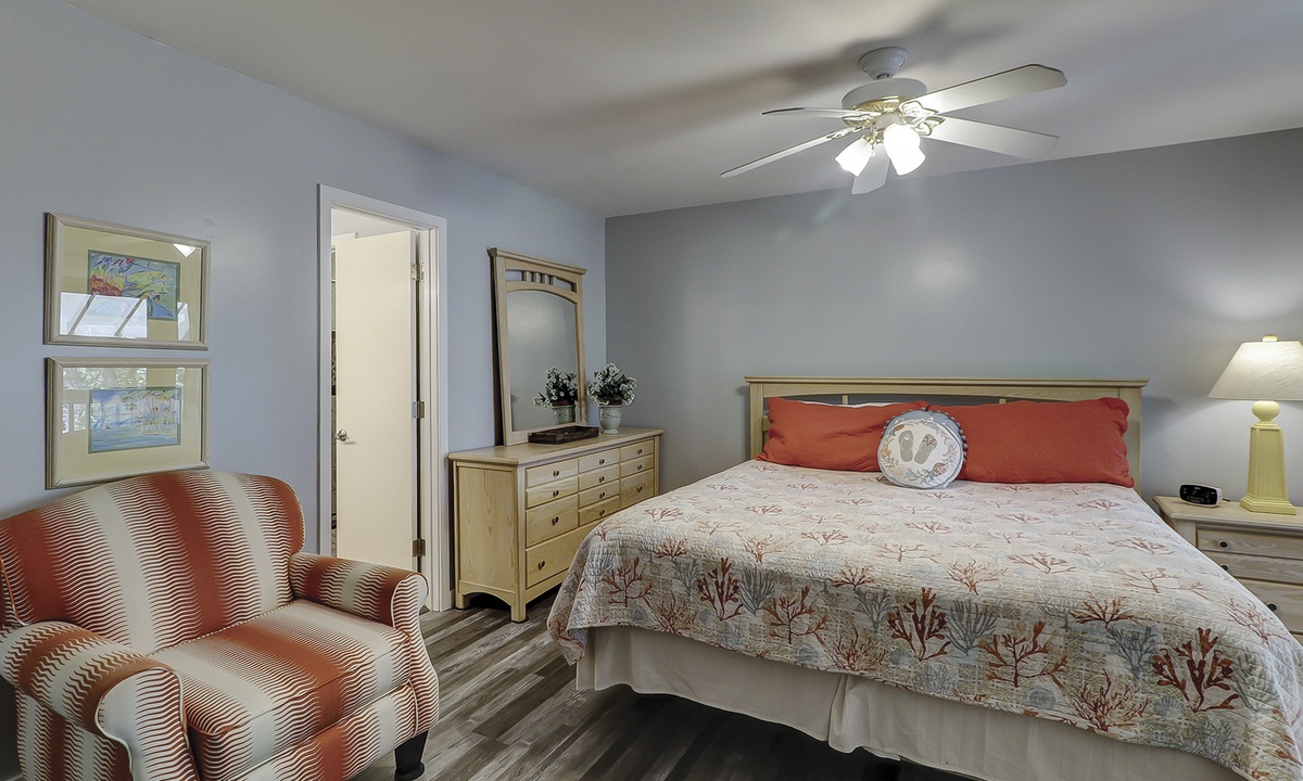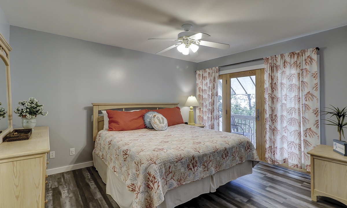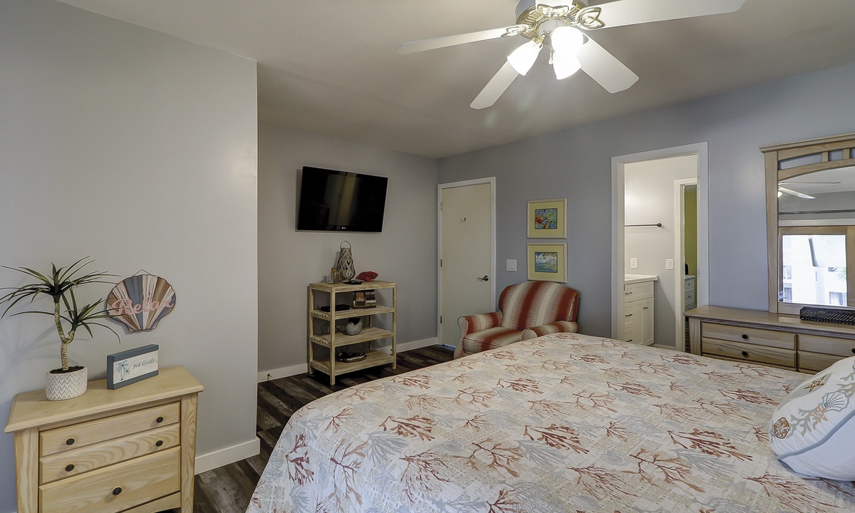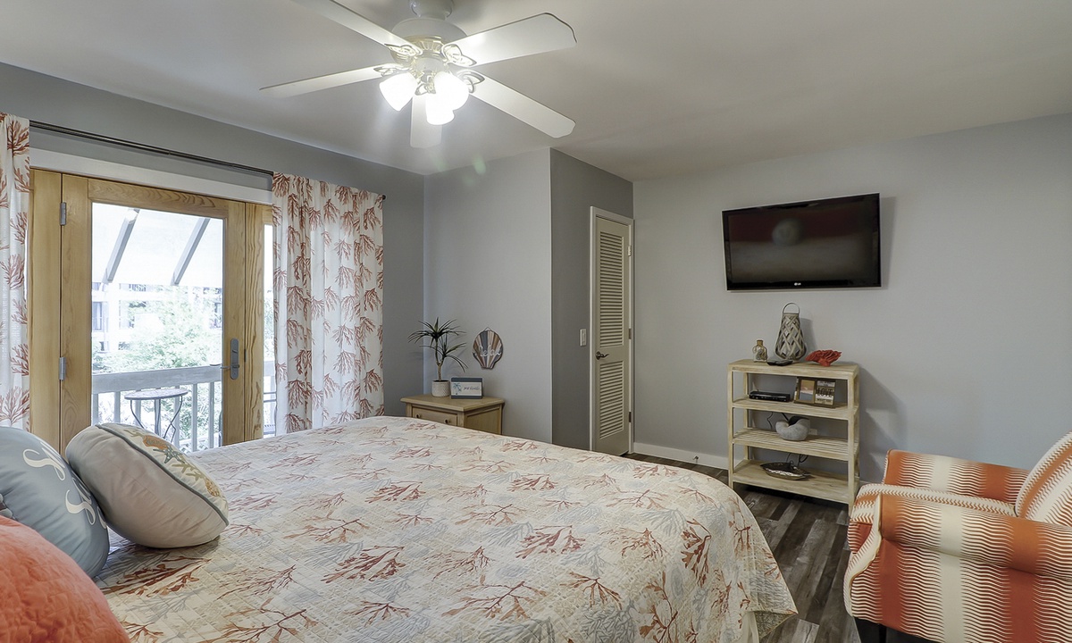 Up the stairs you'll find the main bedroom, complete with a king bed, flat screen TV and a private, covered balcony with seating for 2.
