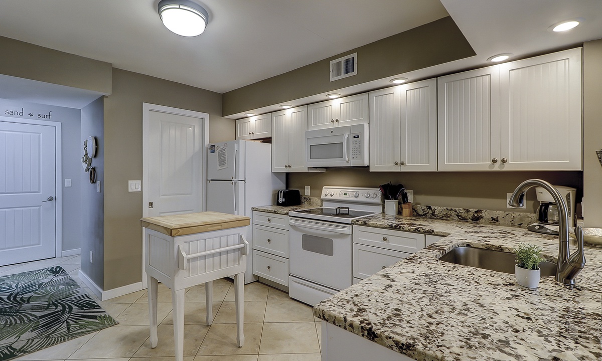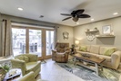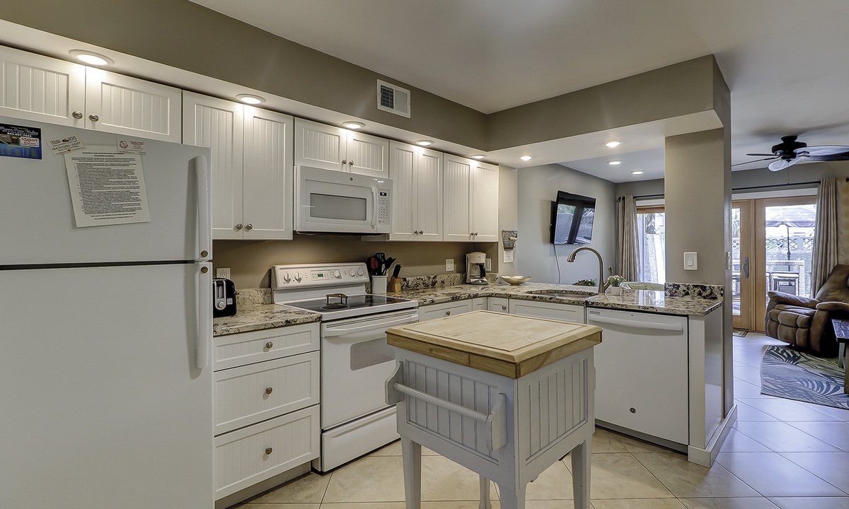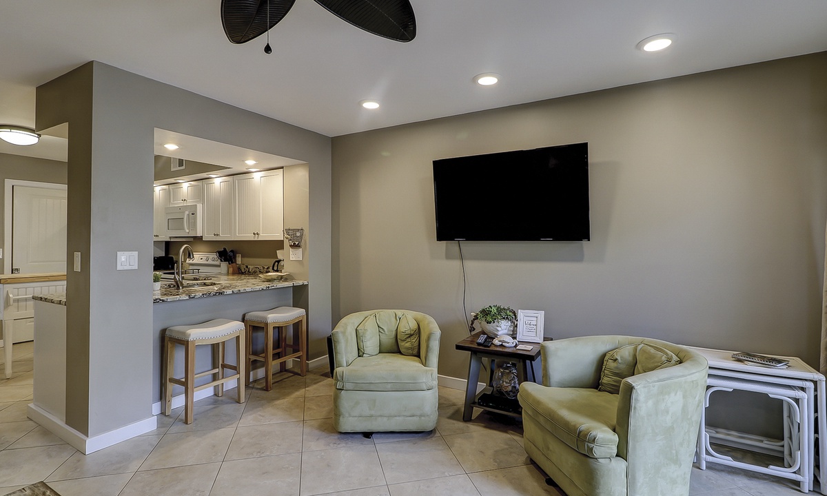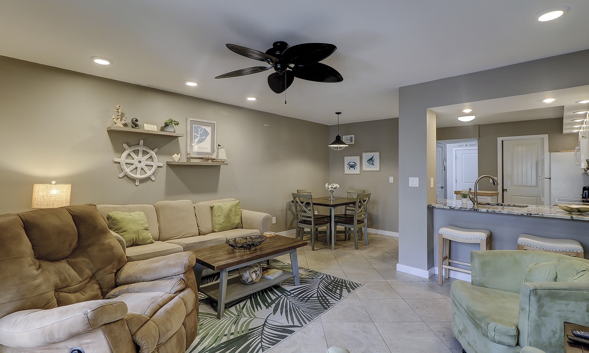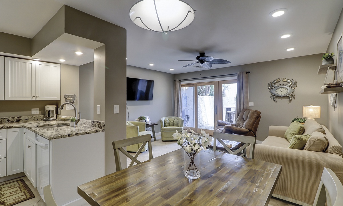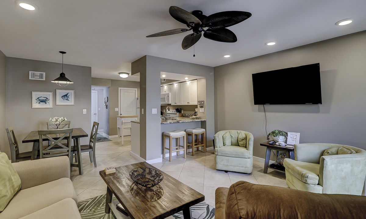 The open floor plan features tiled flooring, a comfortable living area with sleeper sofa and Smart TV, as well as access to the private, enclosed patio. The patio is perfect for outdoor dining and catching some sun!