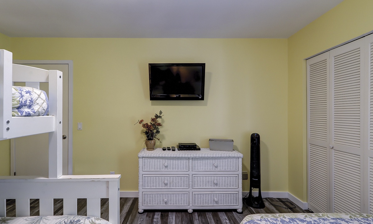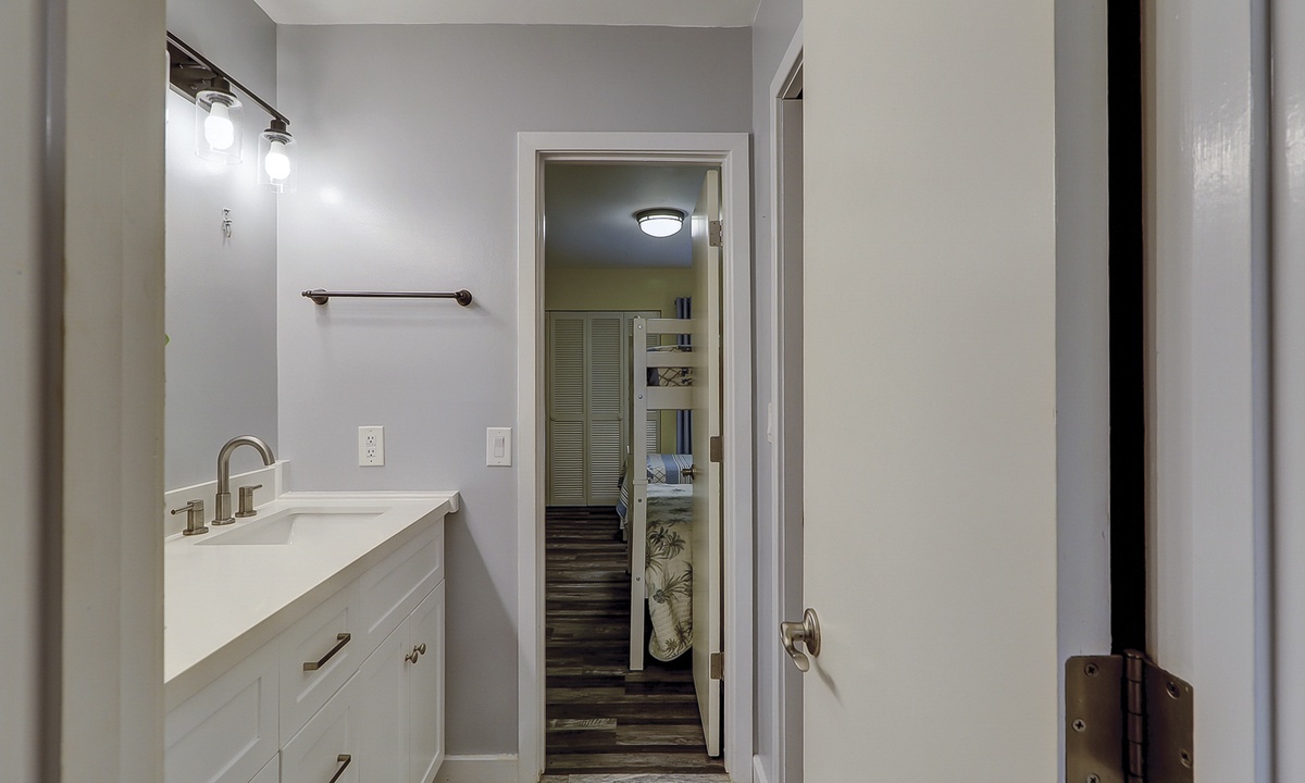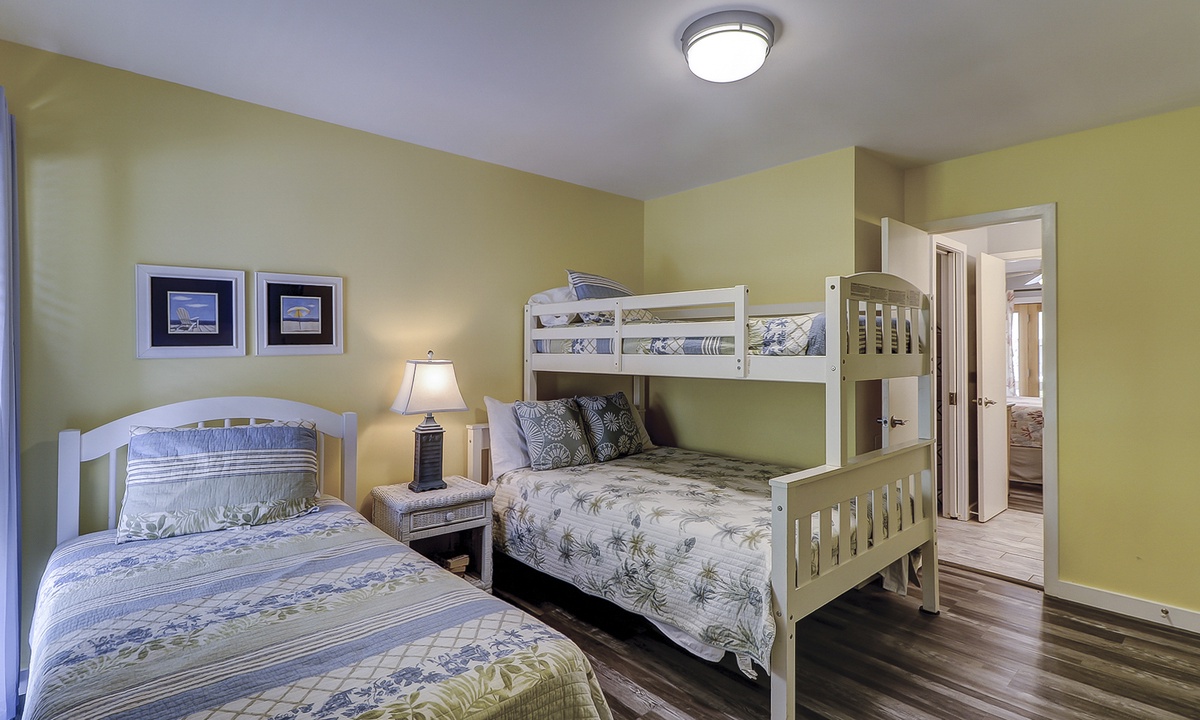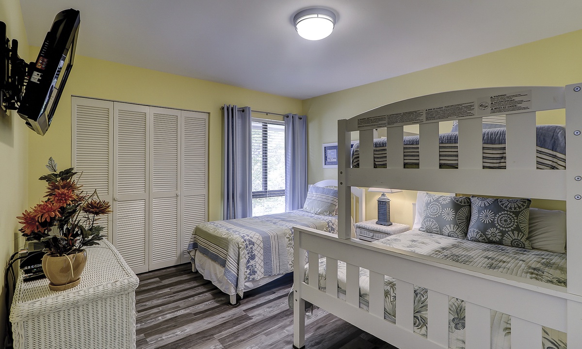 The guest bedroom features a bunk bed with a full size bed on the bottom and a twin on the top, as well as an additional twin bed. This room also has a flat screen TV. Both bedrooms share access to a completely renovated bathroom with dual vanity and large, tiled walk-in shower.