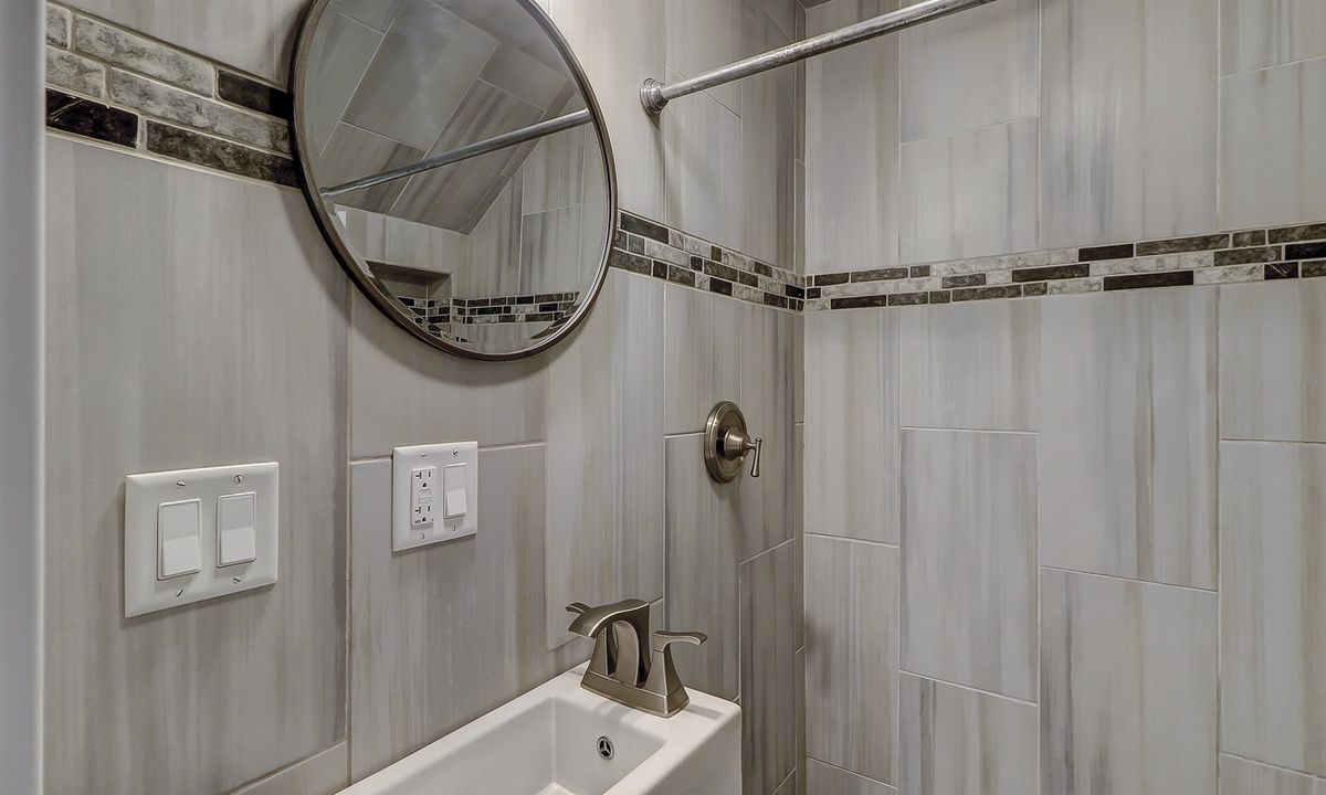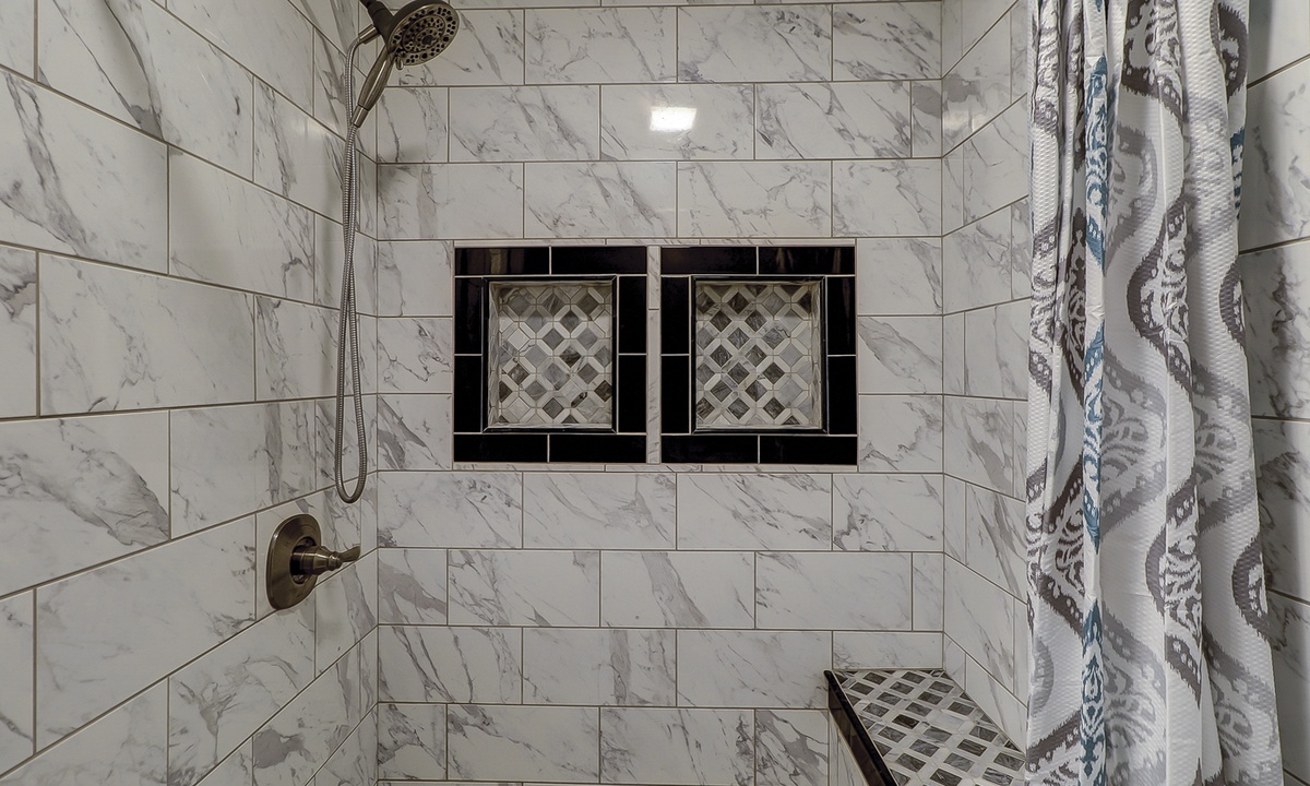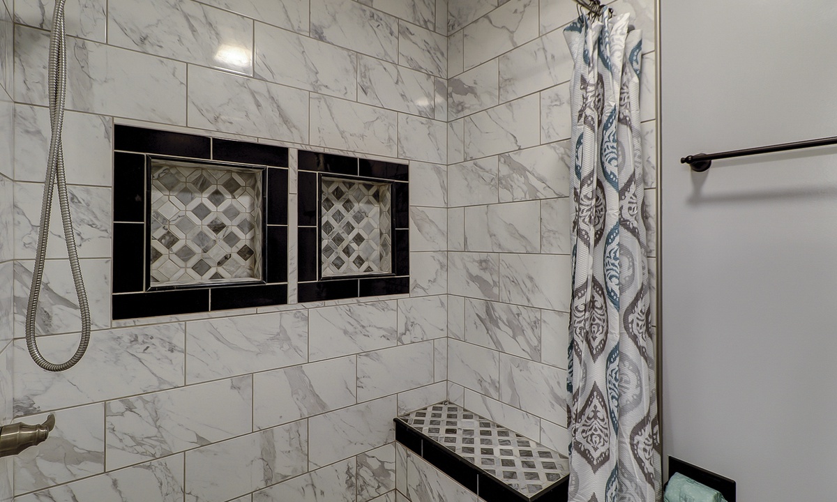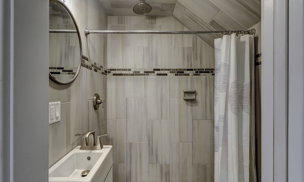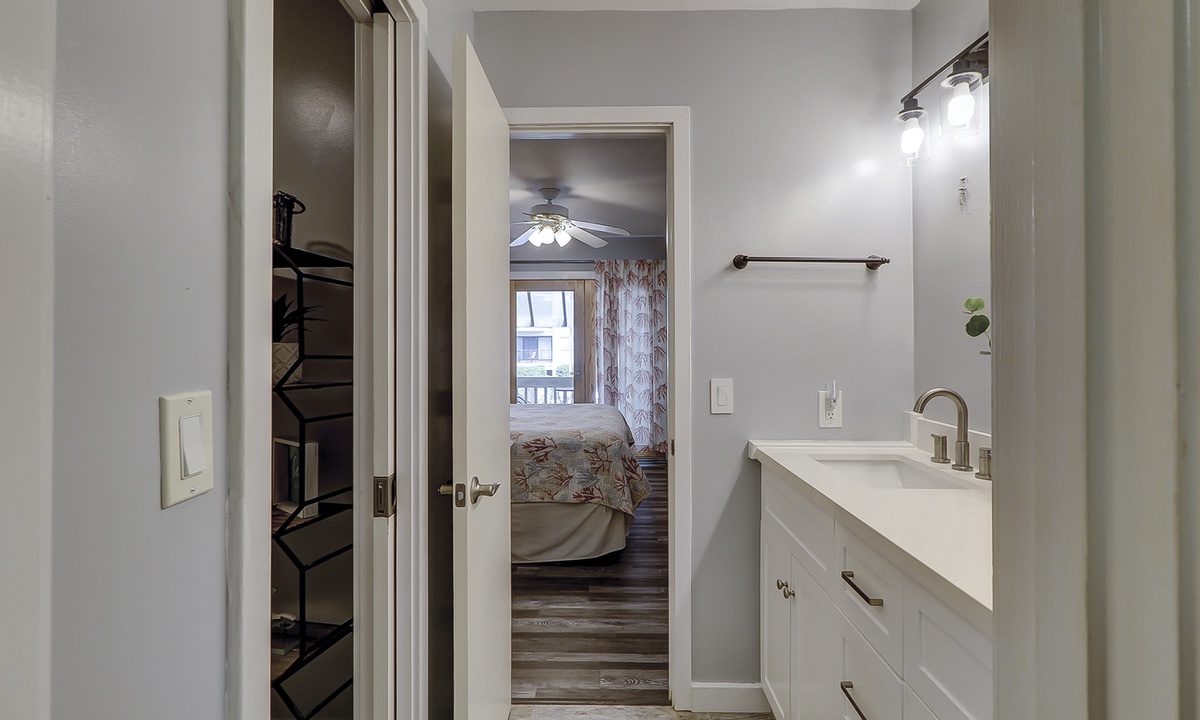 The guest bedroom features a bunk bed with a full size bed on the bottom and a twin on the top, as well as an additional twin bed. This room also has a flat screen TV. Both bedrooms share access to a completely renovated bathroom with dual vanity and large, tiled walk-in shower.