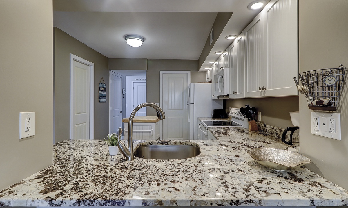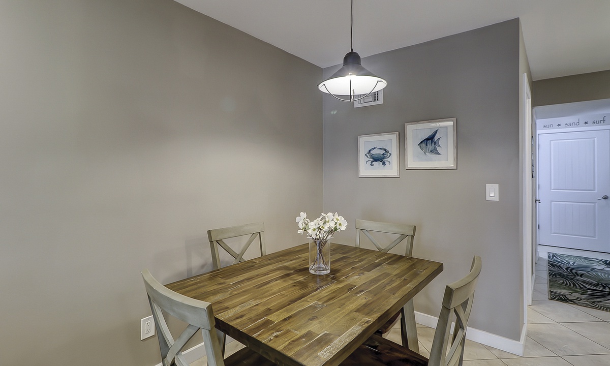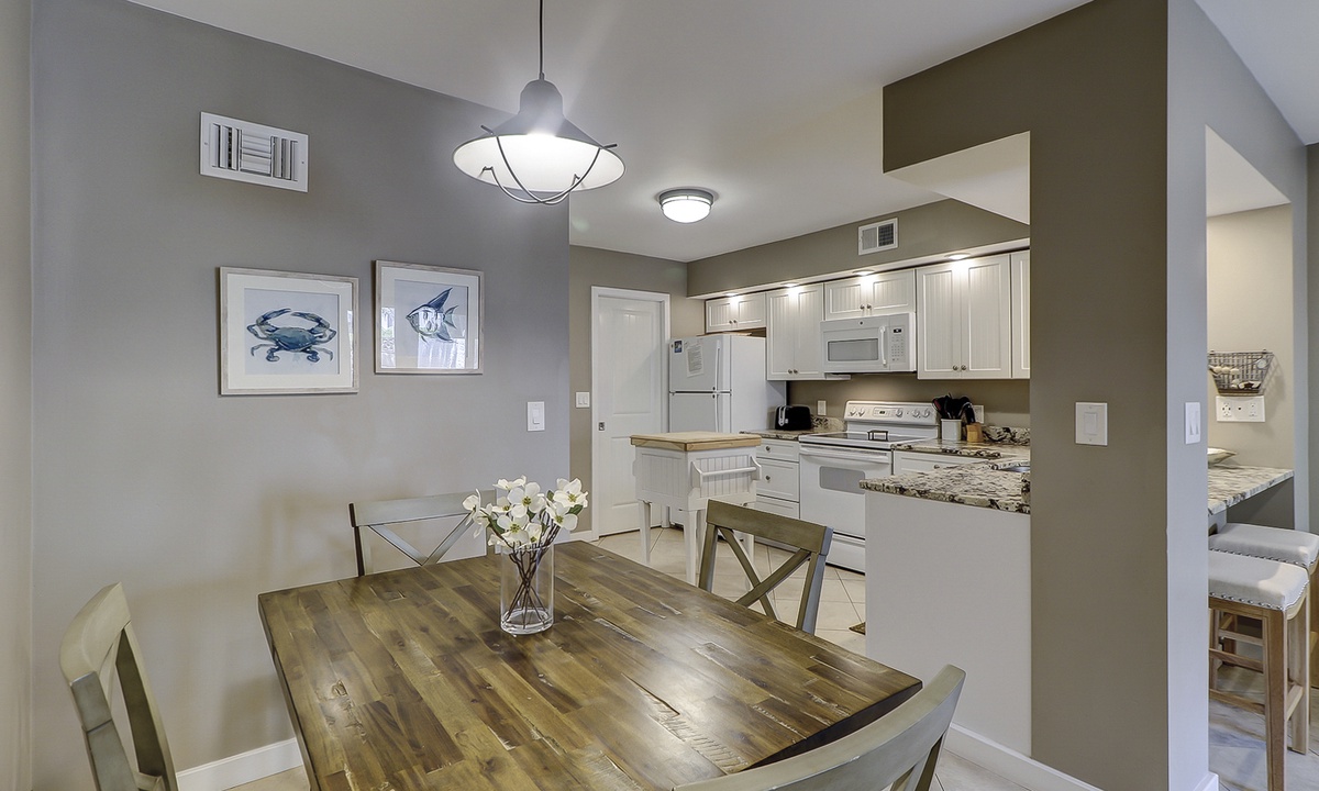 The dining area seats 4 comfortably, with additional seating for 2 at the kitchen bar. The renovated kitchen features granite counters and white appliances. A full bathroom with a walk-in shower is also located on this level.