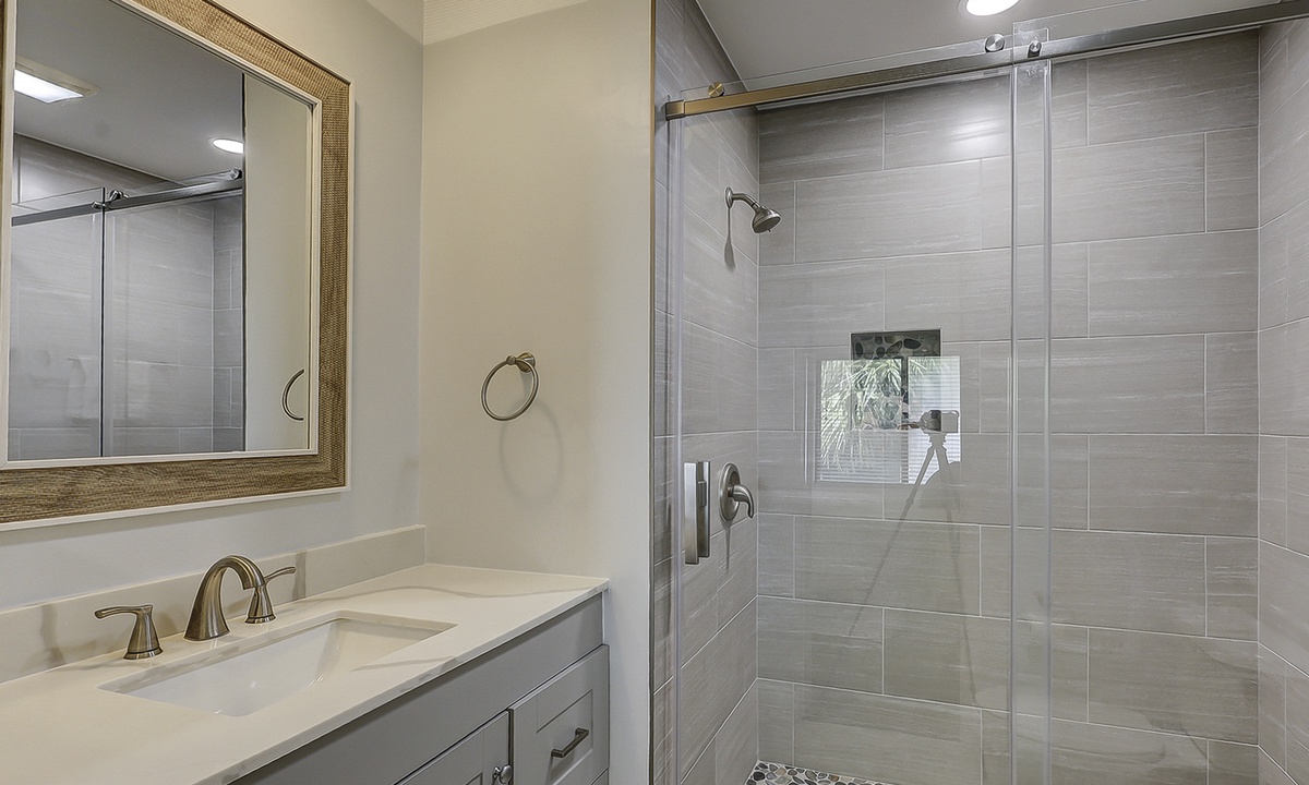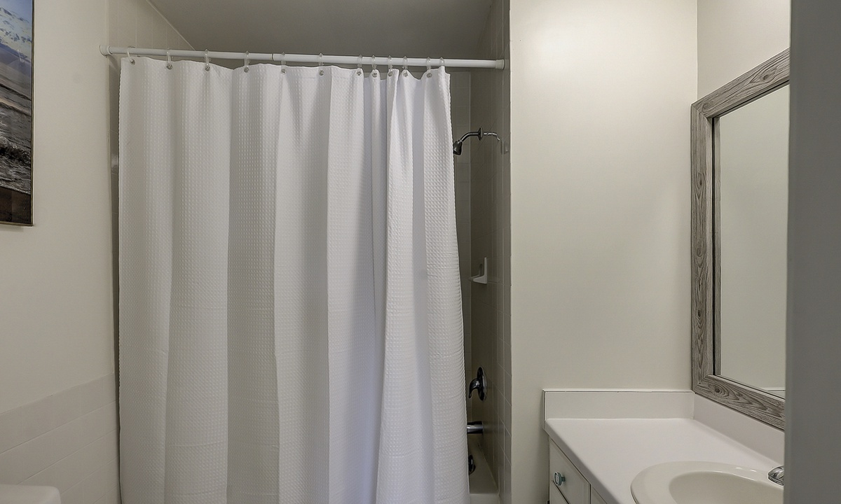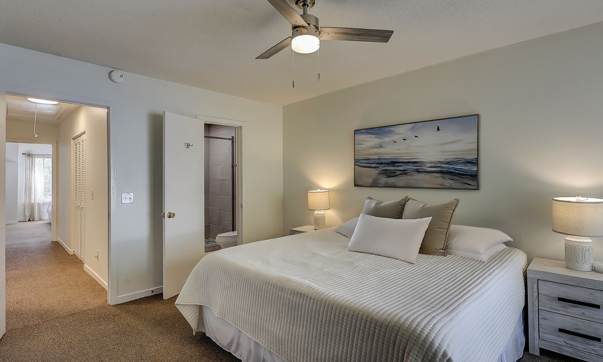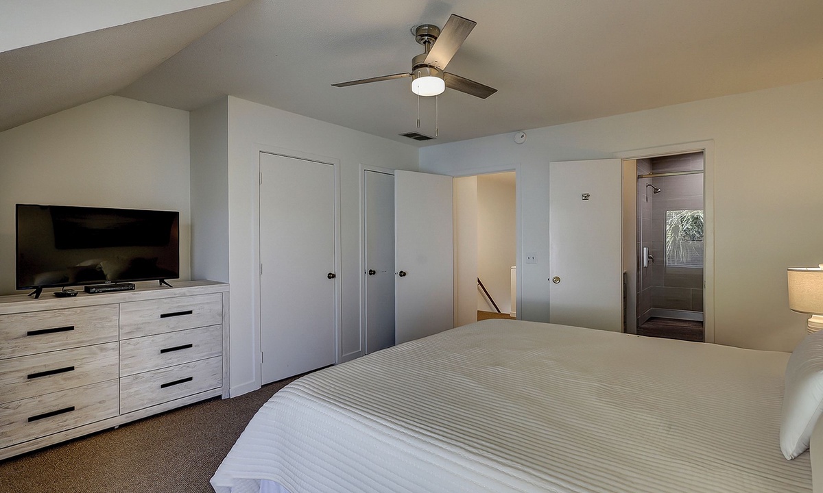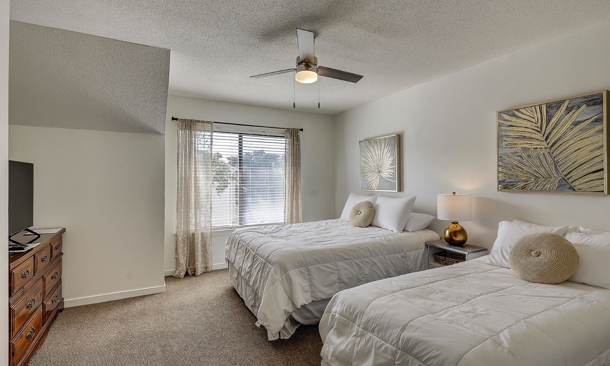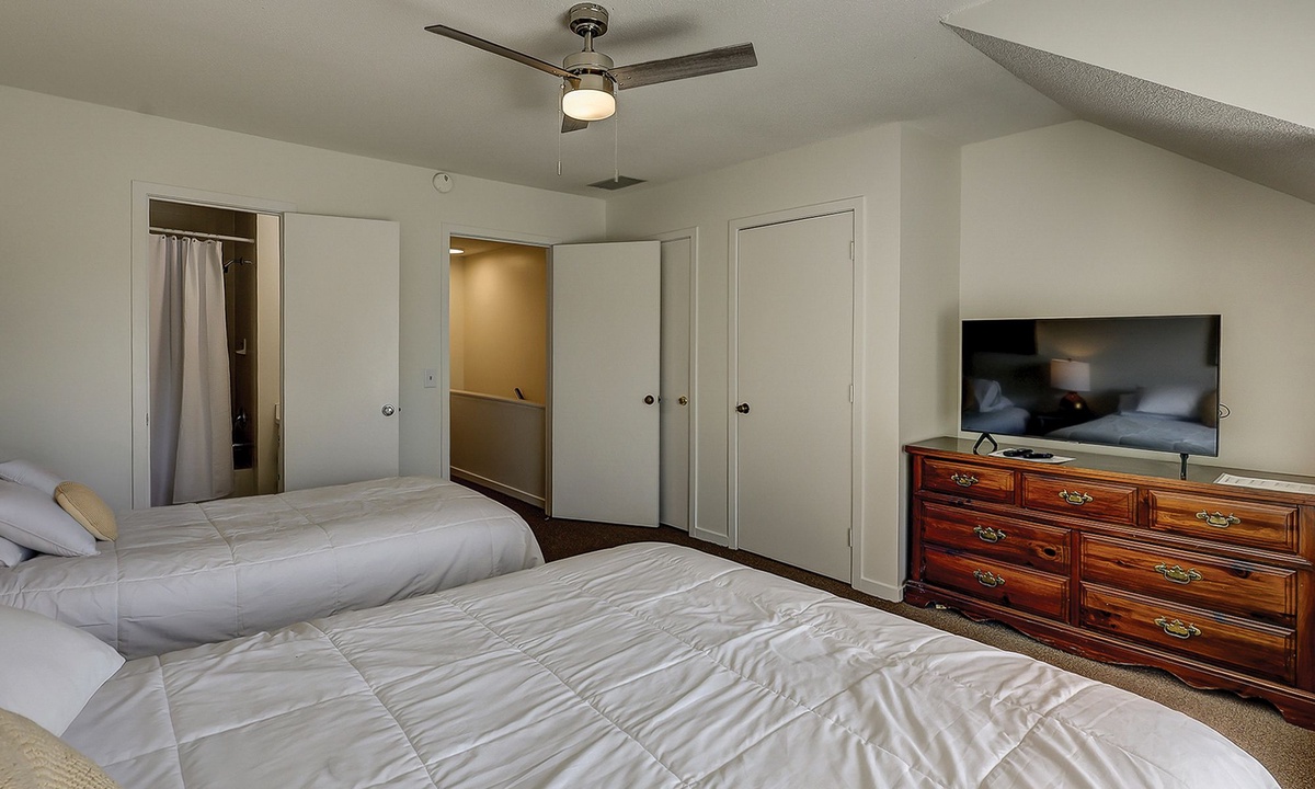 Up the stairs you'll find both bedrooms and bathrooms. The main bedroom has a king bed, Smart TV, views of the tennis courts and a private bathroom with a large tiled walk-in shower. The guest bedroom has a full size bed and a twin bed, Smart TV and a private bathroom with a tub/shower combination.
