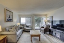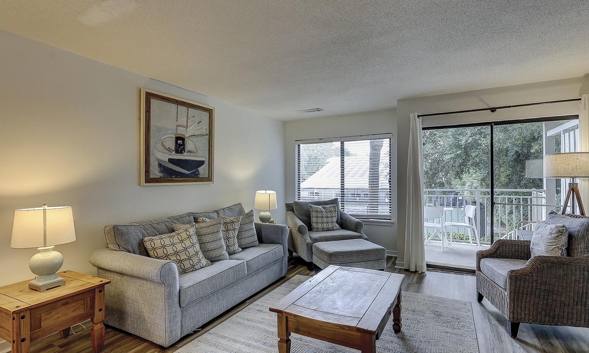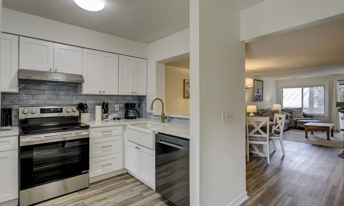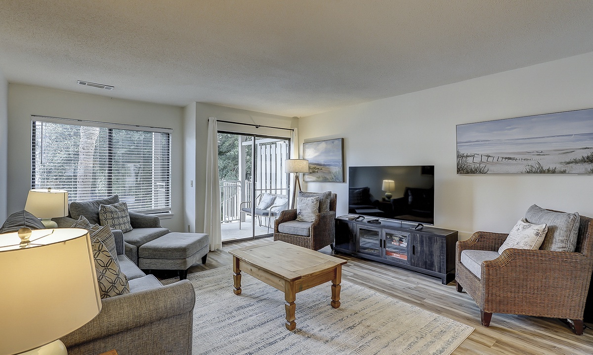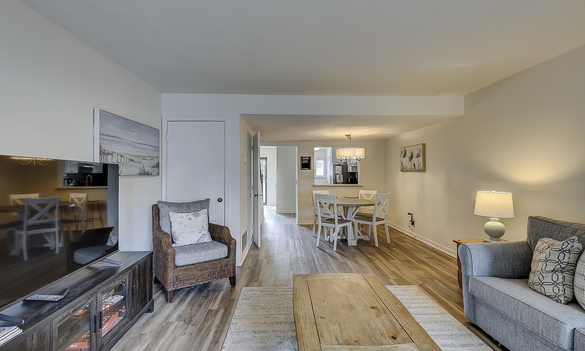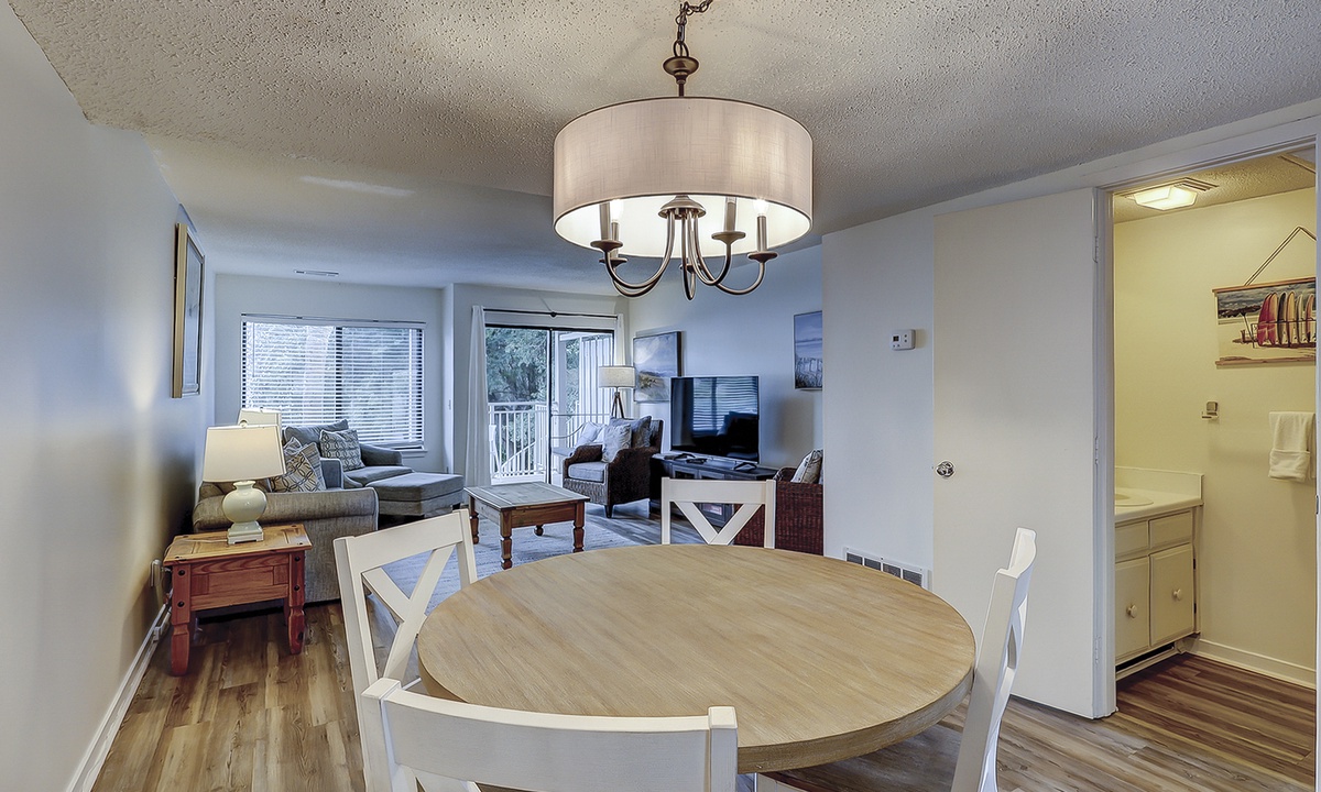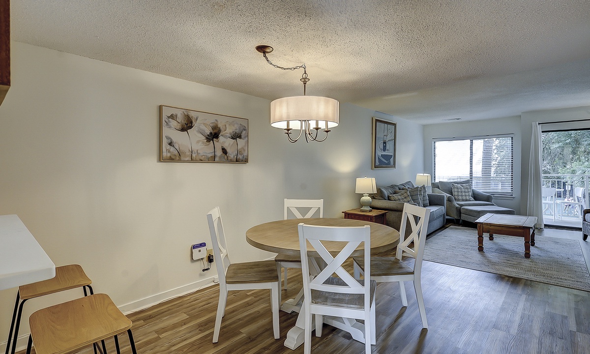 The living area is outfitted with plush furnishings, including a sleeper sofa, a Smart TV and access to the private patio overlooking the tennis center. The dining area beyond seats four comfortably with additional seating for 2 at the kitchen bar.