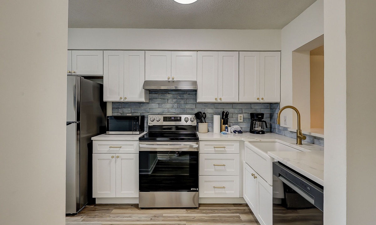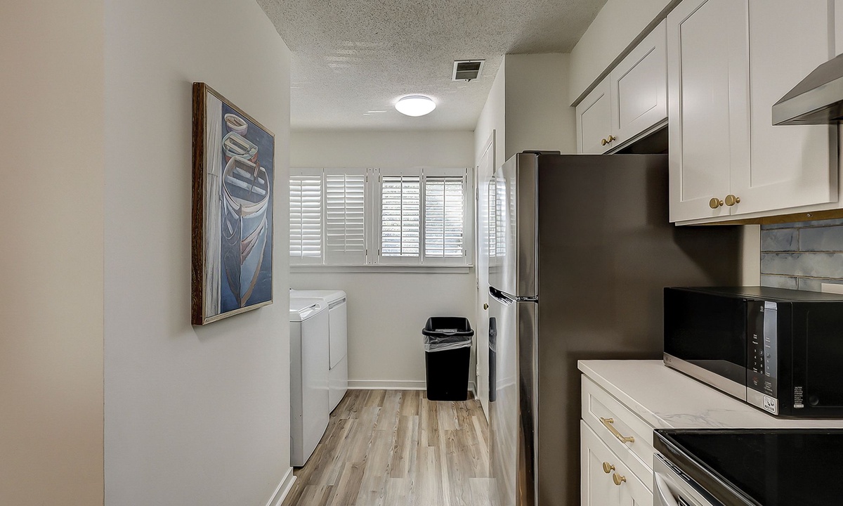 The fully renovated kitchen features new counters and cabinets, stainless appliances, a Keurig coffee maker and a full-size washer and dryer.