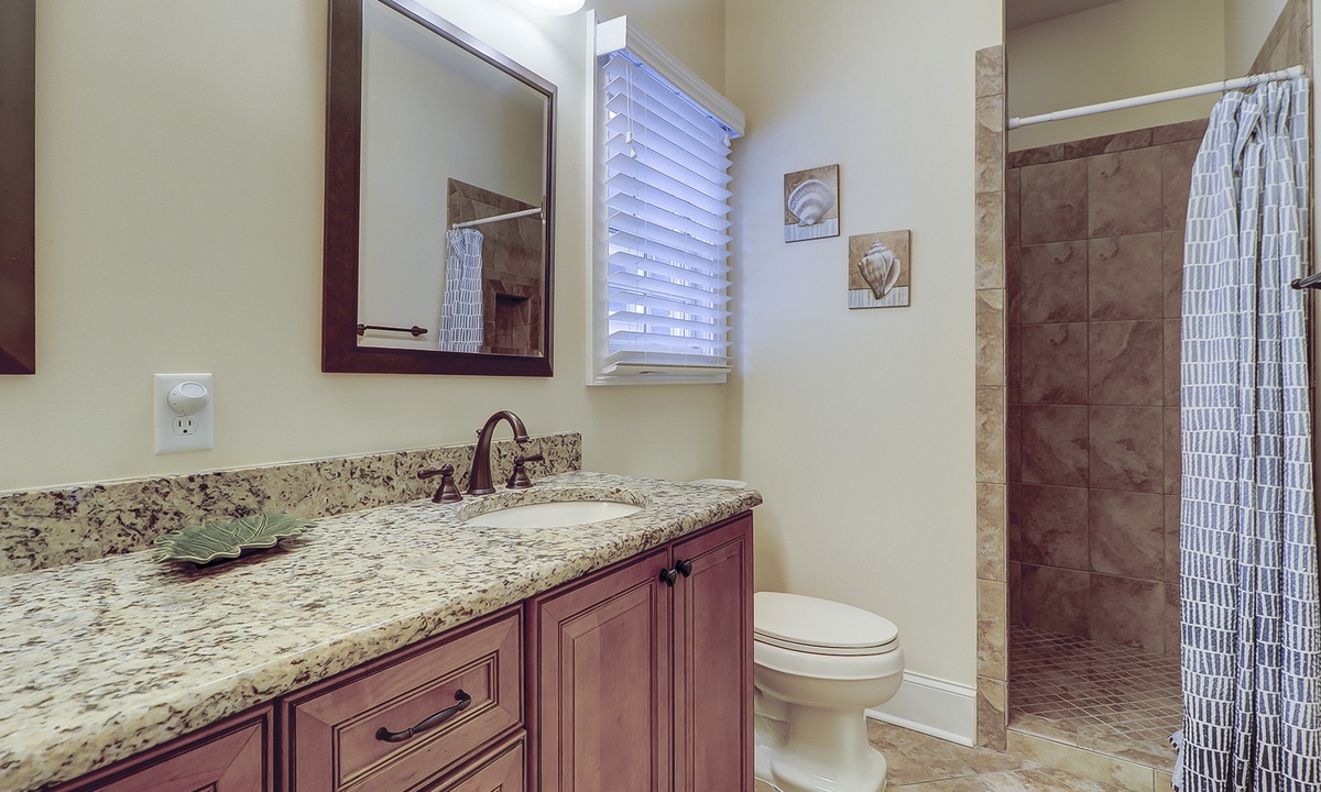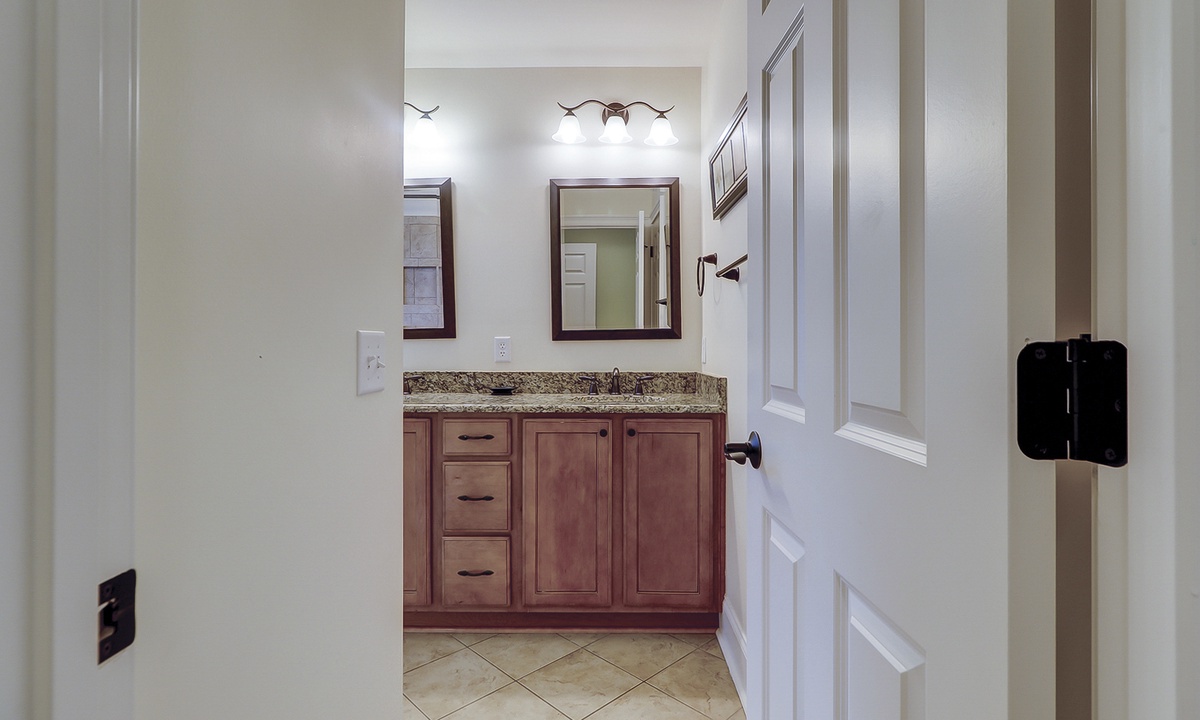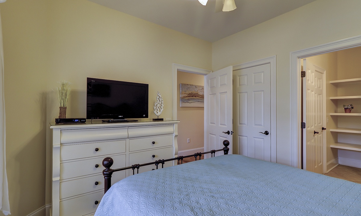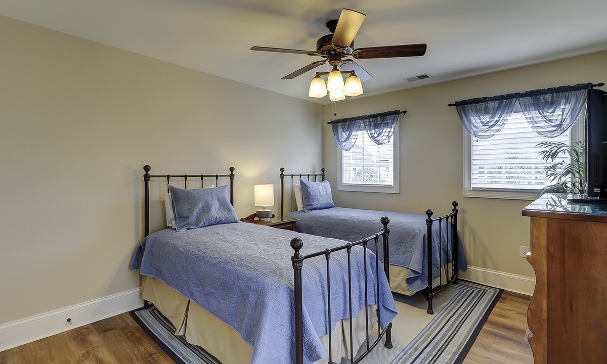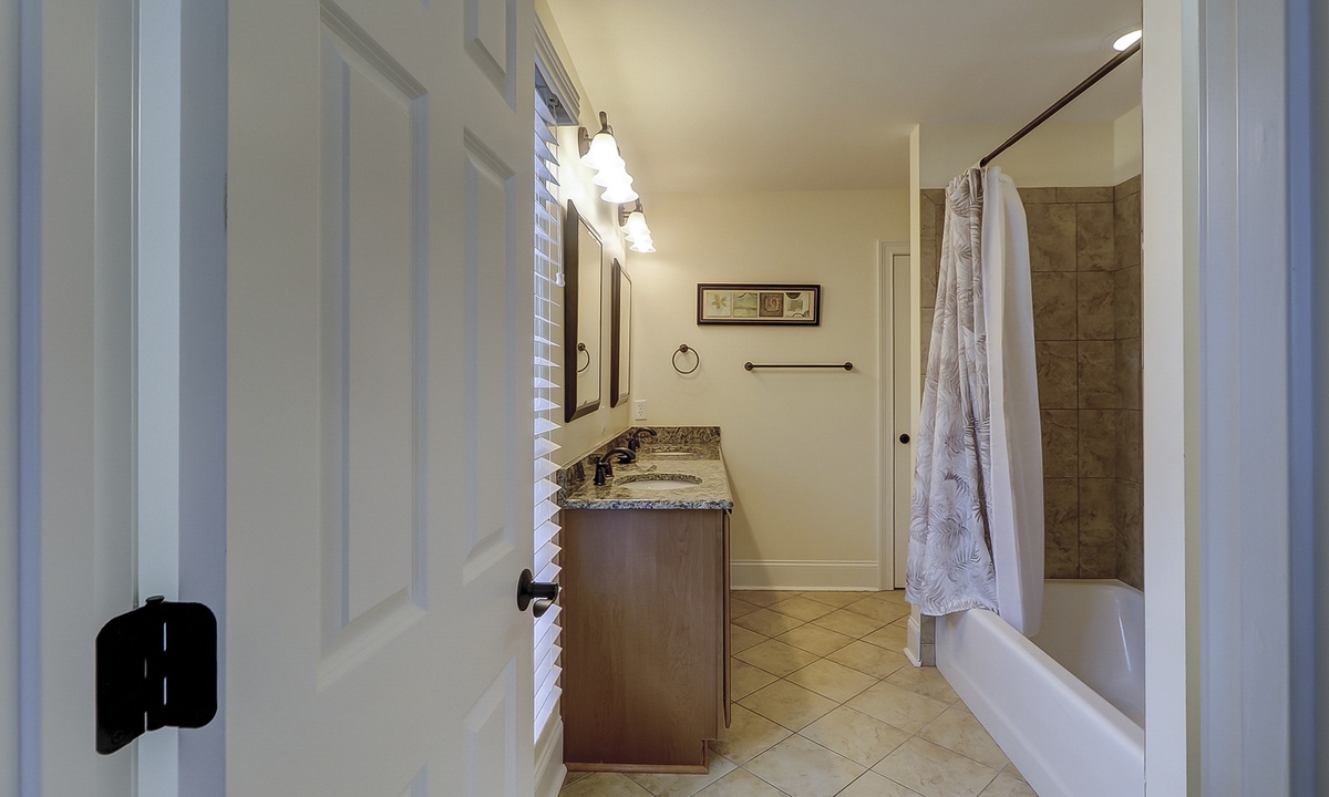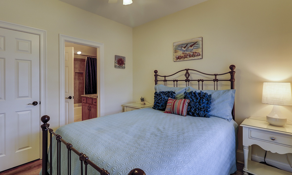 The first two bedrooms are located on the first floor. A queen primary suite with a TV and sitting area as well as an en-suite bathroom with his and her sinks and a standing shower. The second bedroom has a full bed and TV and shares a bathroom with the common area. The full bathroom is equipped with a shower/tub combo and an abundance of storage.