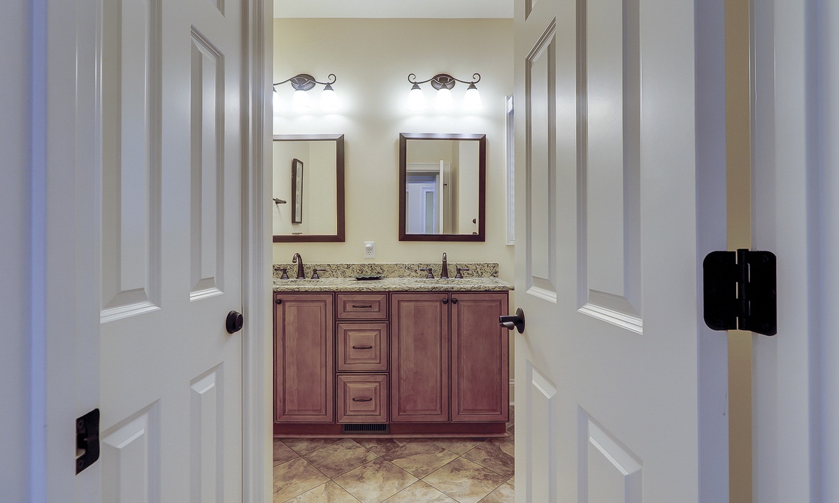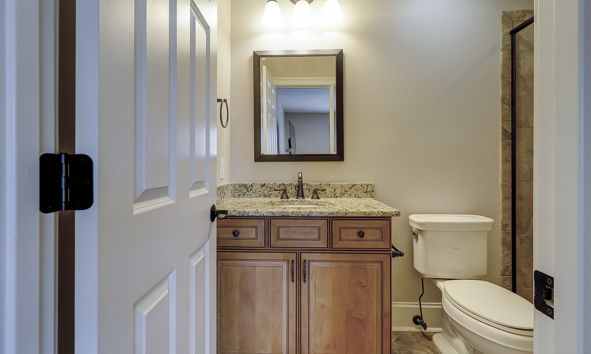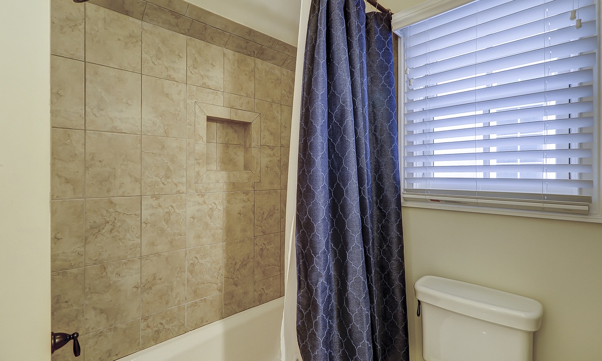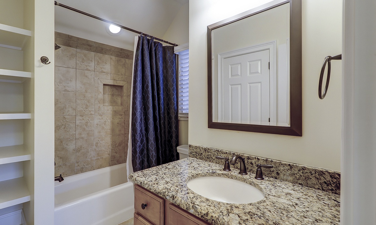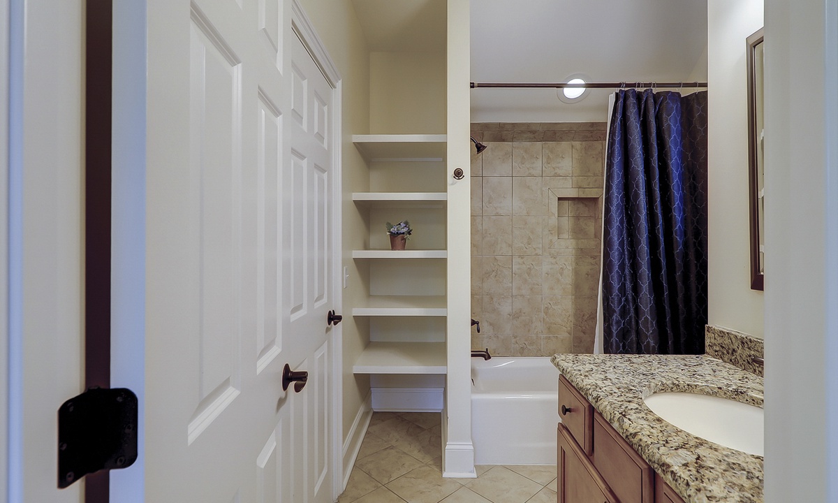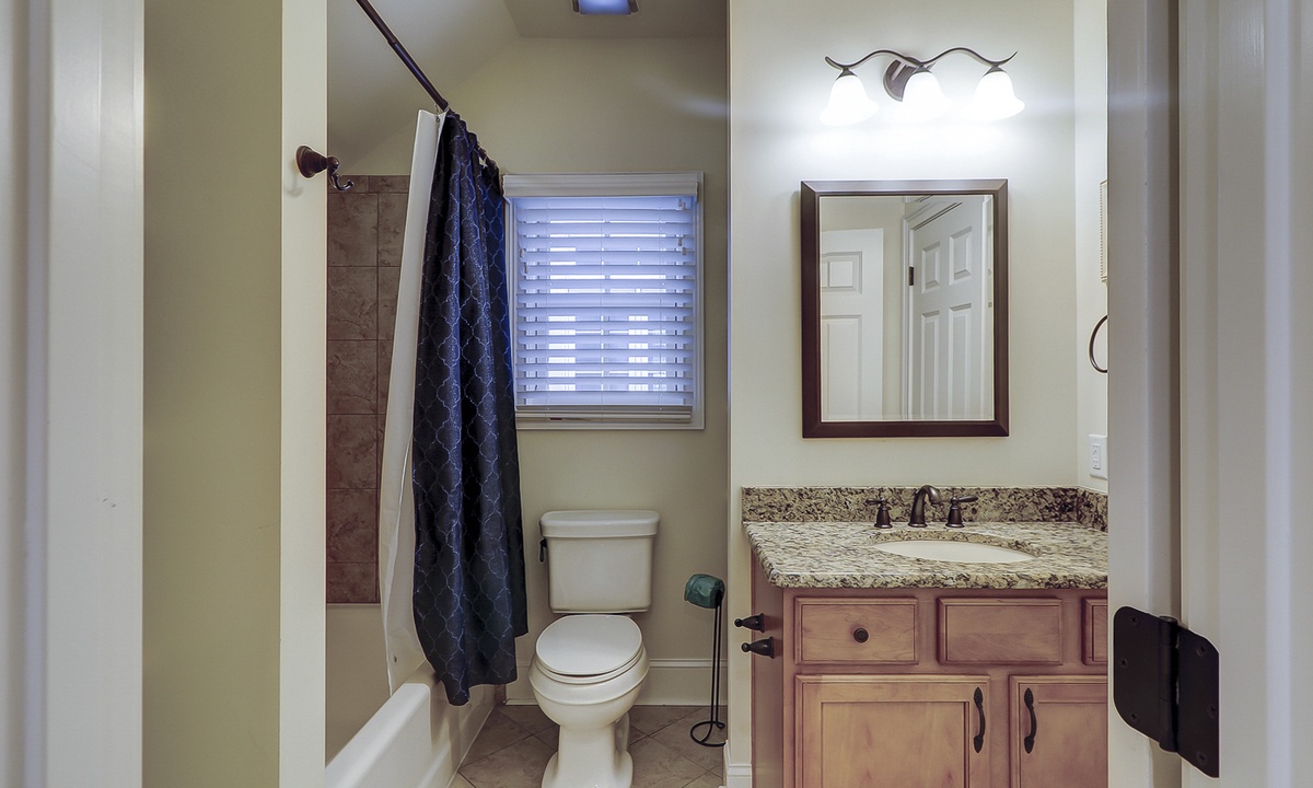 The first two bedrooms are located on the first floor. A queen primary suite with a TV and sitting area as well as an en-suite bathroom with his and her sinks and a standing shower. The second bedroom has a full bed and TV and shares a bathroom with the common area. The full bathroom is equipped with a shower/tub combo and an abundance of storage.