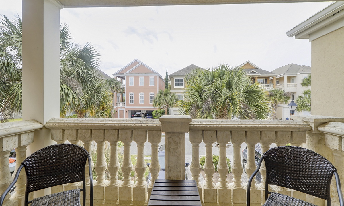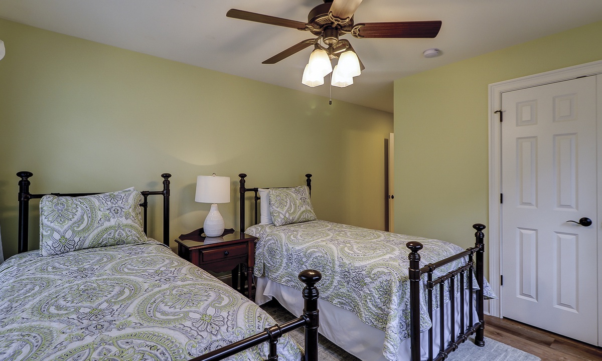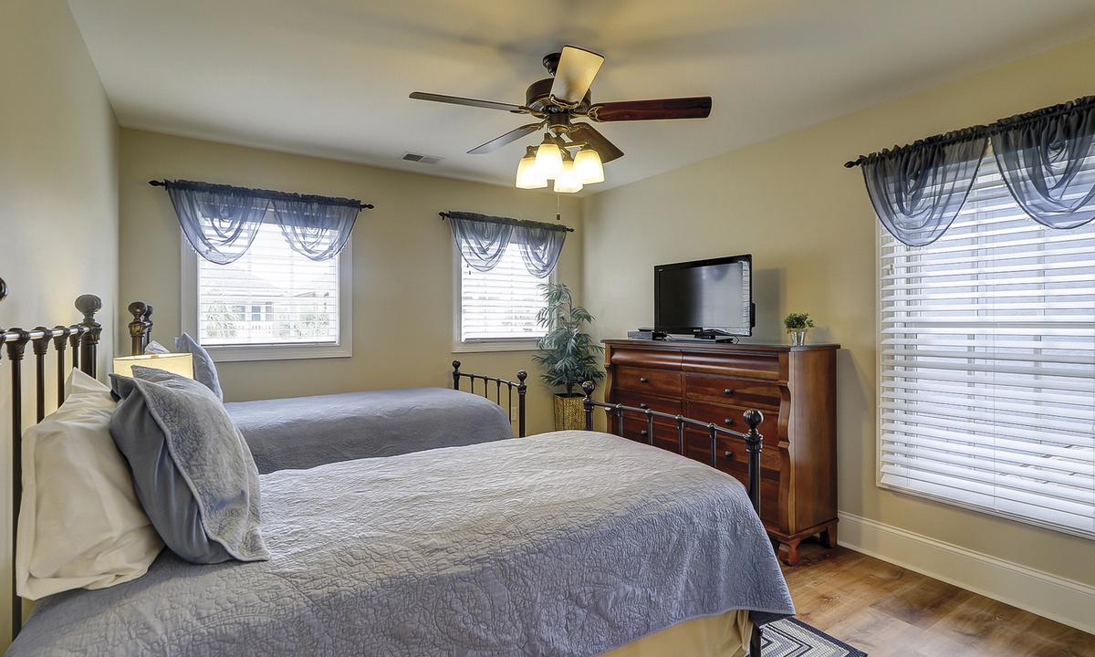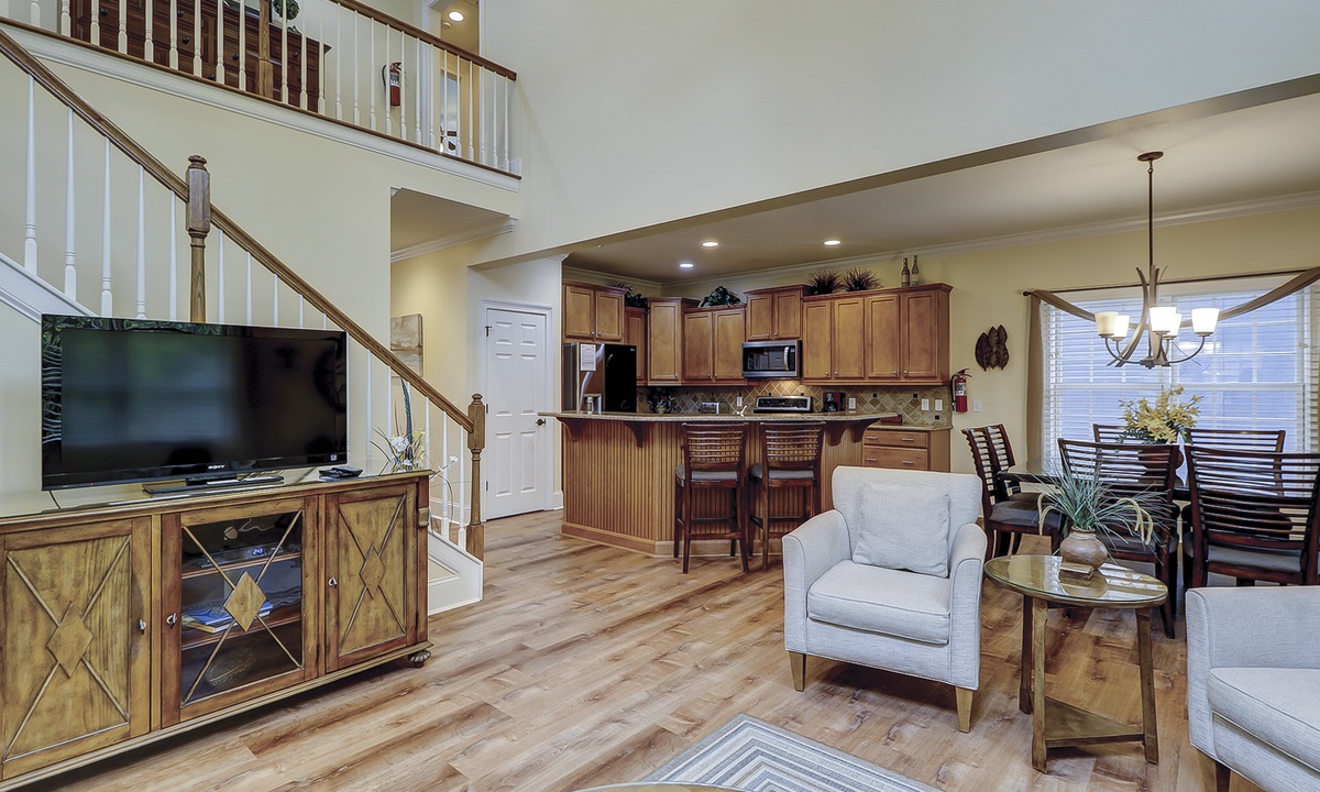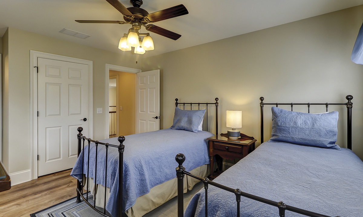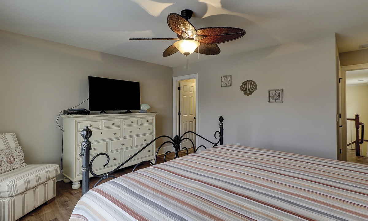 The second-floor landing overlooks the open living room before leading to the three remaining bedrooms. Two bedrooms feature 2 twins a piece and TVs, sharing a bathroom with a shower/tub combo and his and her vanity. The final bedroom is a second primary bedroom with a king bed, TV and DVD, and sitting area as well and its own en-suite bathroom with a single vanity and standing shower.