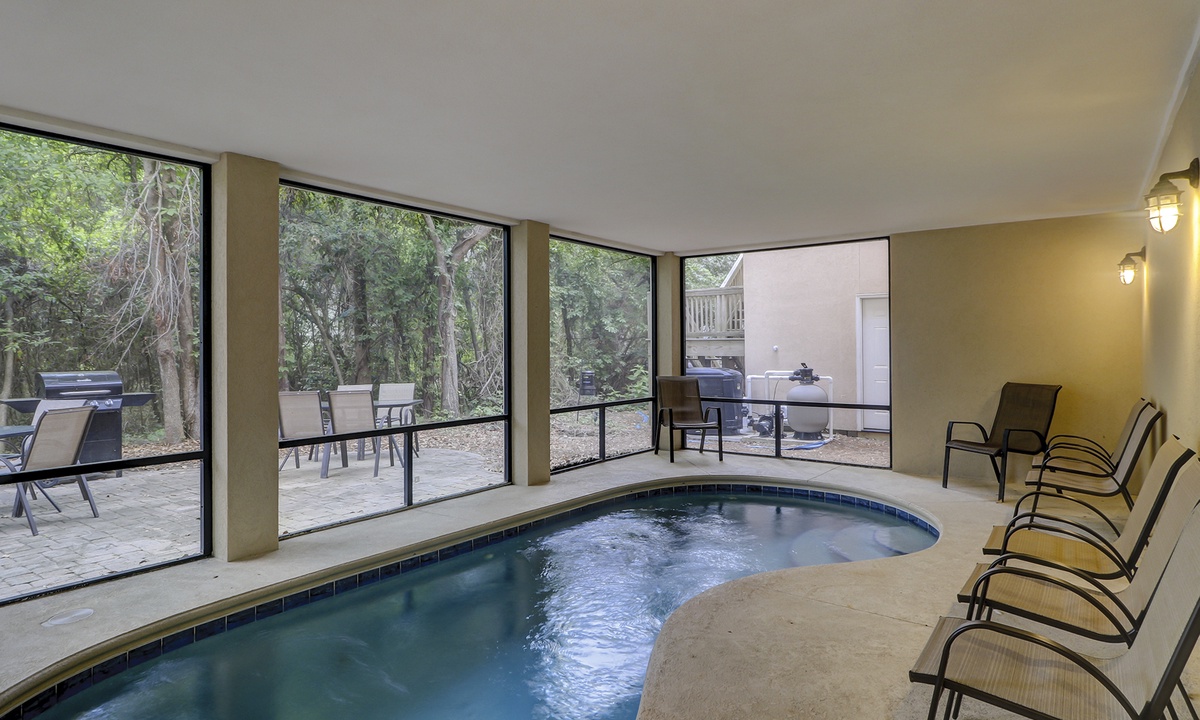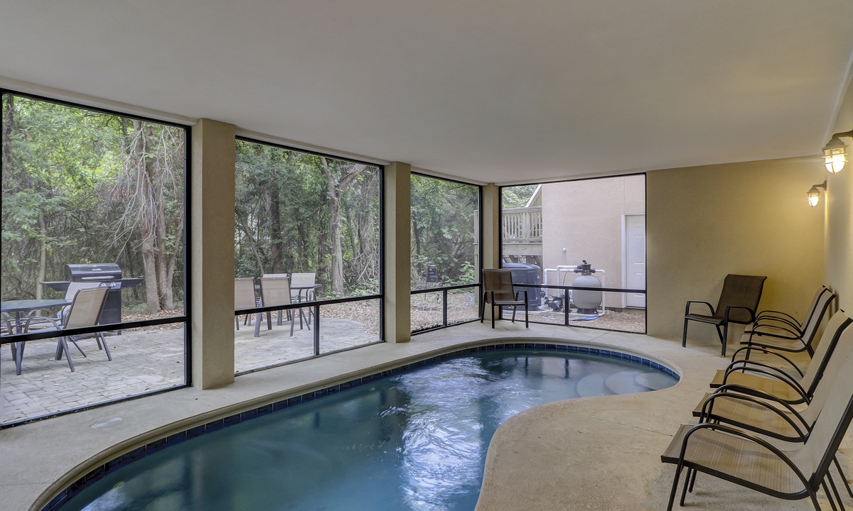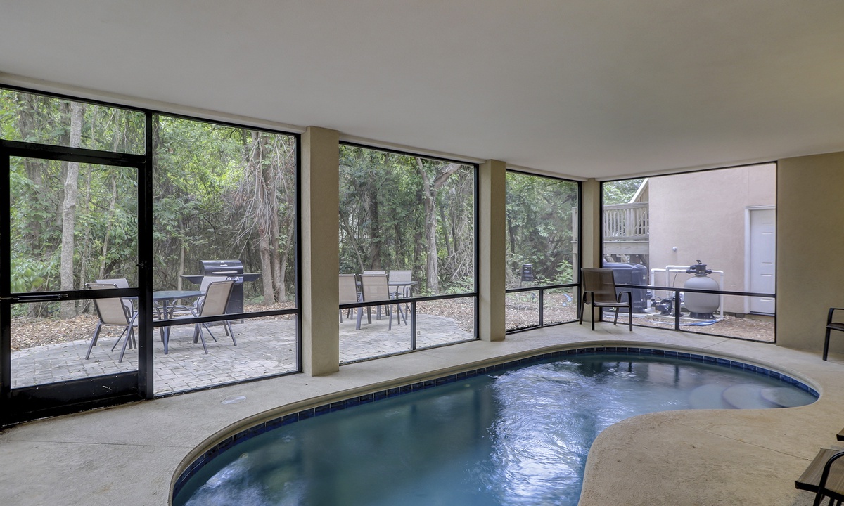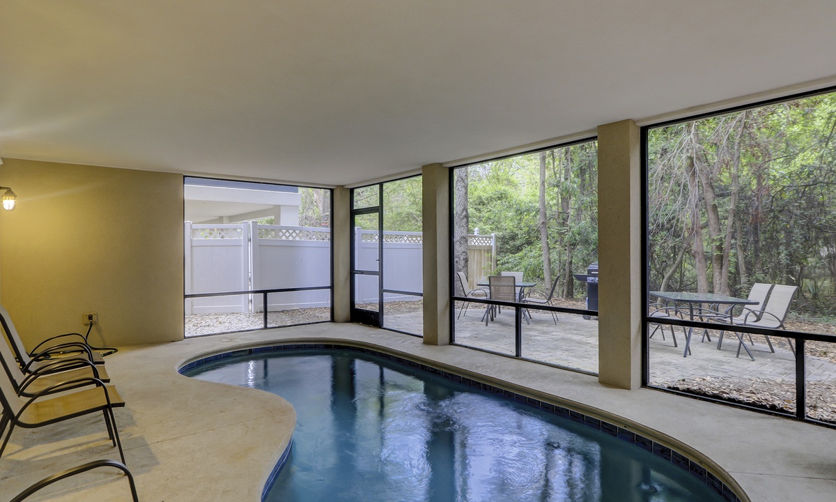Crabline 32 offers stylish indoor and outdoor living on Hilton Head Island. The delightful, private backyard has a screened-in indoor pool, a BBQ grill and table with seating for 6 for island-style alfresco dining.