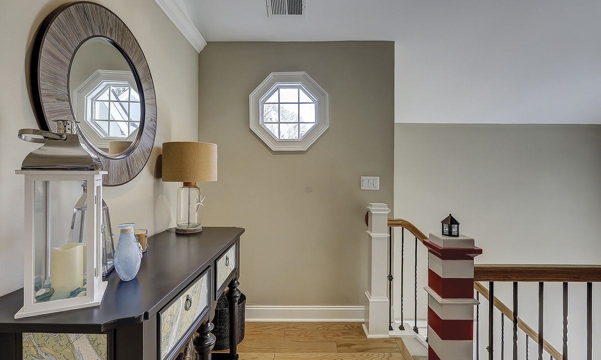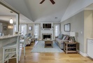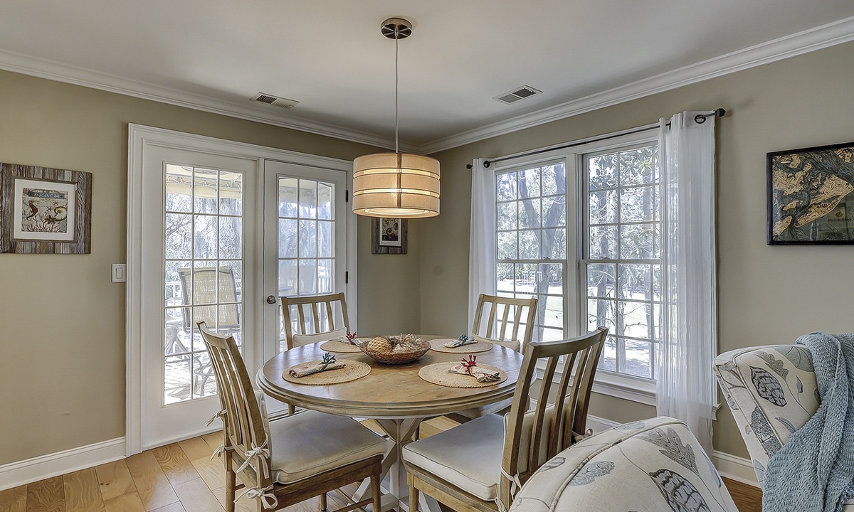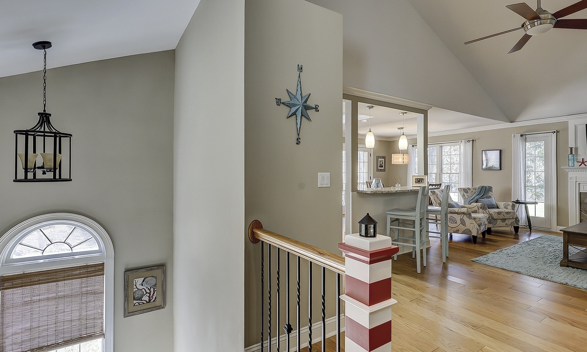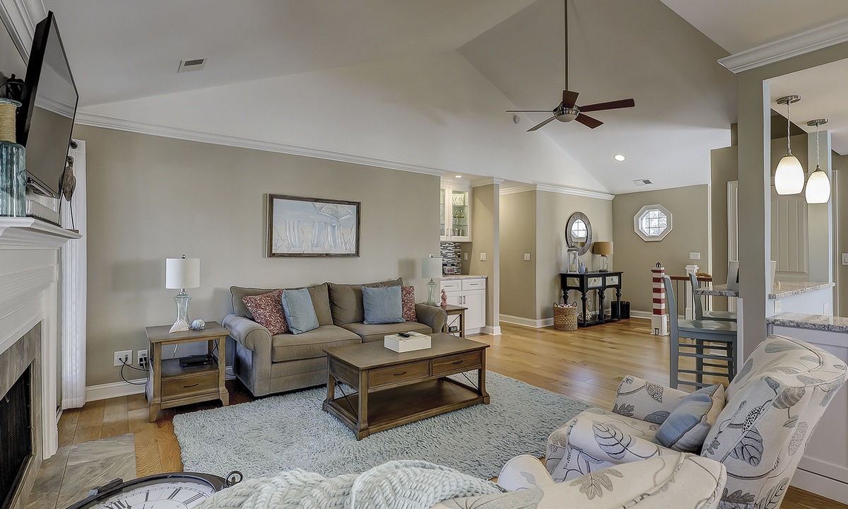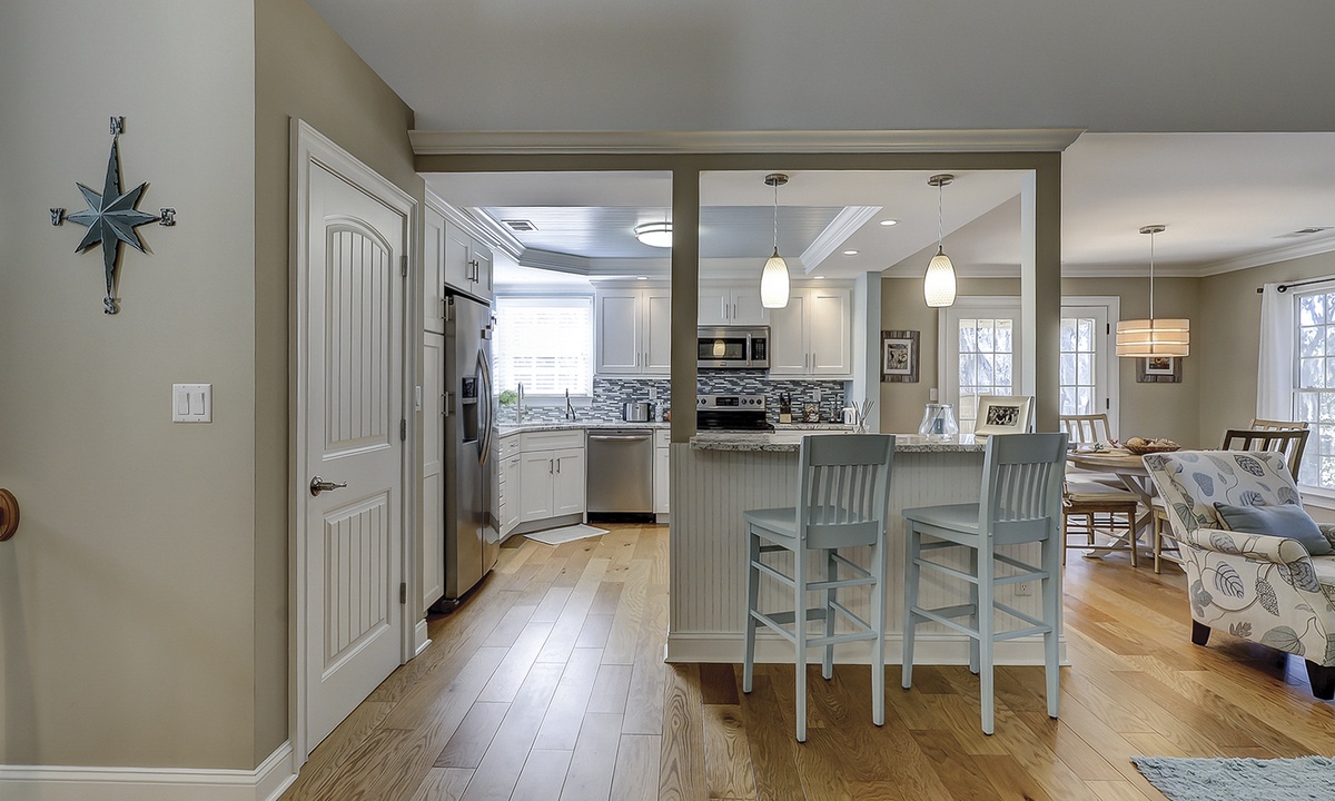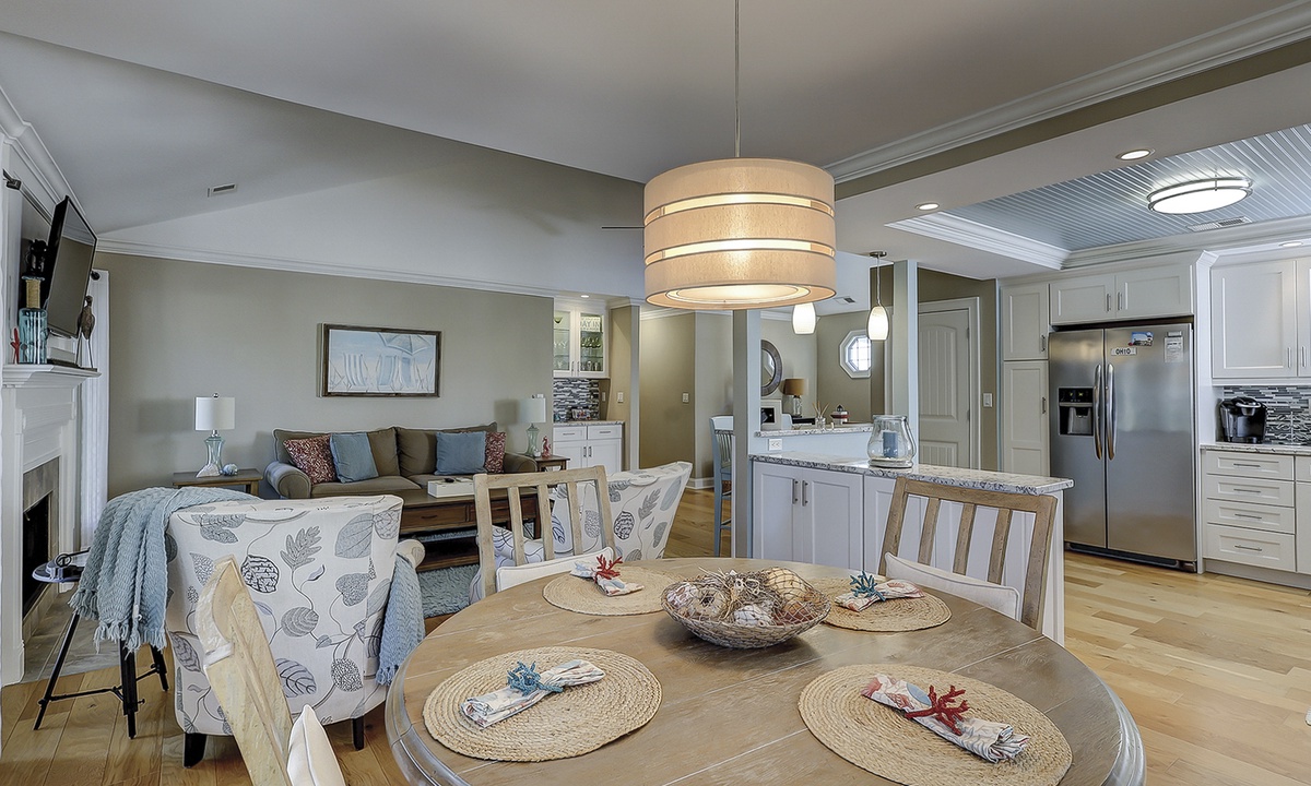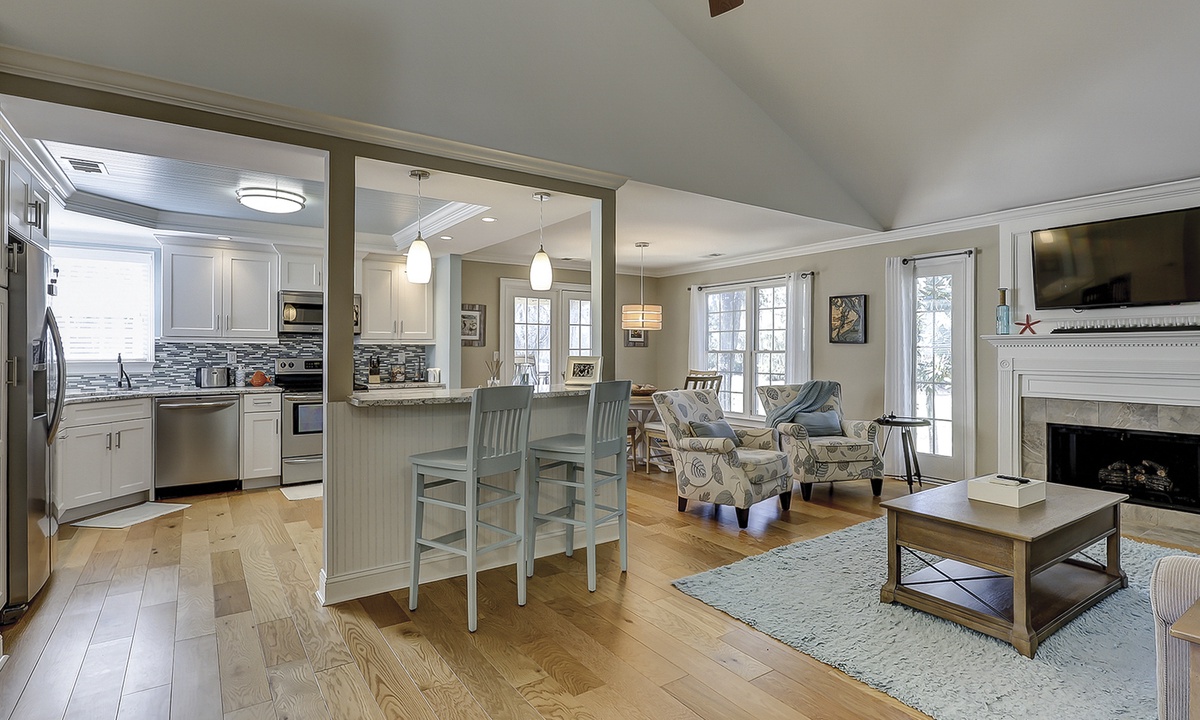 As you ascend the stairs to the main level of the property, you're greeted with a spacious living area featuring comfortable seating and a Smart TV. The dining area seats 4 comfortably, with additional seating for 2 at the kitchen bar.