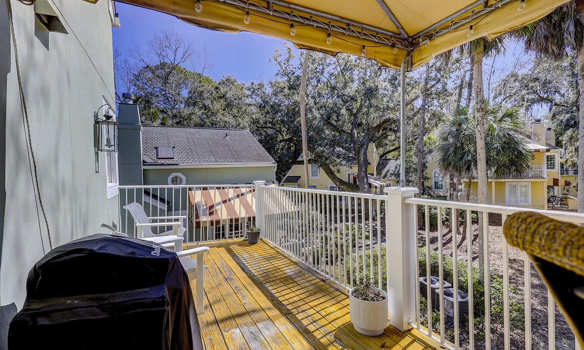 The large balcony can be accessed through the dining area and has seating for 4 at a high-top table, with additional seating for 2 next to the grill.