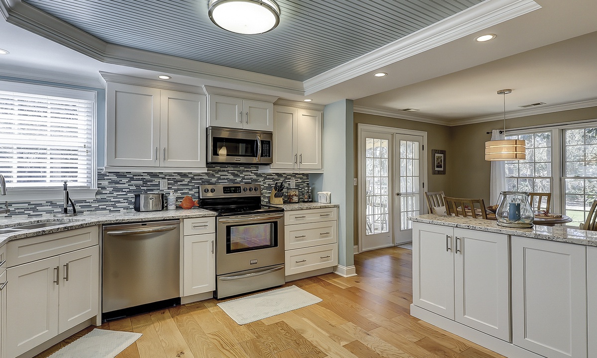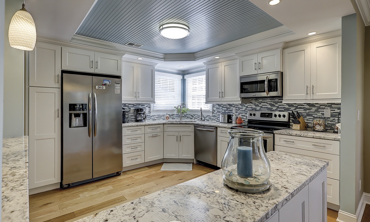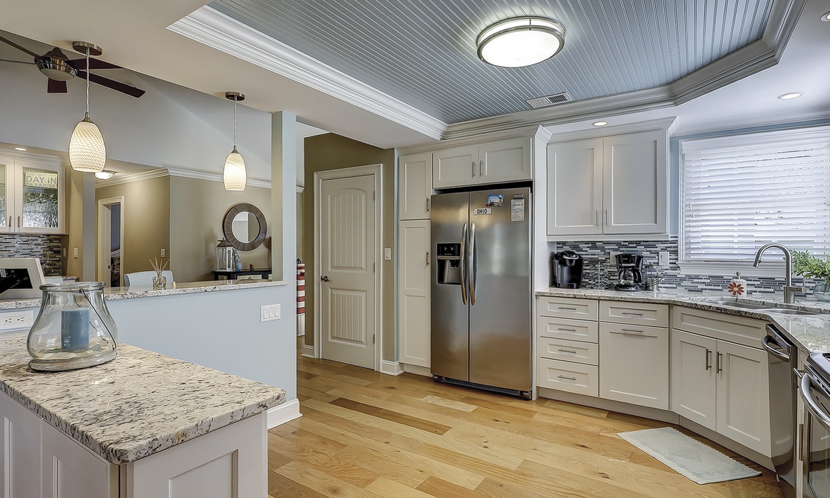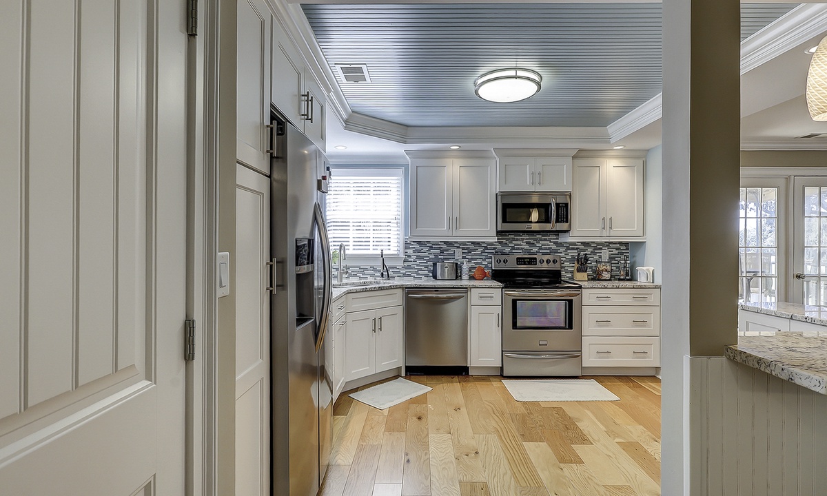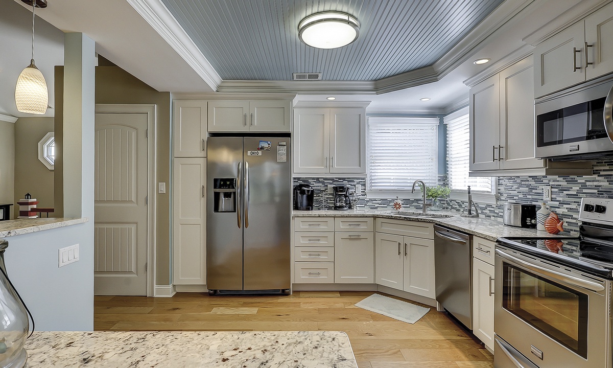 The large kitchen has ample counter and cabinet space, as well as stainless appliances and a Keurig coffeemaker.