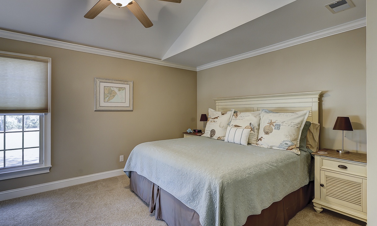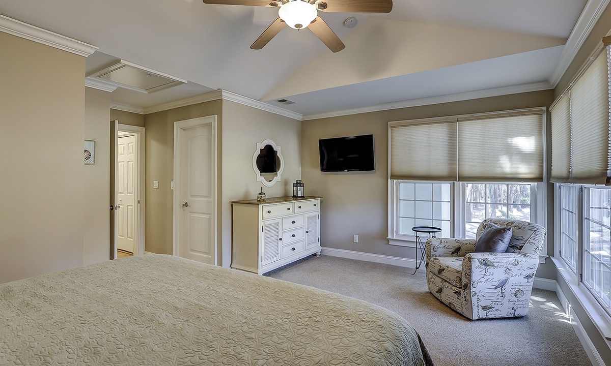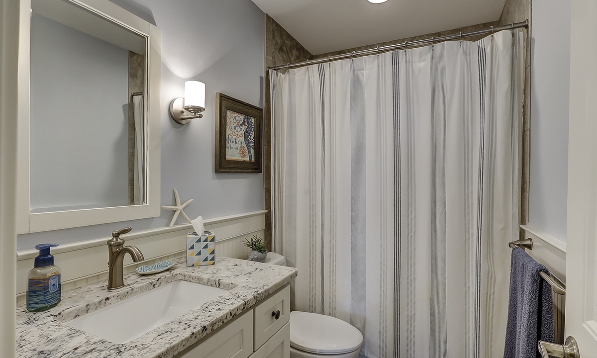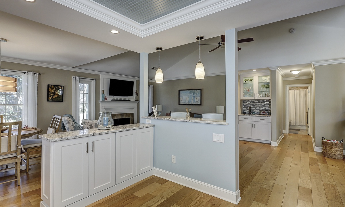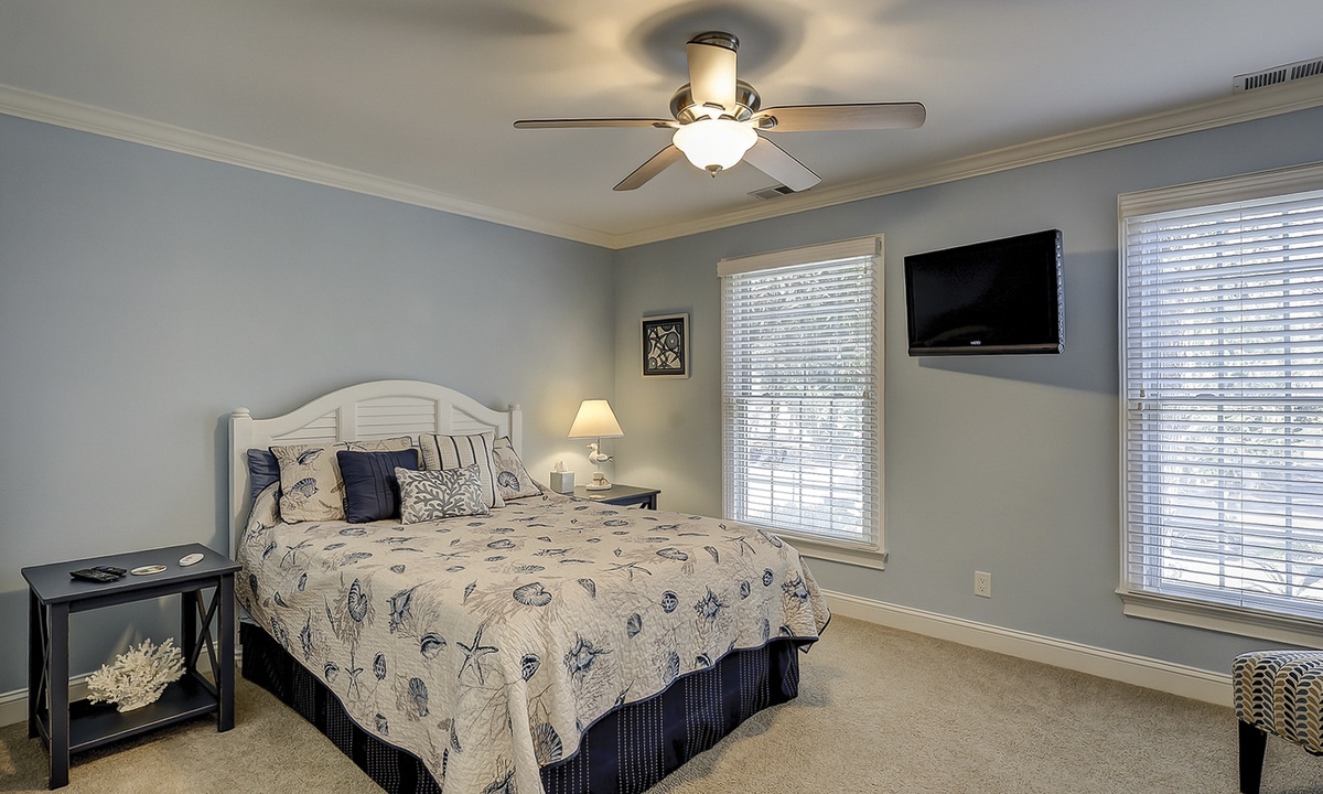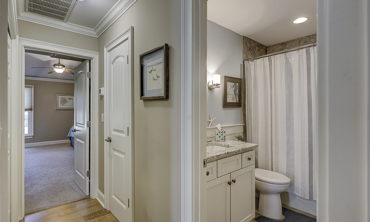 Down the hall from the living area, you'll find both bedrooms and bathrooms. The main bedroom has a king bed, Smart TV and a private bathroom with a walk-in shower. The guest bedroom has a queen bed, flat screen TV and access to the hall bathroom with a tub/shower combination.