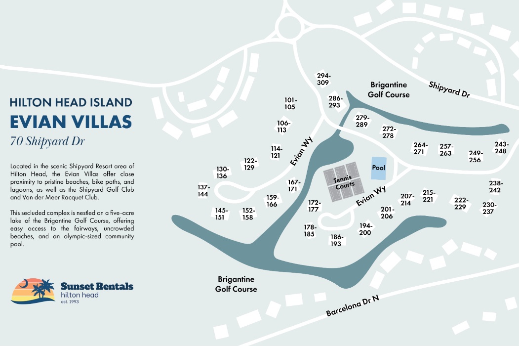 Evian is one of Shipyard's most scenic settings and is an oasis of seclusion and serenity surrounded by the Brigantine Golf Course. An old fashioned gazebo overlooks the 5 acre lake with a sweeping footbridge and benches for wildlife viewing, the olympic-size pool is open year round and the free lighted tennis courts are located nearby. A short walk or bike ride and your toes are in the Atlantic Ocean.