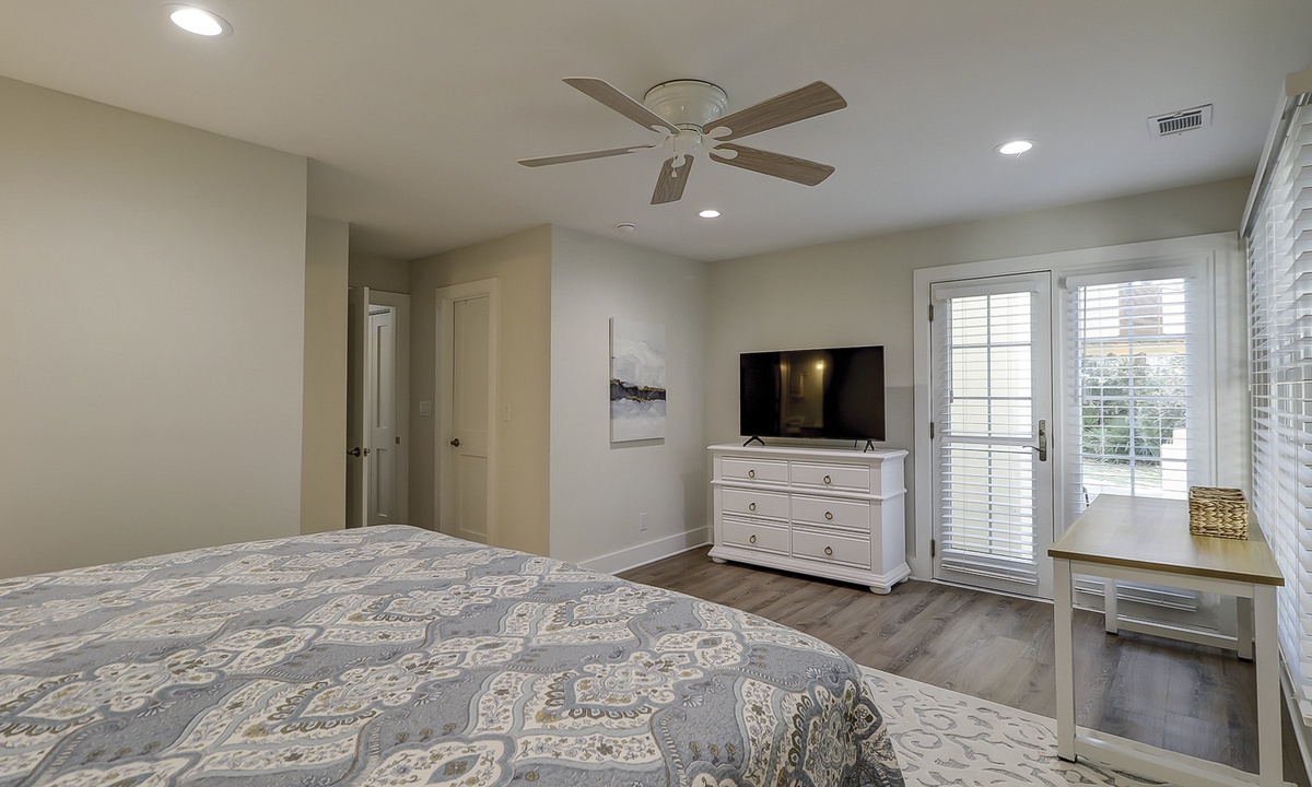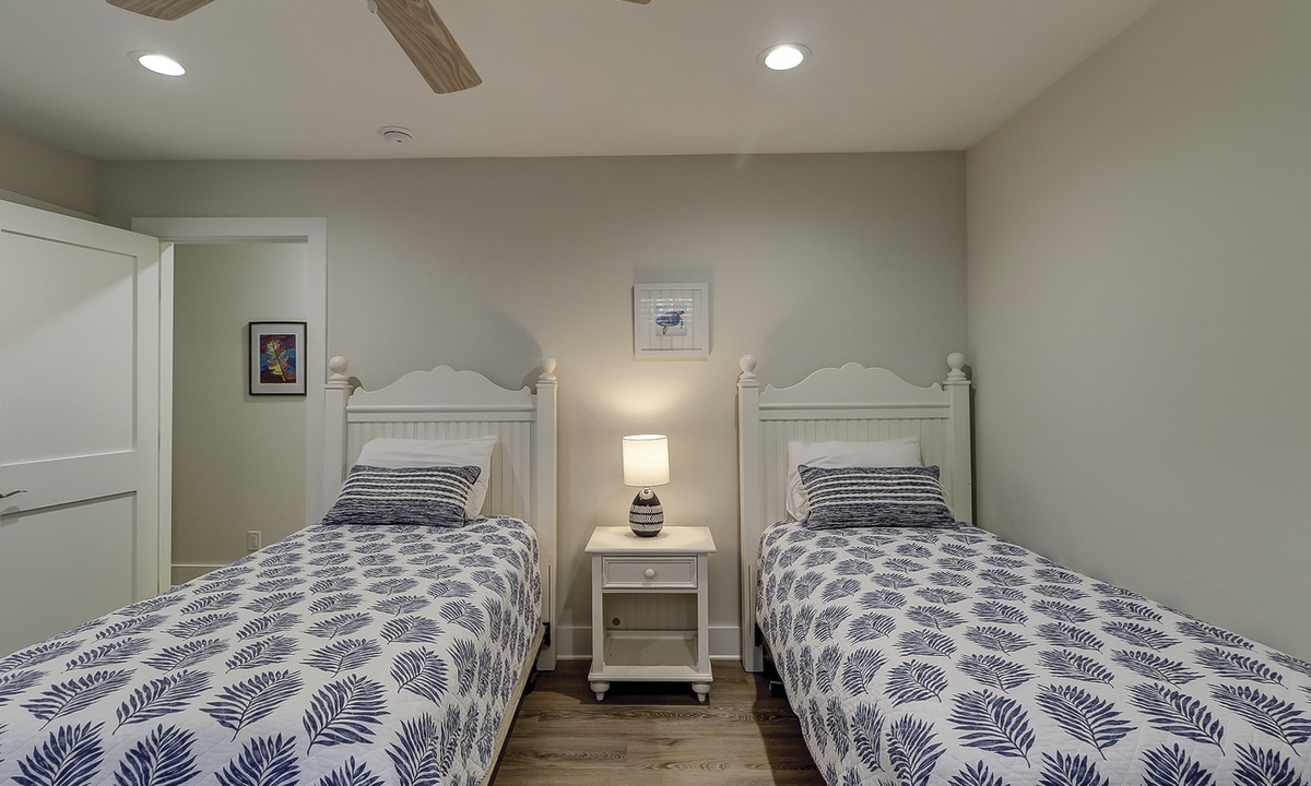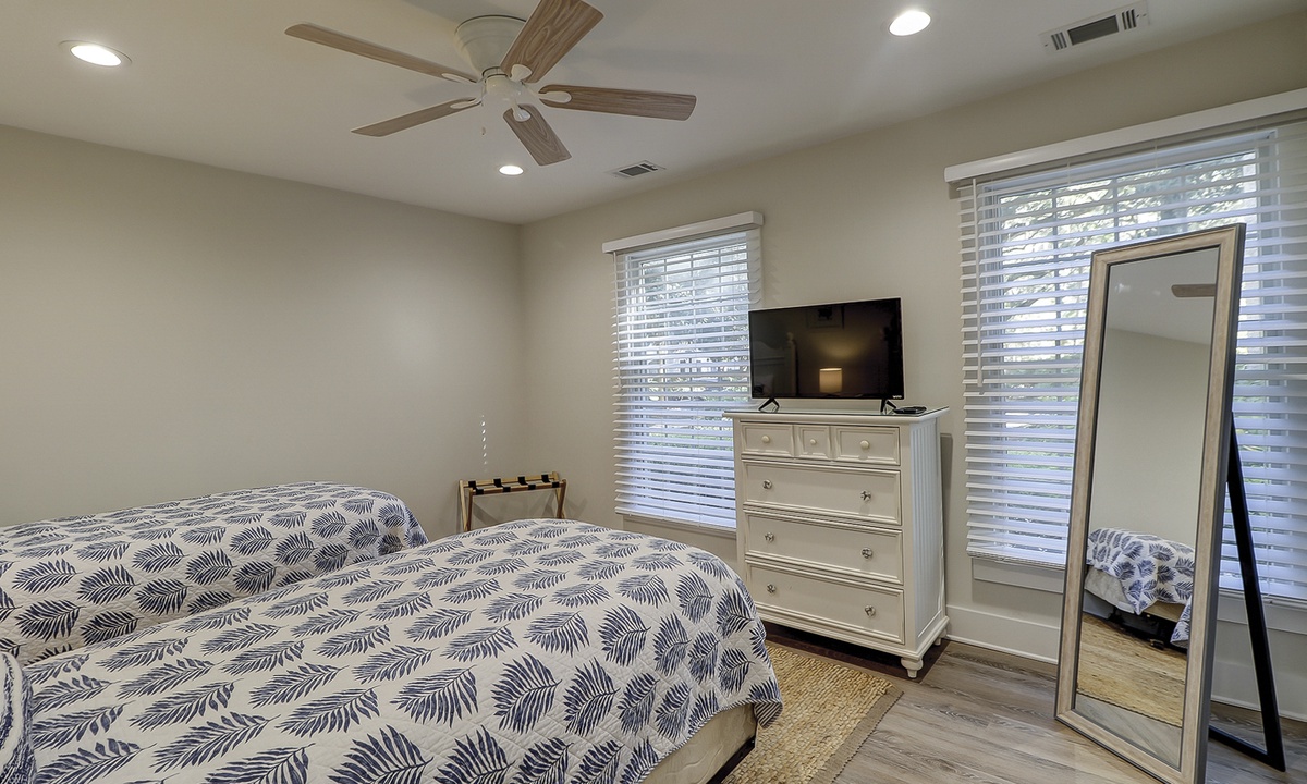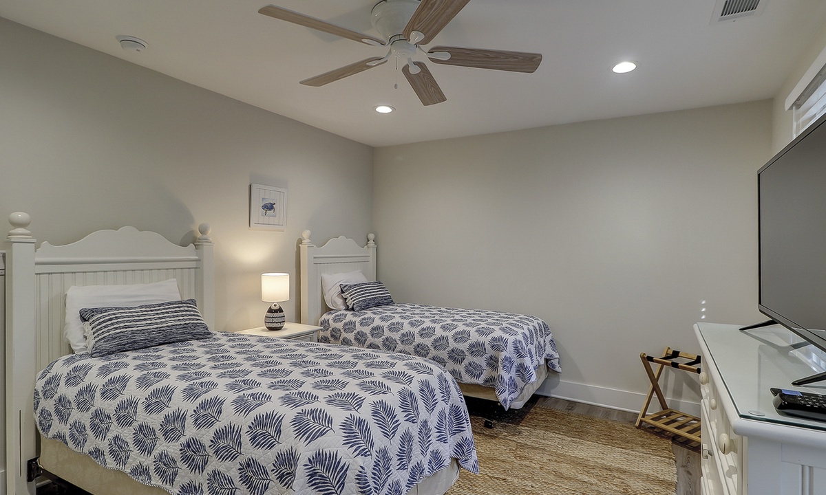 The spacious main bedroom features a king bed, work space, Smart TV and a stunning private bathroom with a large walk-in shower. The bright and airy guest bedroom features 2 twin beds, plenty of closet space, a Smart TV and access to a hall bathroom with a tub/shower combination.