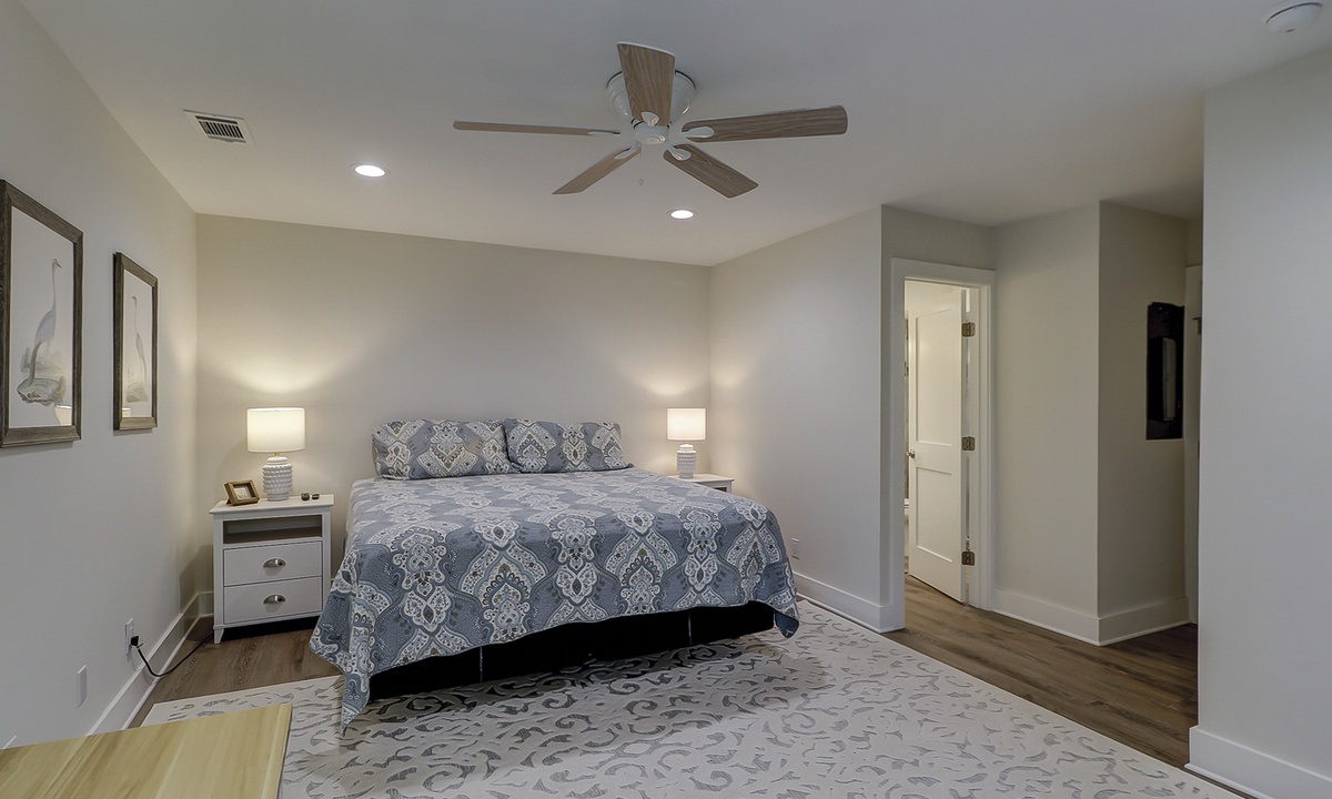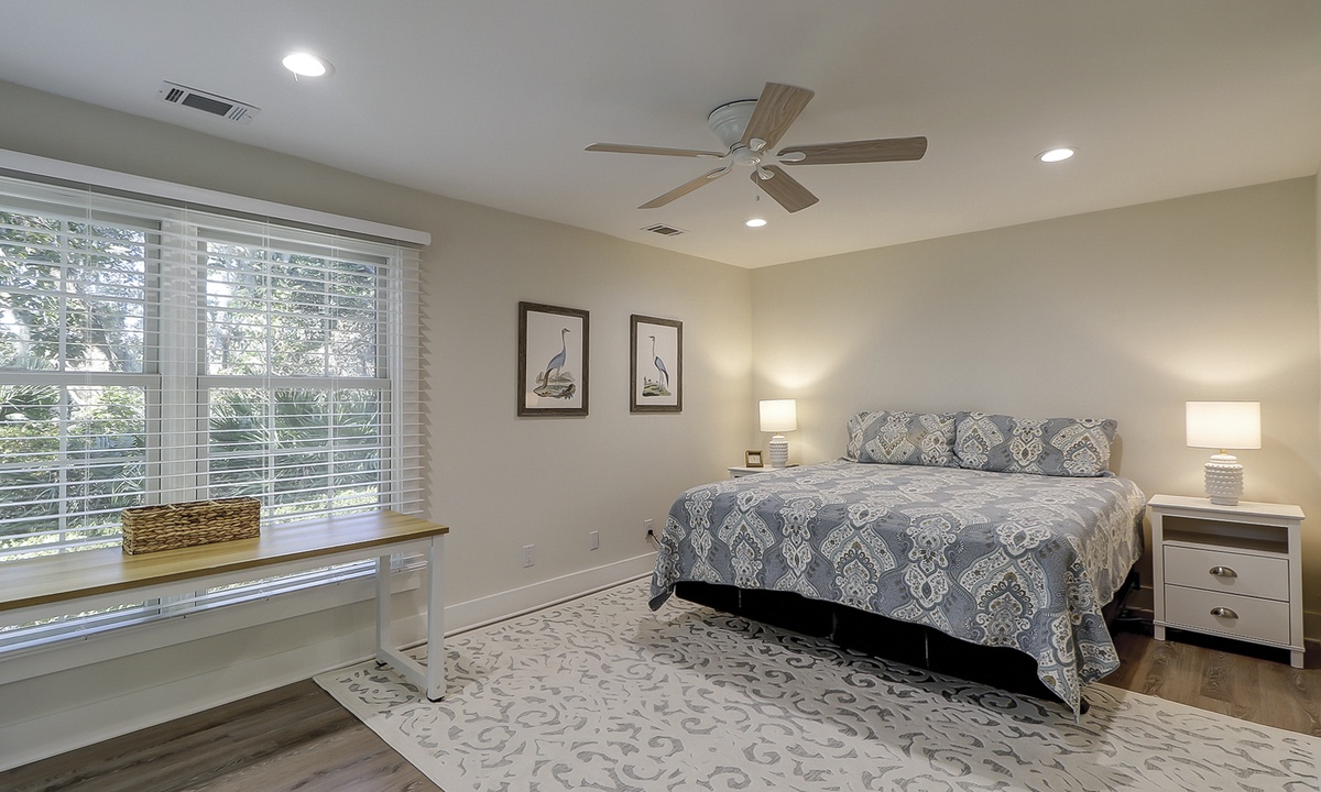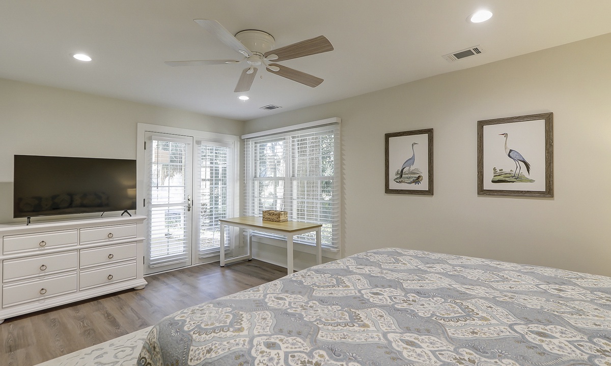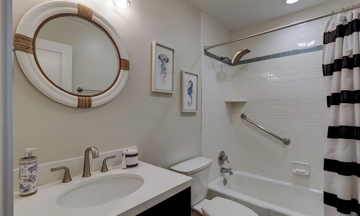 The spacious main bedroom features a king bed, work space, Smart TV and a stunning private bathroom with a large walk-in shower. The bright and airy guest bedroom features 2 twin beds, plenty of closet space, a Smart TV and access to a hall bathroom with a tub/shower combination.