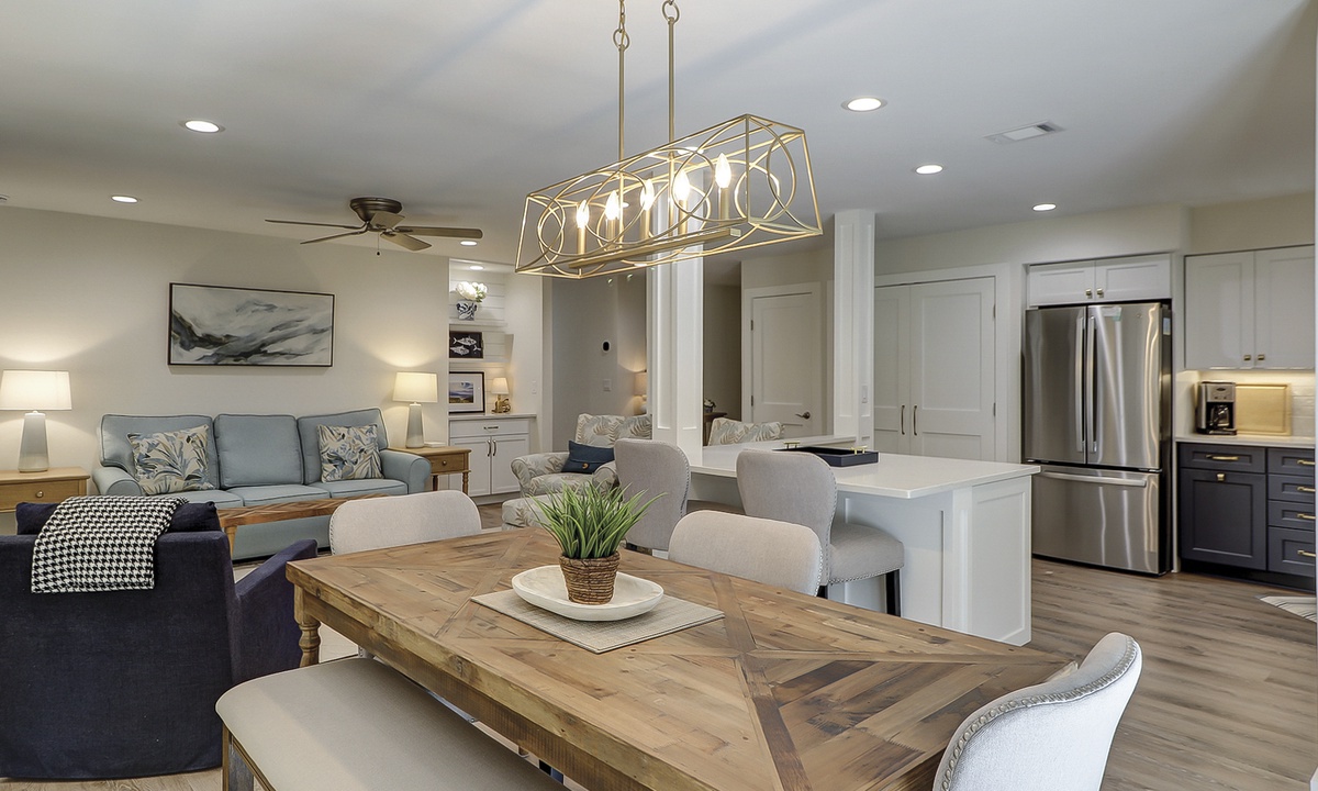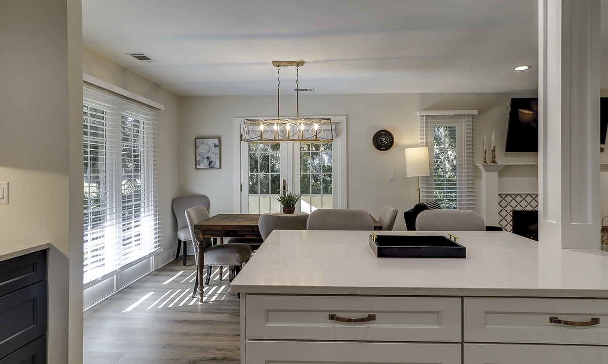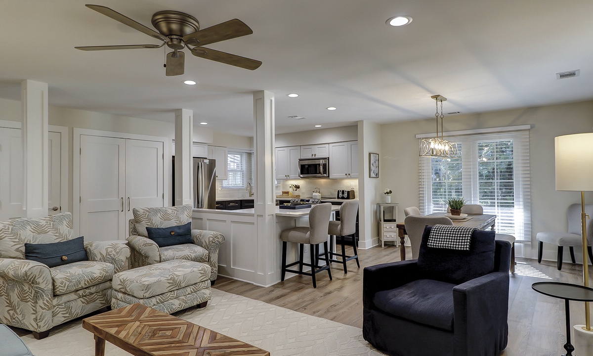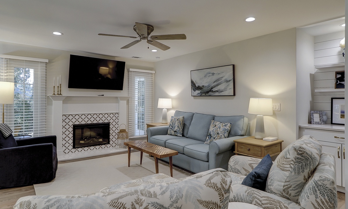 The living area features a sleeper sofa, club chairs, a wall-mounted Smart TV and a decorative fireplace.* The dining area features seating for 6 with additional seating for 2 at the kitchen bar, as well as access to the private patio overlooking the golf course.