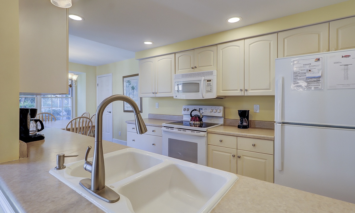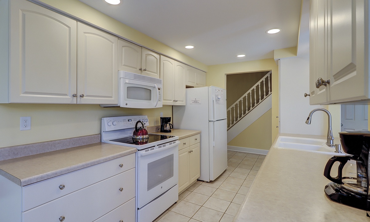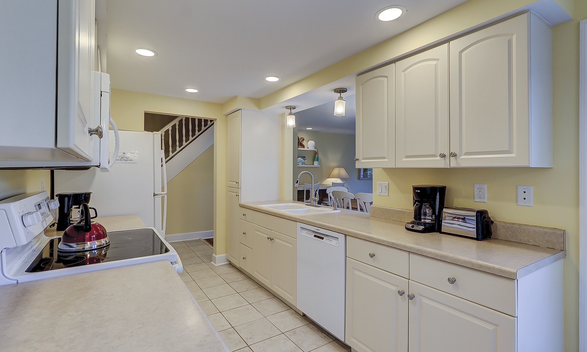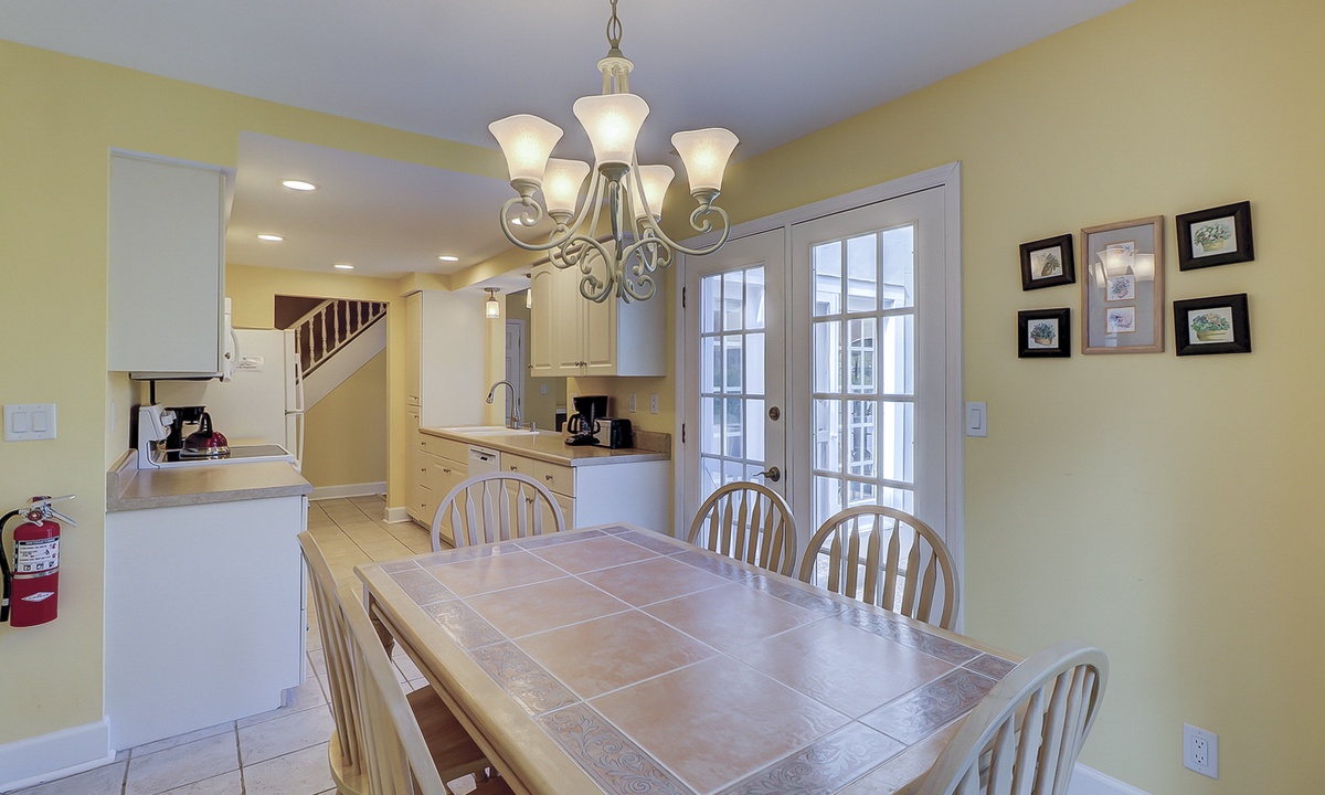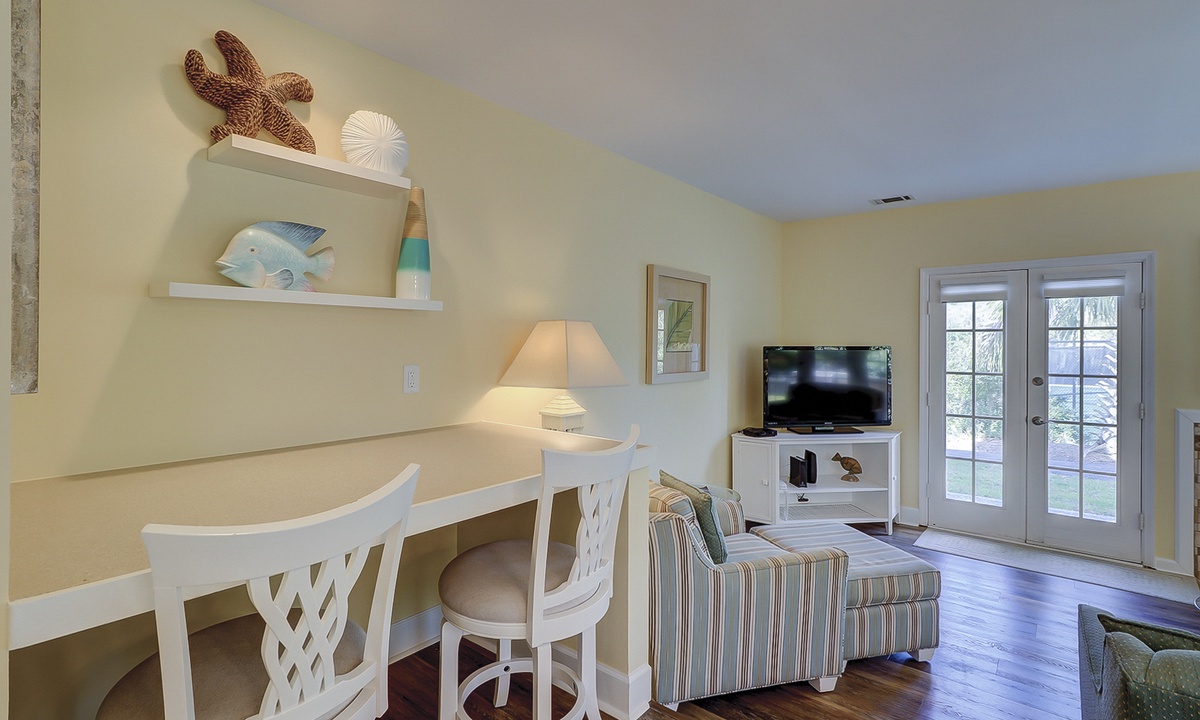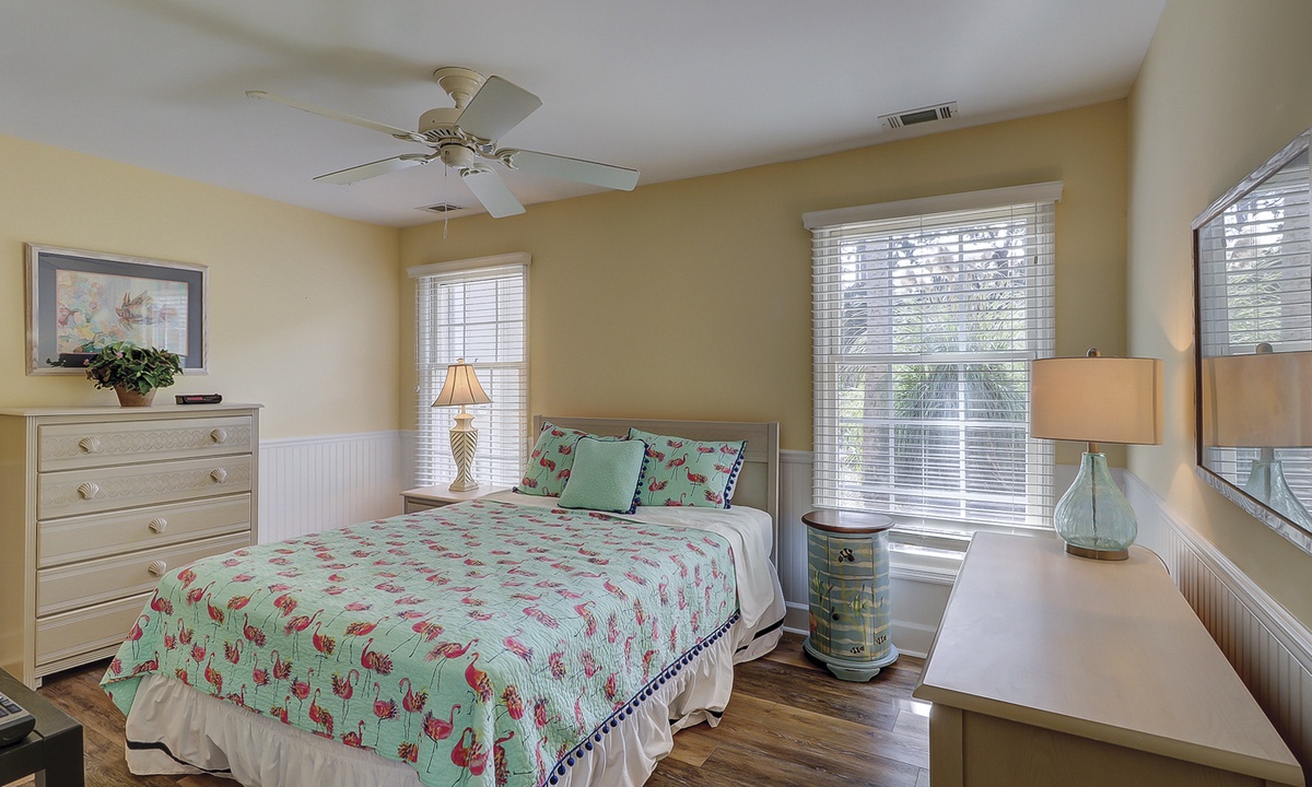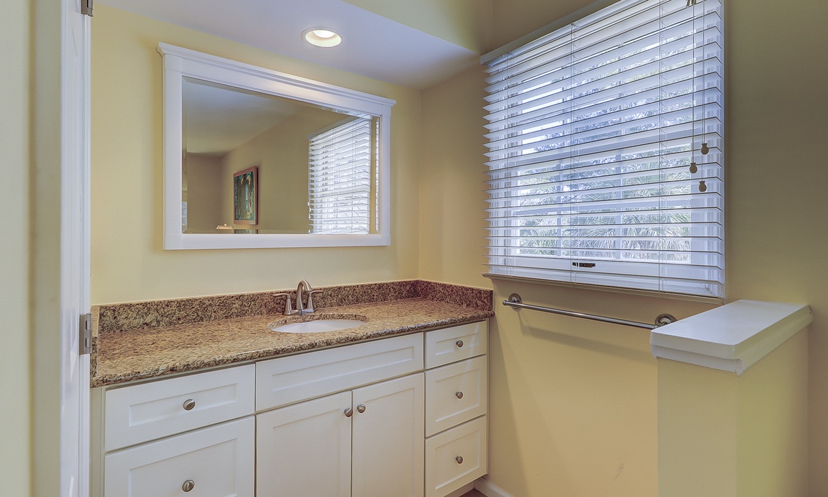 The large kitchen has a sunny breakfast nook with French doors opening to a partially covered patio for outdoor dining and alfresco BBQs, island style! The adjoining formal dining area also includes French doors, as well as a built-in desk for remote working. Take a step down and the light-filled living room awaits you. Completing the first floor layout is a bedroom with a queen bed and a full bath that may be accessed from the hallway, as well.