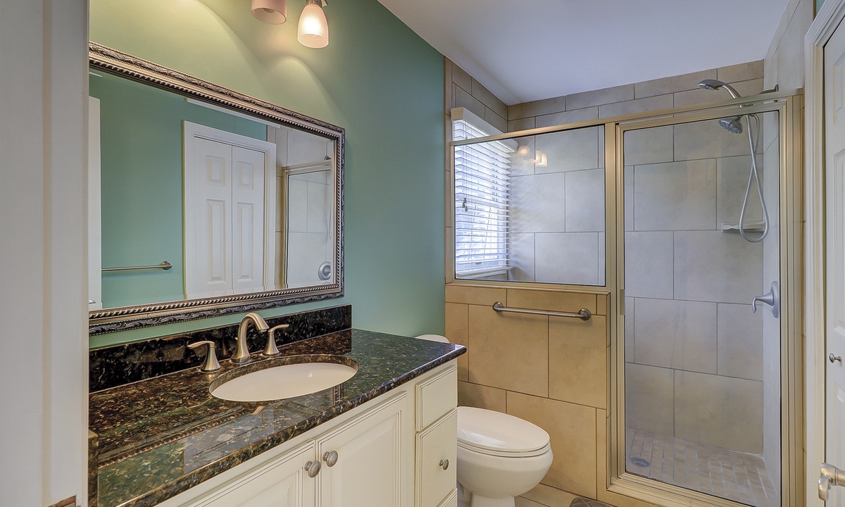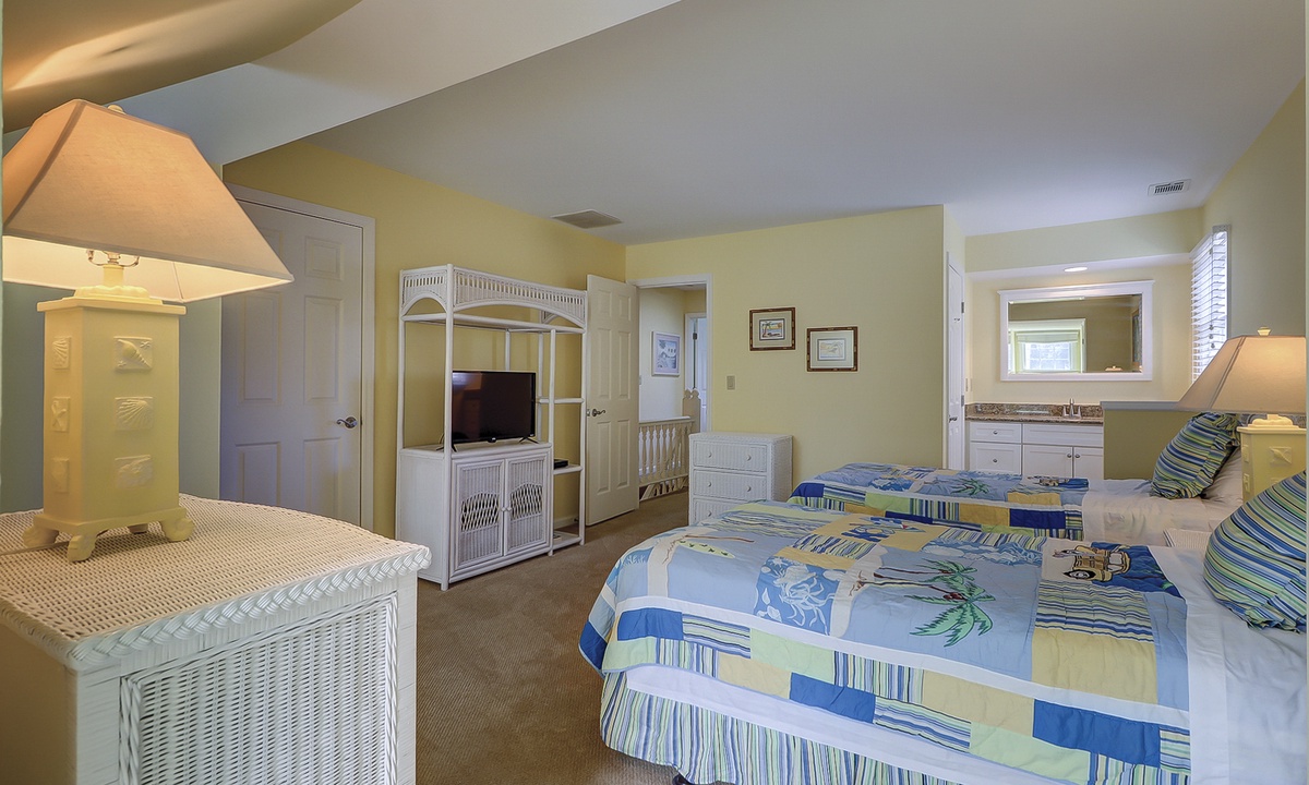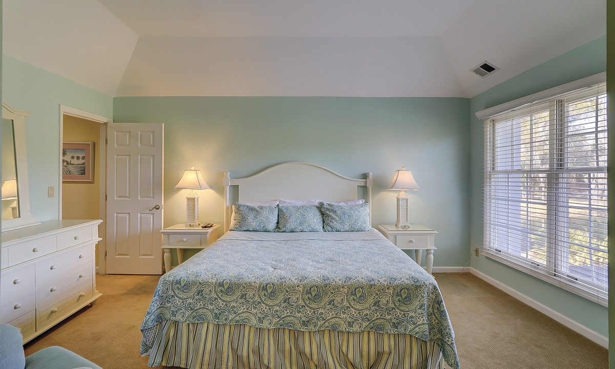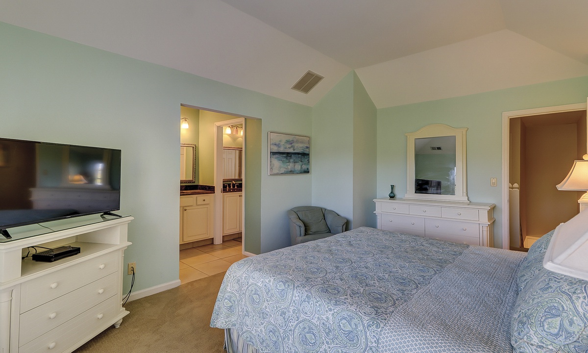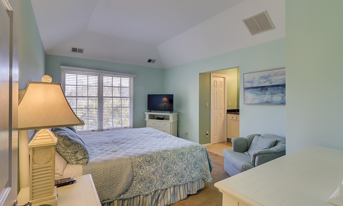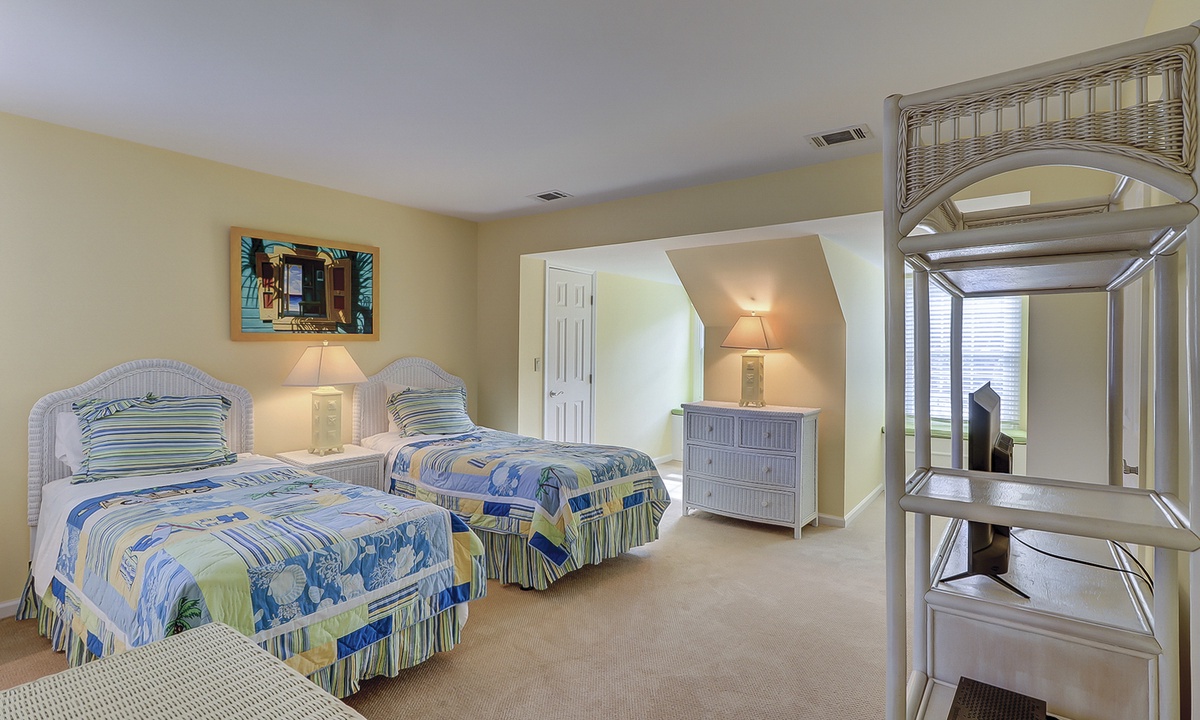 The master bedroom is upstairs and has a king bed and private bath. The large 3rd bedroom is also on the second floor and has 2 twin beds, 2 window seats, and a private bath.