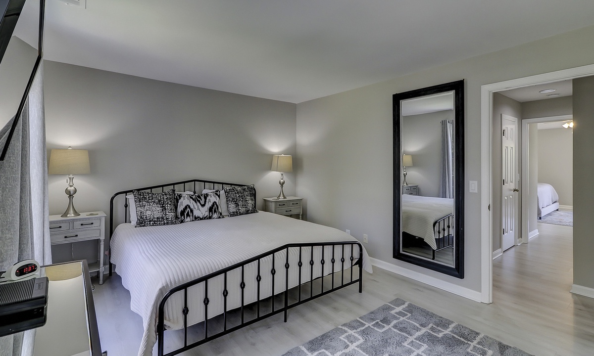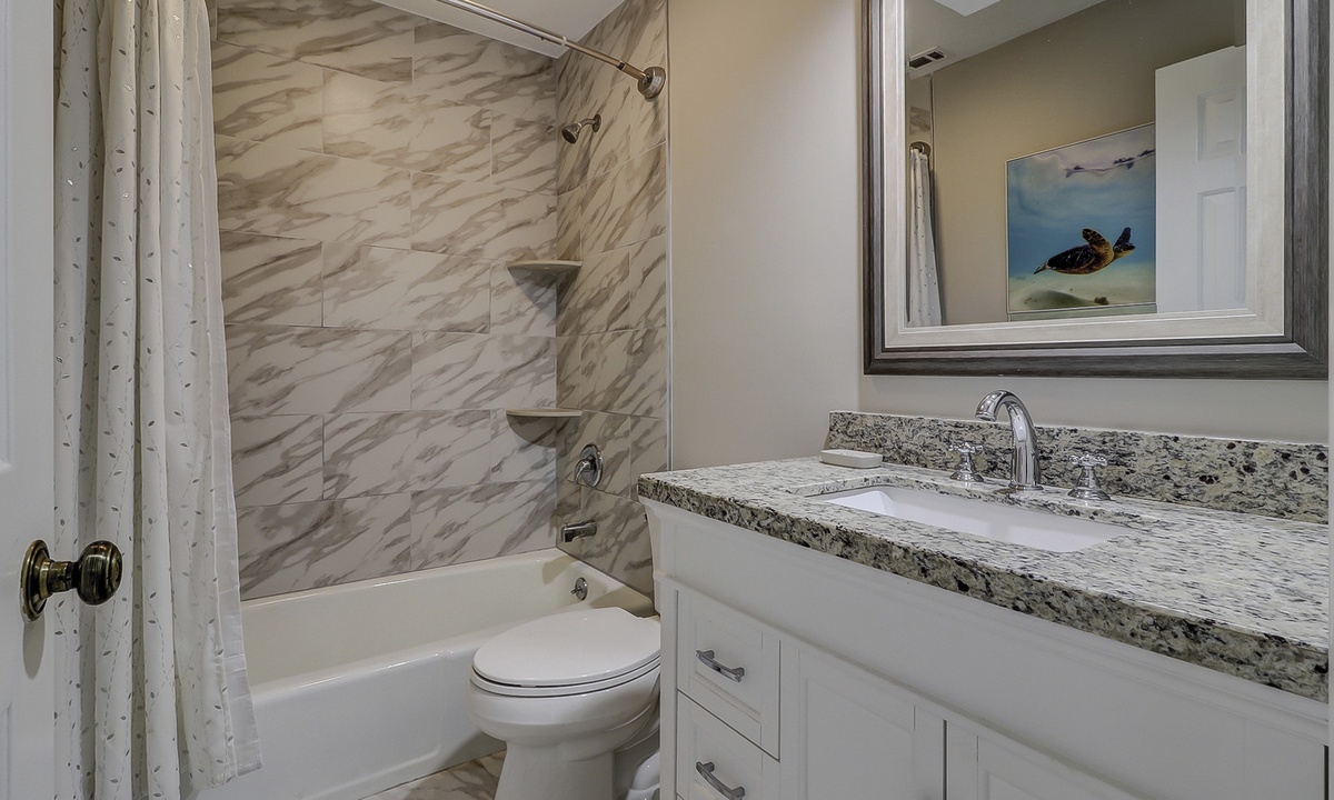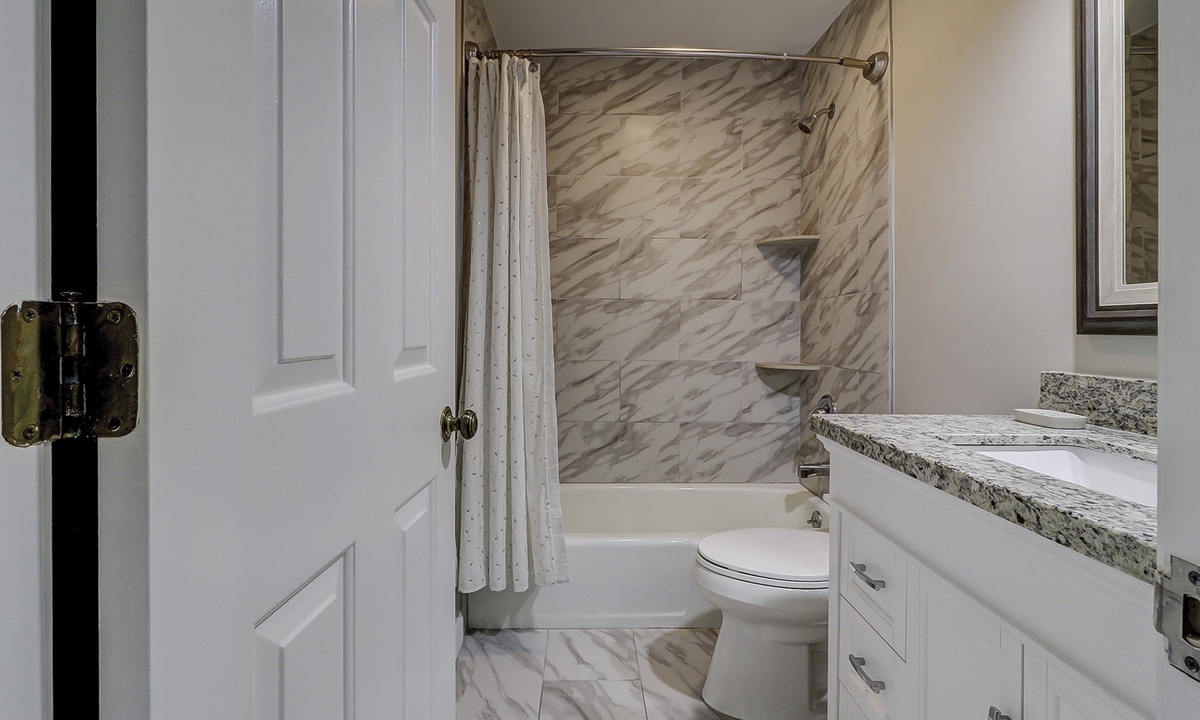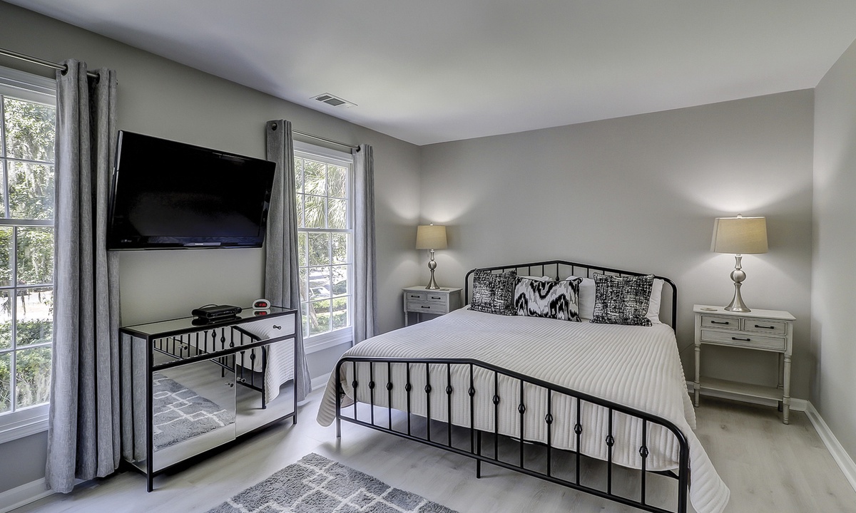 The main bedroom features a king bed, large flat screen TV and a reading nook in between two large windows. The private bathroom features a large, marble top vanity and a walk-in shower with pebbled flooring and decorative tile walls. The guest bedroom also features a king bed and a flat screen TV. The bathroom, located just outside the bedroom, features a tub/shower combination with gorgeous tile work.