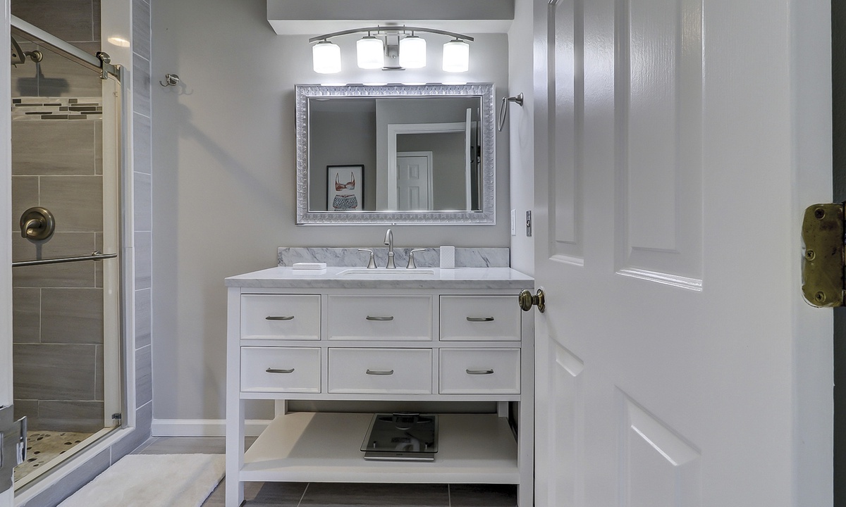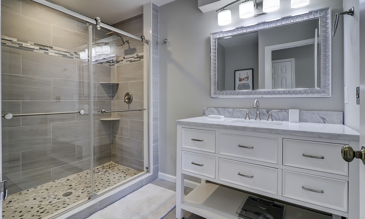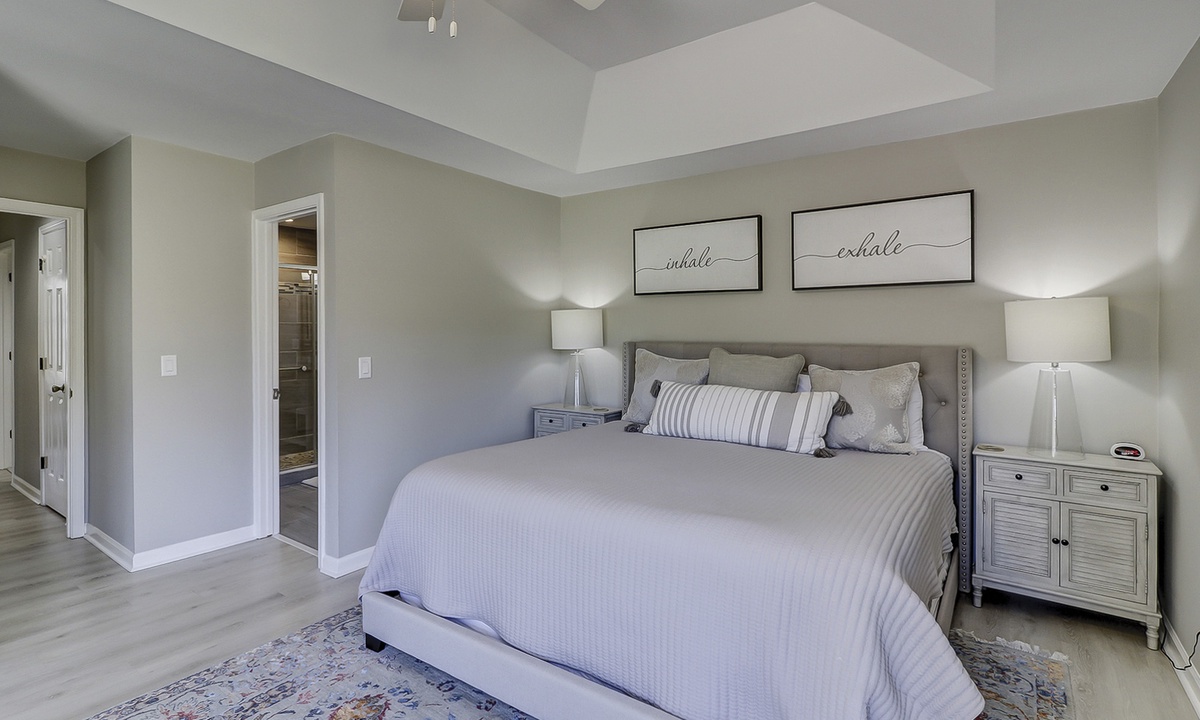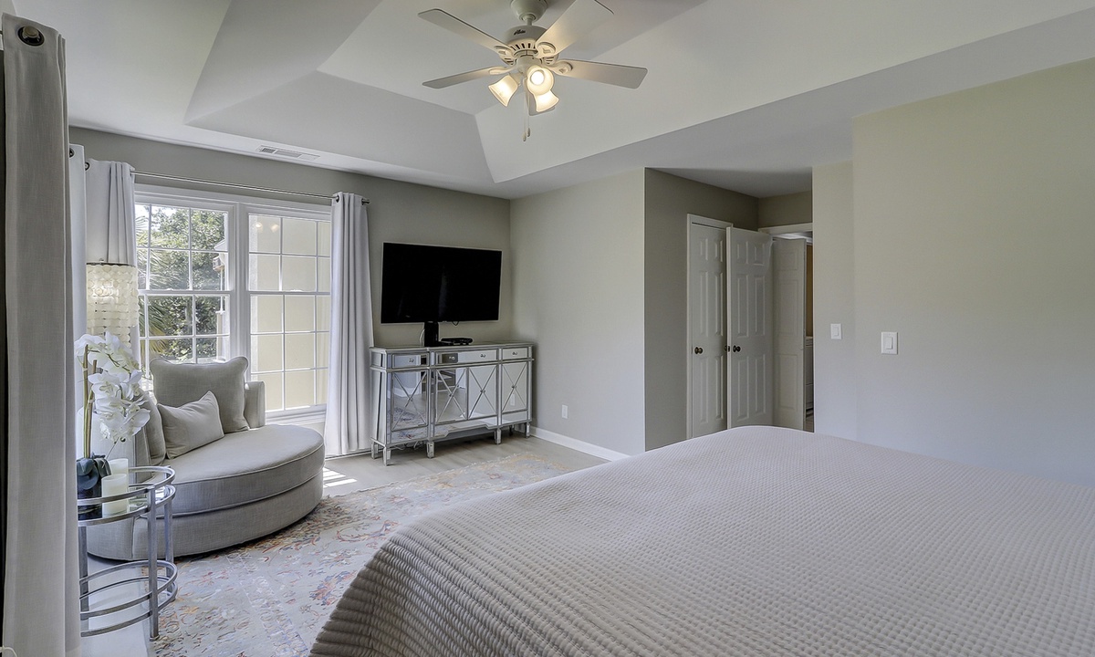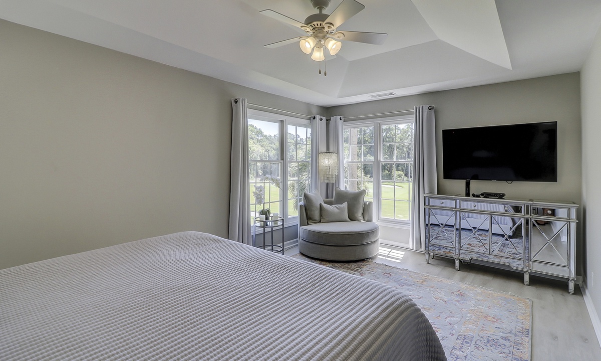 The main bedroom features a king bed, large flat screen TV and a reading nook in between two large windows. The private bathroom features a large, marble top vanity and a walk-in shower with pebbled flooring and decorative tile walls. The guest bedroom also features a king bed and a flat screen TV. The bathroom, located just outside the bedroom, features a tub/shower combination with gorgeous tile work.