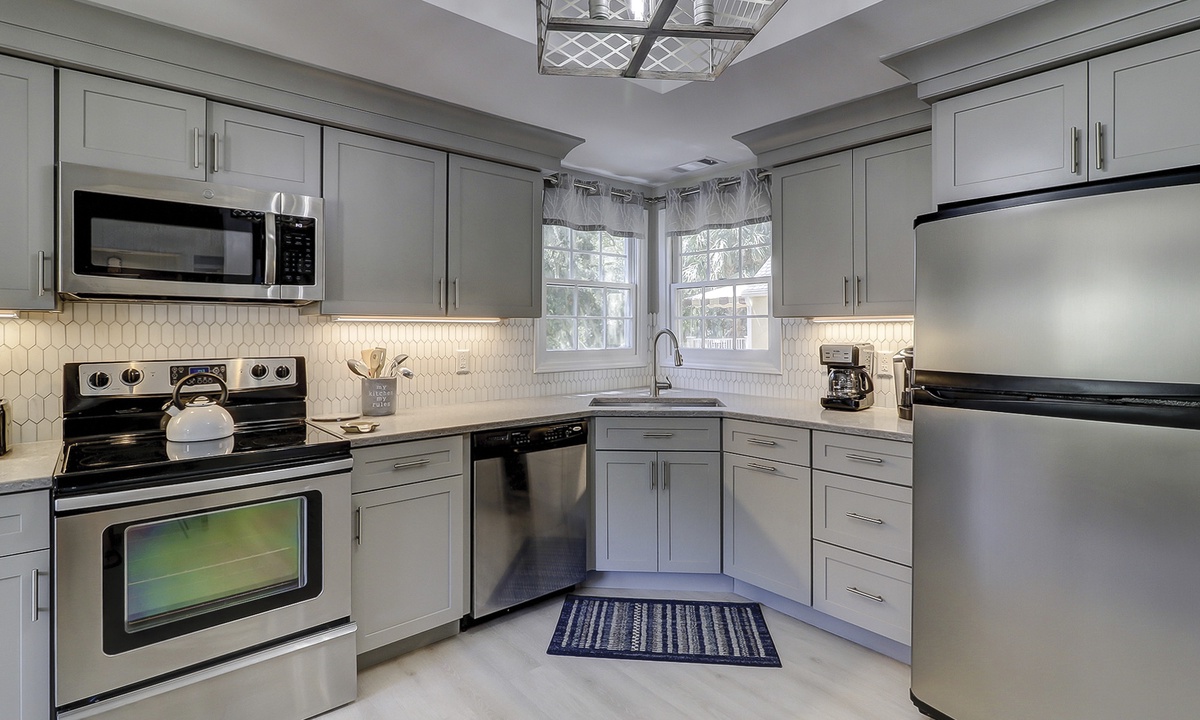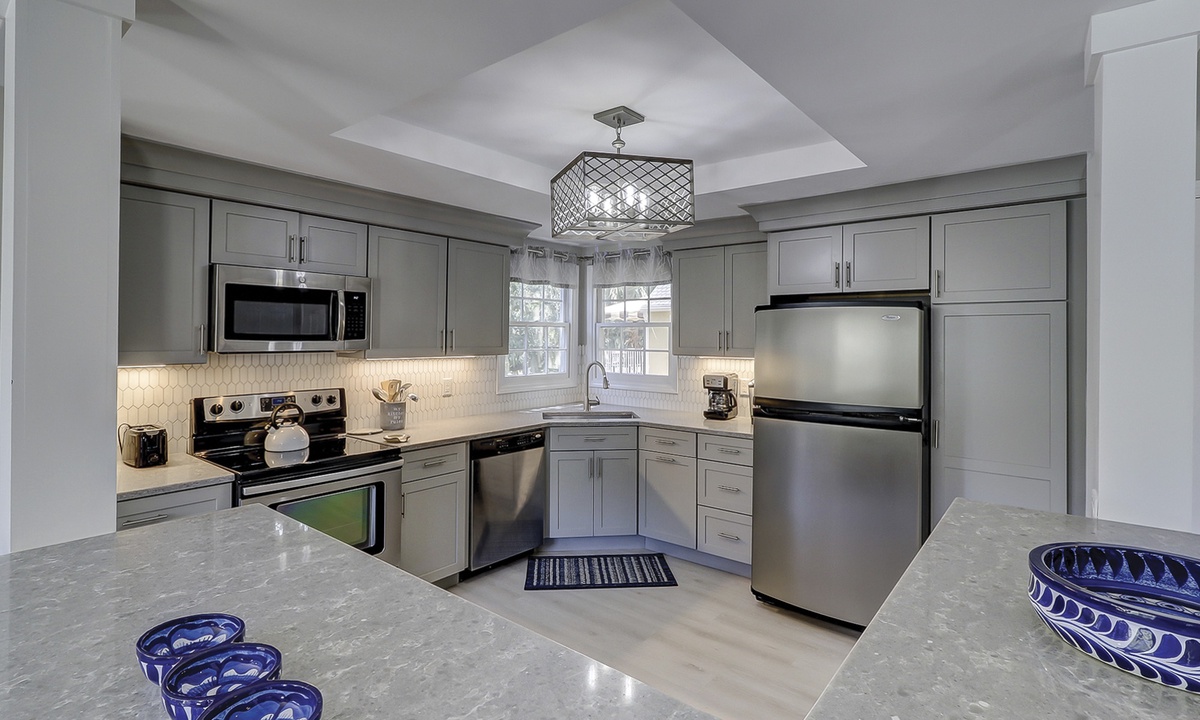 The open floor plan is furnished with wood flooring throughout and large windows that soak the property in natural light. The living area features a large, plush sectional sofa and club chair, a unique desk area, and a large flat screen TV. The spacious kitchen offers custom cabinets, an ornate tile back splash, stainless appliances and over-sized counter tops. The dining area features seating for 6, but there is plenty of space to spread out with additional seating and the kitchen bar. Access to the private patio is located just off the dining area, and it is the perfect spot for outdoor dining while taking in the coastal scenery.
