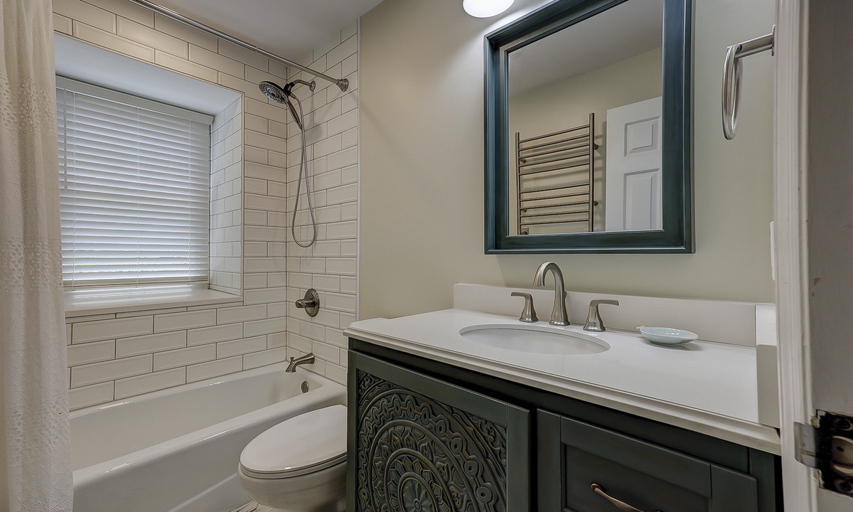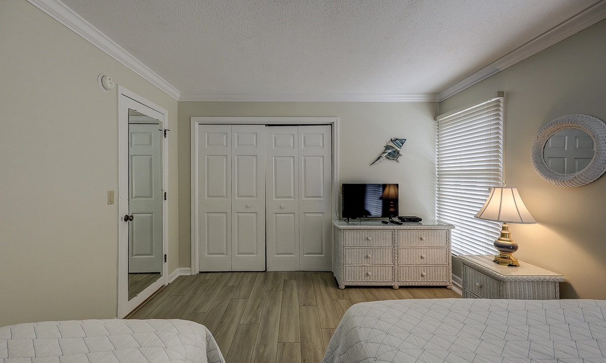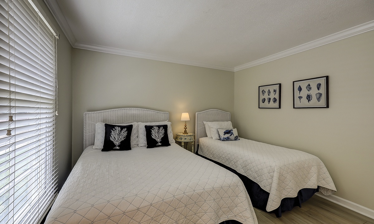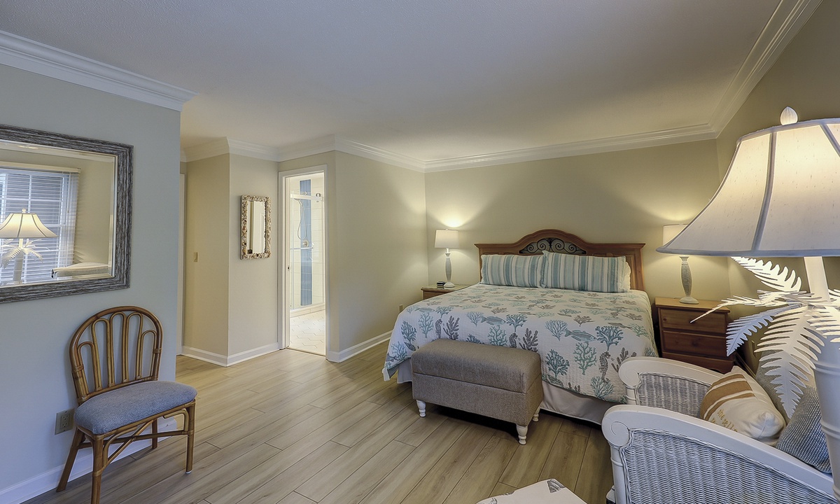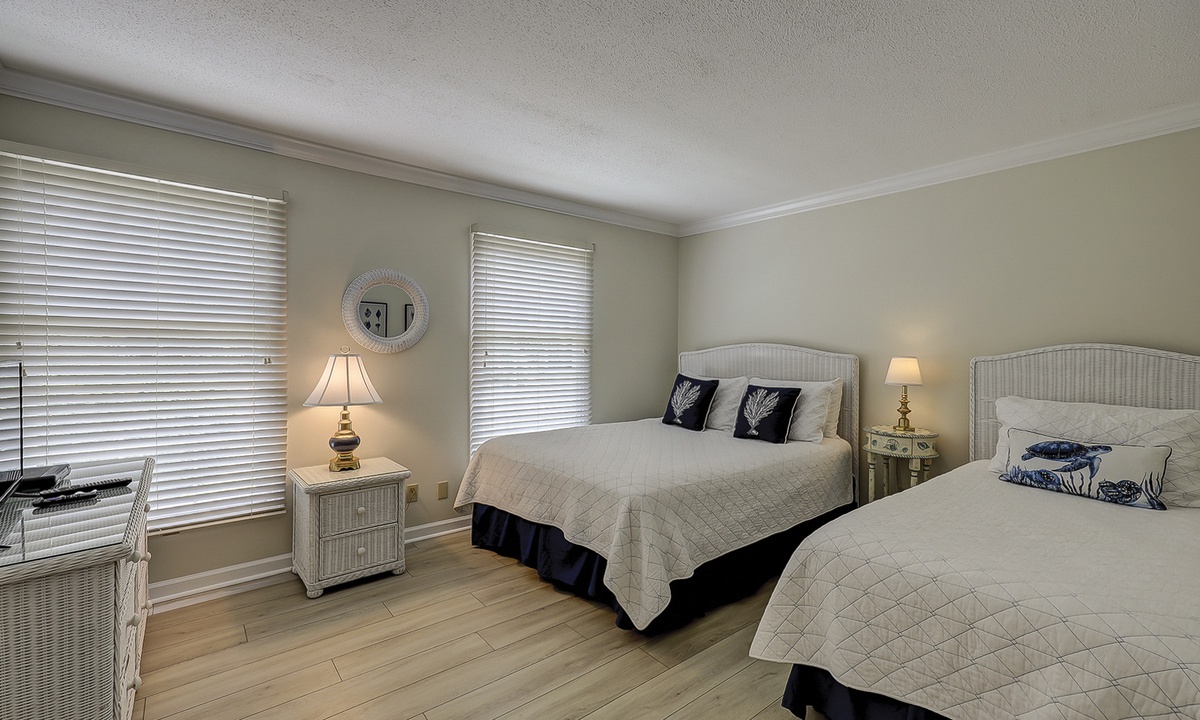 This villa comfortably accommodates up to 7 guests in two beautifully designed bedrooms. Down the hall, the second bedroom features both a queen and twin bed—perfect for families or small groups. The primary bedroom, with its king-sized bed, private newly renovated bath, and smart TV, offers a serene retreat, complete with ample space for your belongings and a restful atmosphere for the ultimate relaxation.