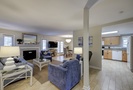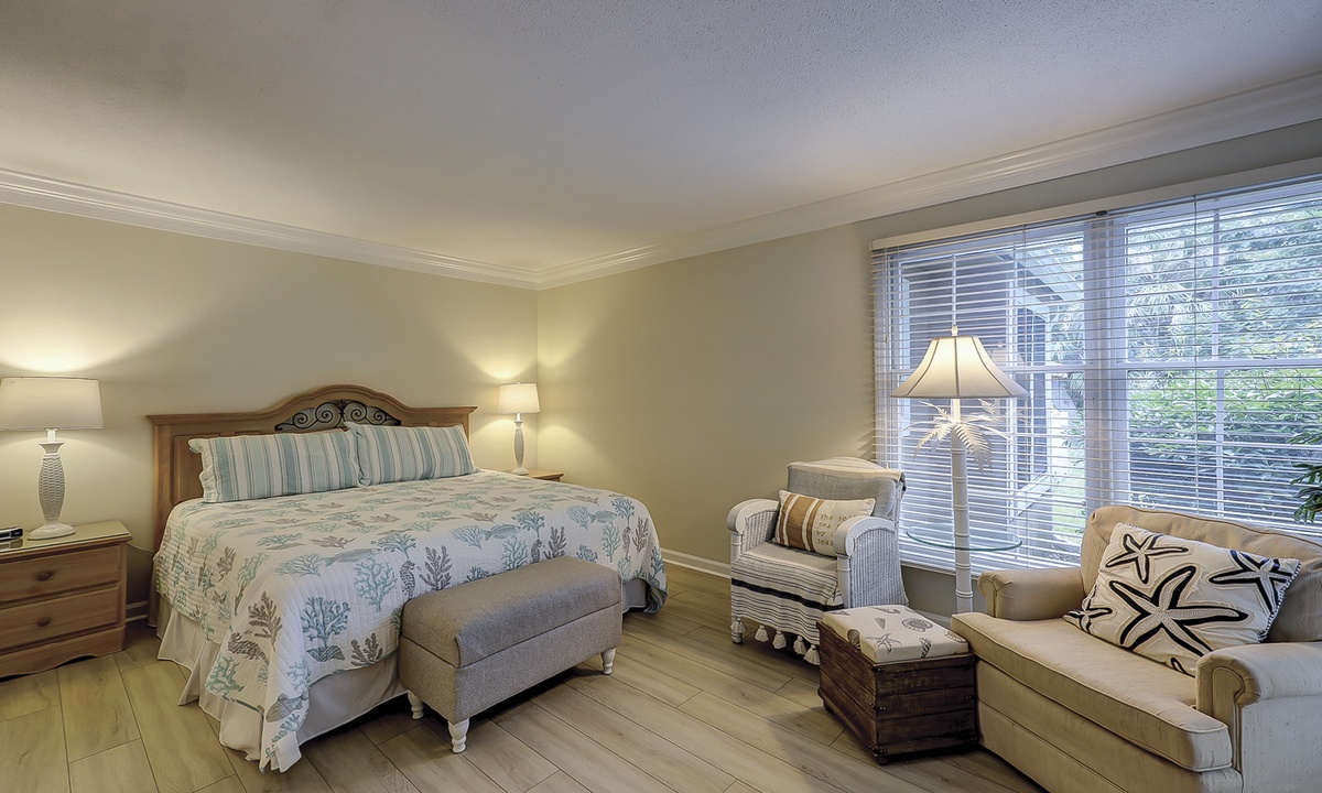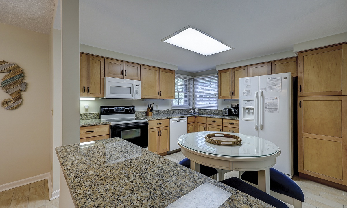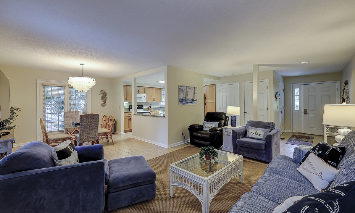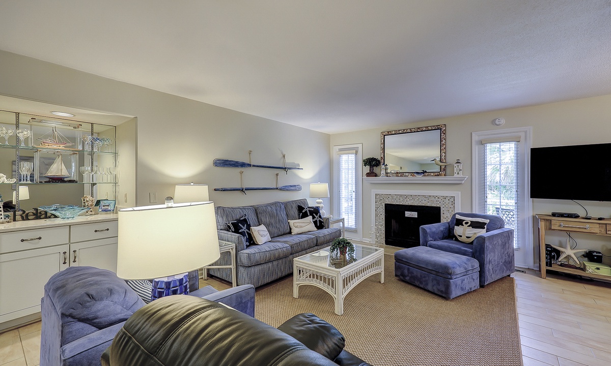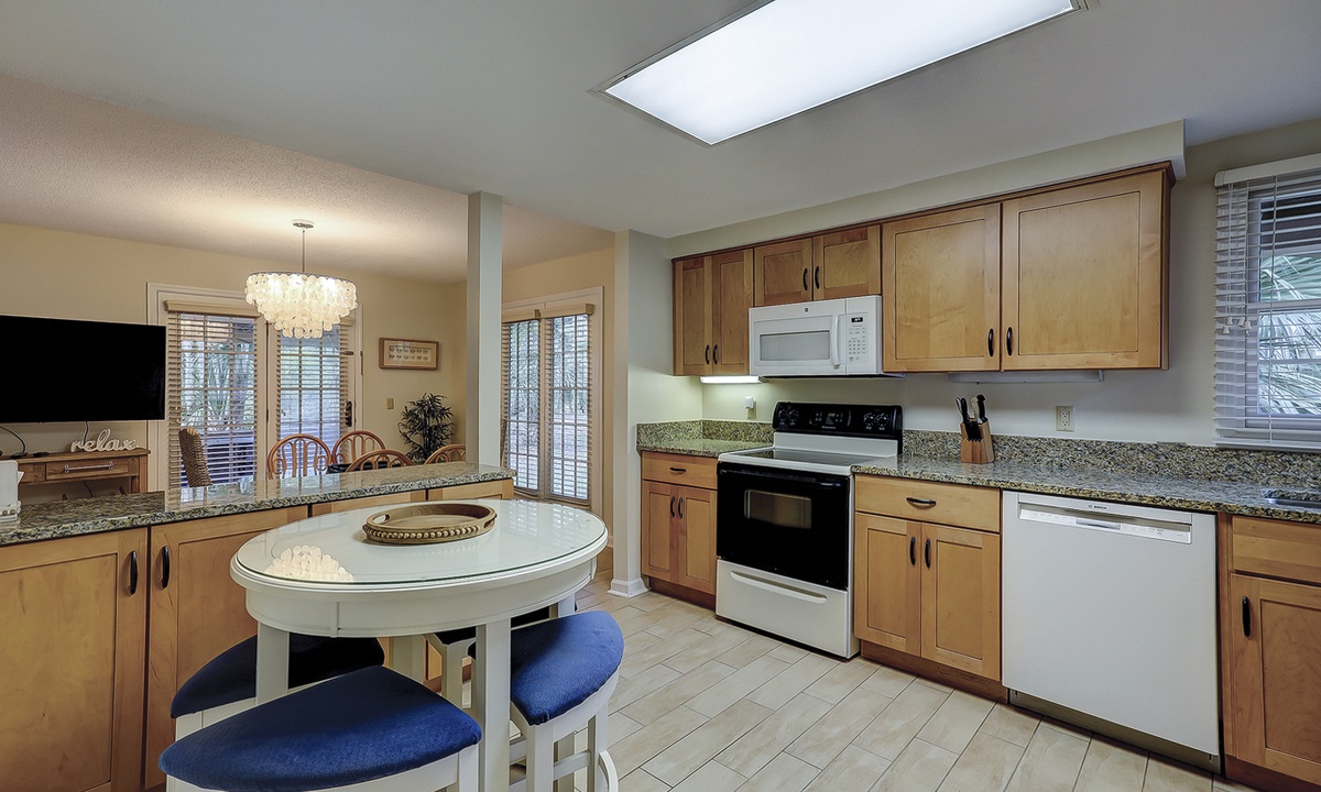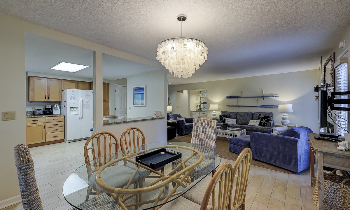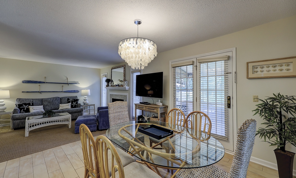 The cozy family room invites relaxation with ample seating and a sleeper sofa, as well as a 55” smart TV with standard cable and streaming capabilities to keep you entertained after a day of outdoor adventures. Whether you’re heading to the beach, hitting the tennis courts, or swimming in the pool, this villa offers the perfect space to unwind in the evenings.