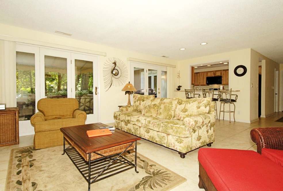 Straight through the entry foyer leads to a spacious corner living room with a built-in wet bar, a lovely seating group of a sofa and 3 side chairs, a TV/VCR/DVD, and windows/French doors on 2 sides; 1 with a lagoon view, and 2 opening to the deck, which has a covered dining table.