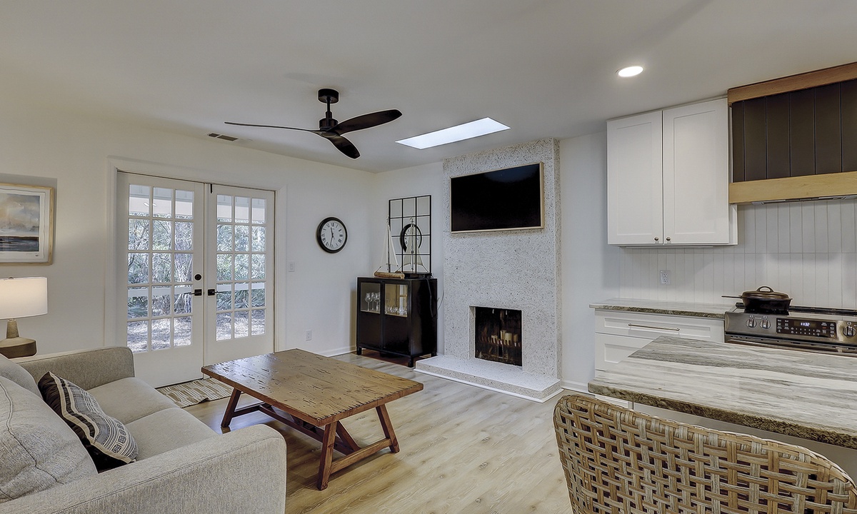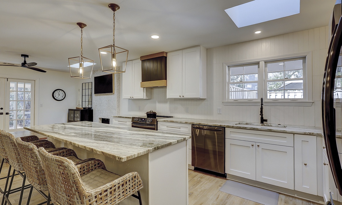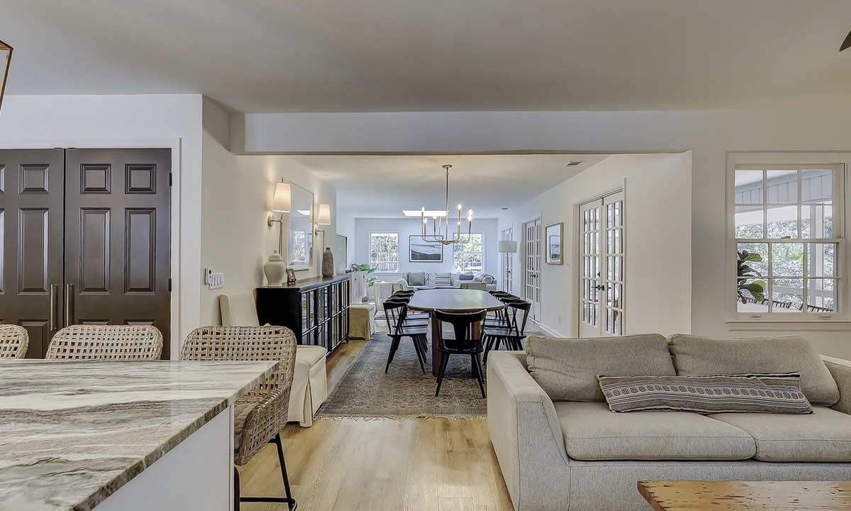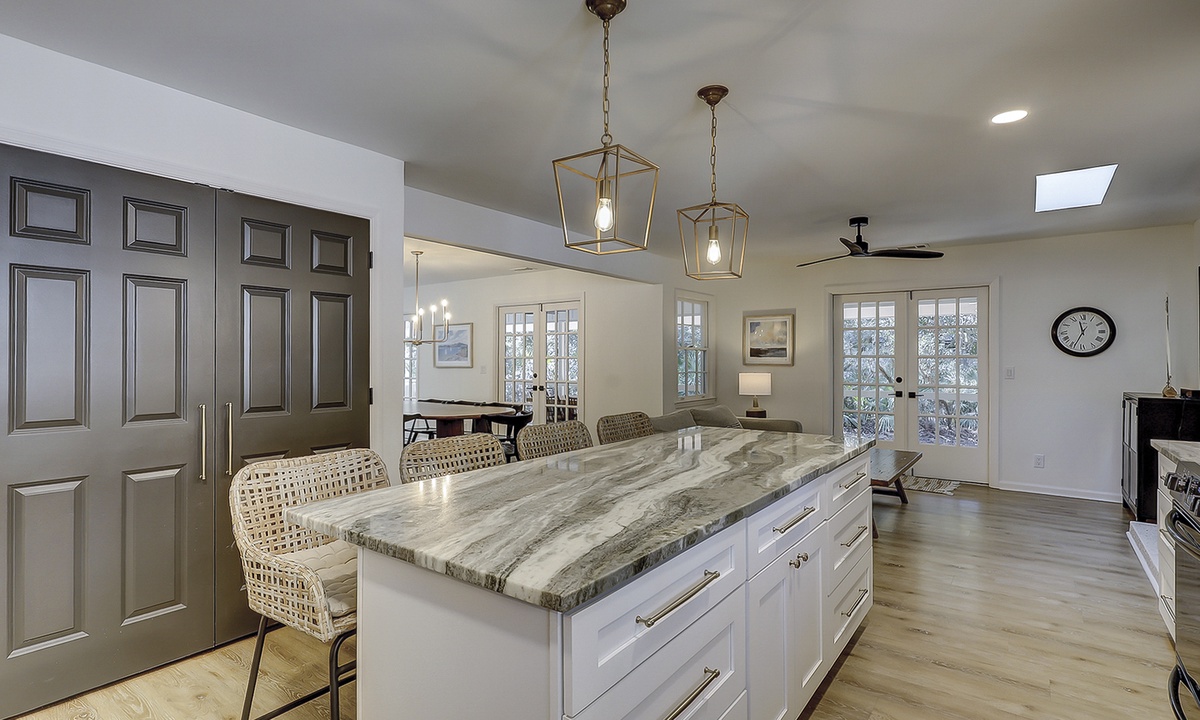 As you enter this new Sea Pines luxury home you’re greeted with custom wood flooring, natural light, and thoughtful coastal inspired décor throughout. The stair-free first level features two open living spaces, a gourmet kitchen, large dining room, private laundry room, two bedrooms, and a small office space. Bring the family together in the first floor living room that features comfy seating options and a new Samsung Frame TV to catch up on your favorite shows. The dining area, located to the right of the living room, features ample seating as well as views of the screened-in porch and surrounding Lowcountry. The second living area features a comfortable sleeper sofa and Smart TV and is the perfect place for overflow guests. The kitchen will easily be one of your favorite areas of this home. Featuring a large island with additional seating, brand-new appliances, plenty of cabinet and counter space, the kitchen is equipped with everything you’ll need to prepare a meal for your family.