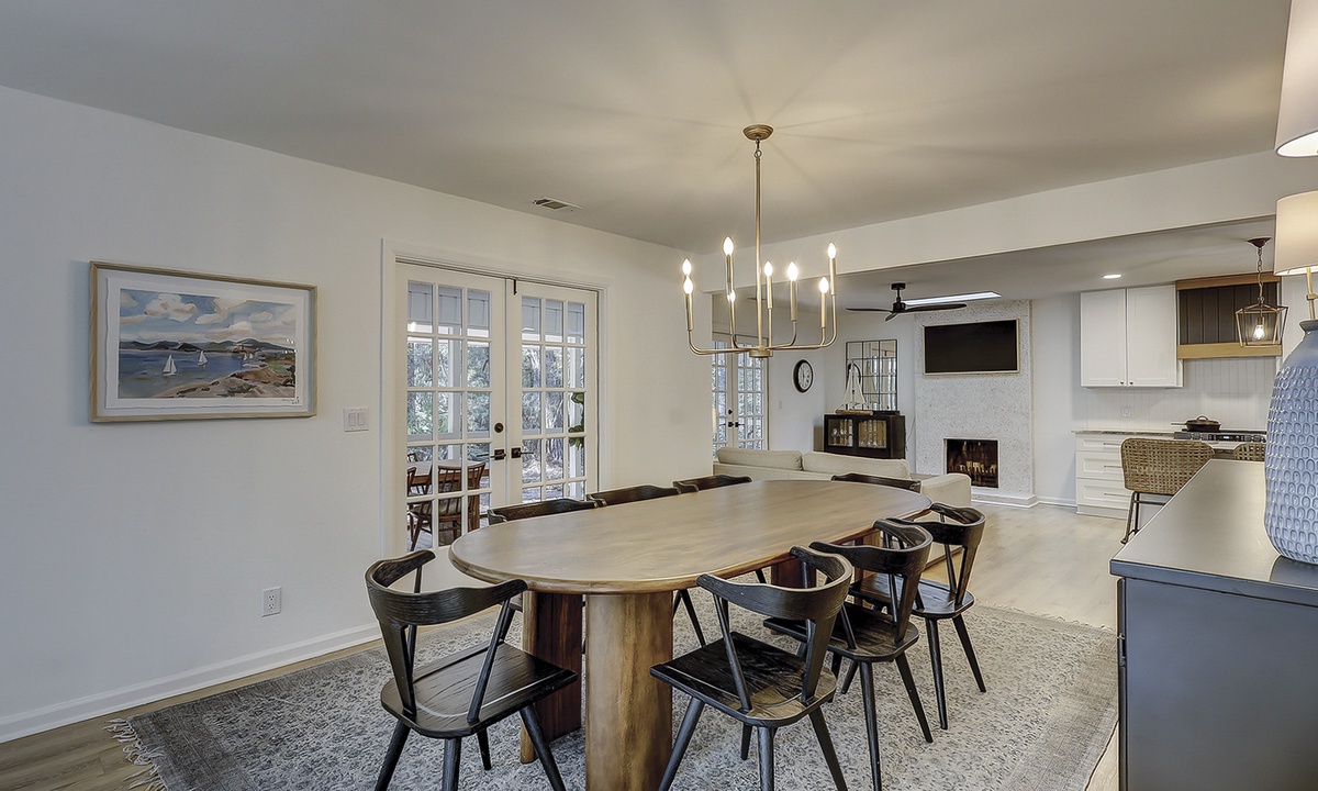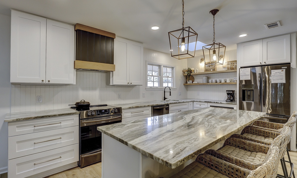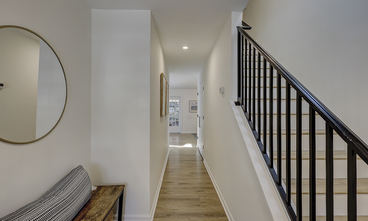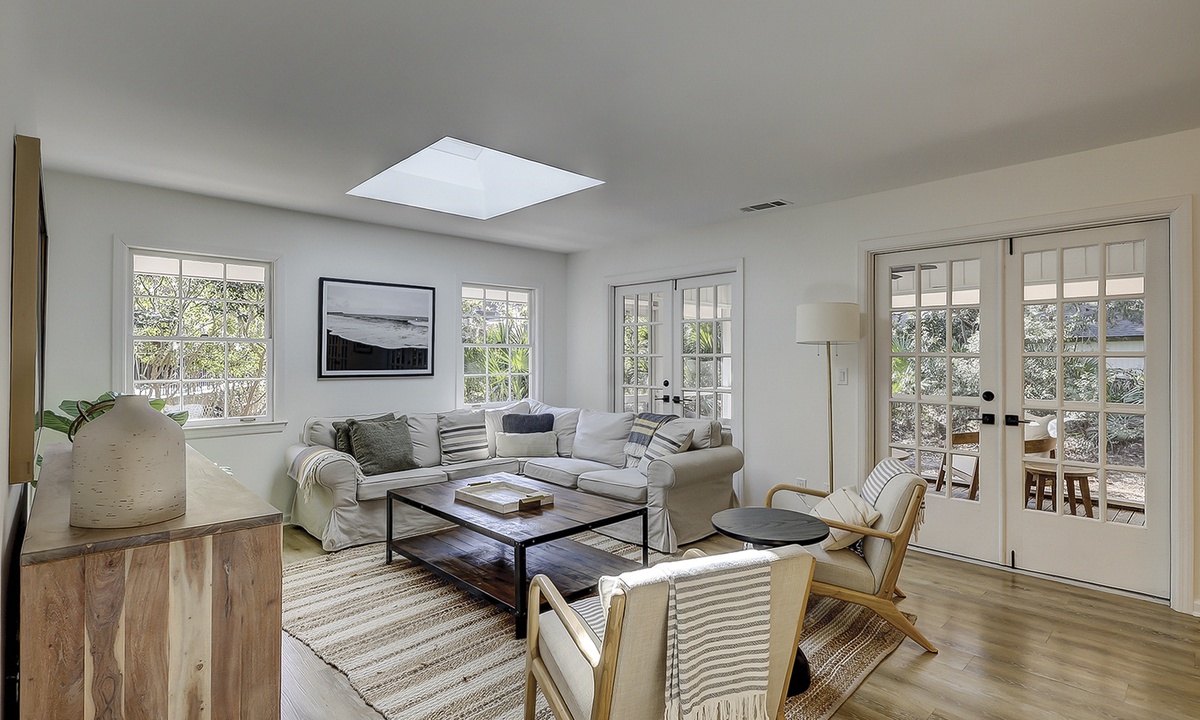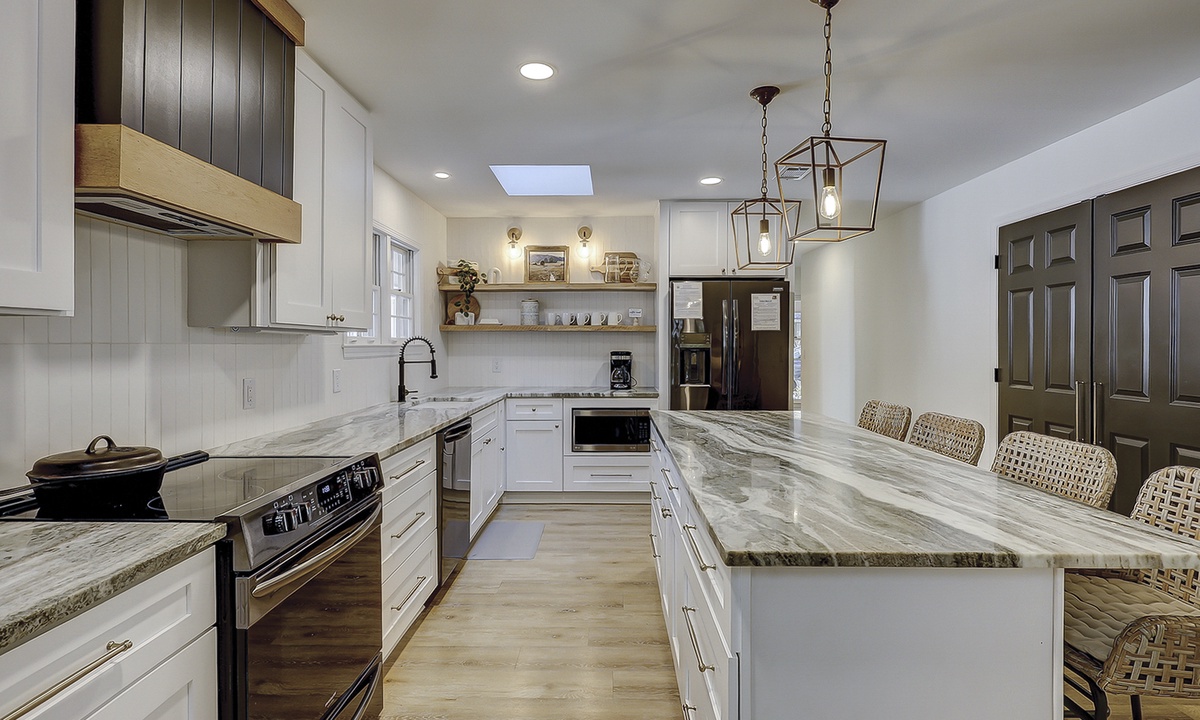As you enter this new Sea Pines luxury home you’re greeted with custom wood flooring, natural light, and thoughtful coastal inspired décor throughout. The stair-free first level features two open living spaces, a gourmet kitchen, large dining room, private laundry room, two bedrooms, and a small office space. Bring the family together in the first floor living room that features comfy seating options and a new Samsung Frame TV to catch up on your favorite shows. The dining area, located to the right of the living room, features ample seating as well as views of the screened-in porch and surrounding Lowcountry. The second living area features a comfortable sleeper sofa and Smart TV and is the perfect place for overflow guests. The kitchen will easily be one of your favorite areas of this home. Featuring a large island with additional seating, brand-new appliances, plenty of cabinet and counter space, the kitchen is equipped with everything you’ll need to prepare a meal for your family.