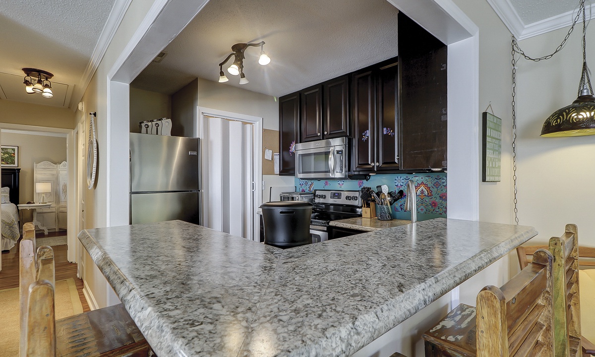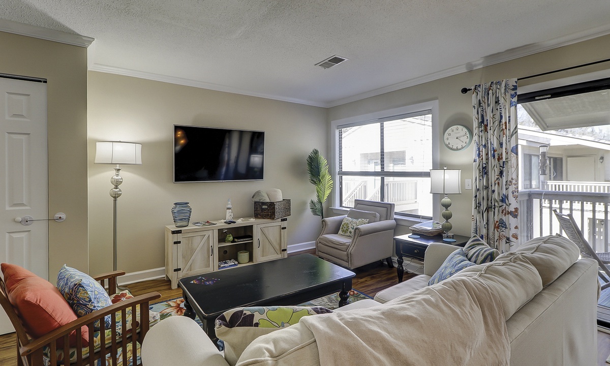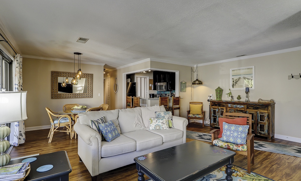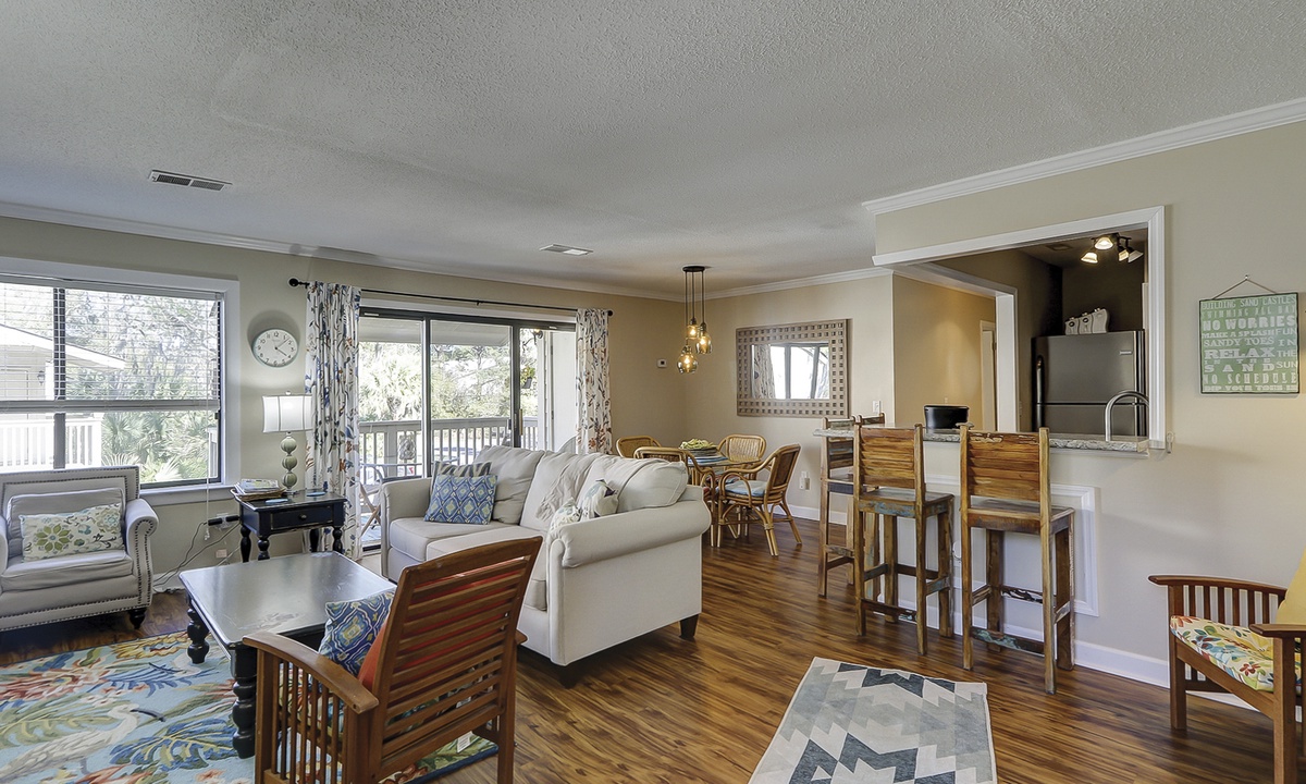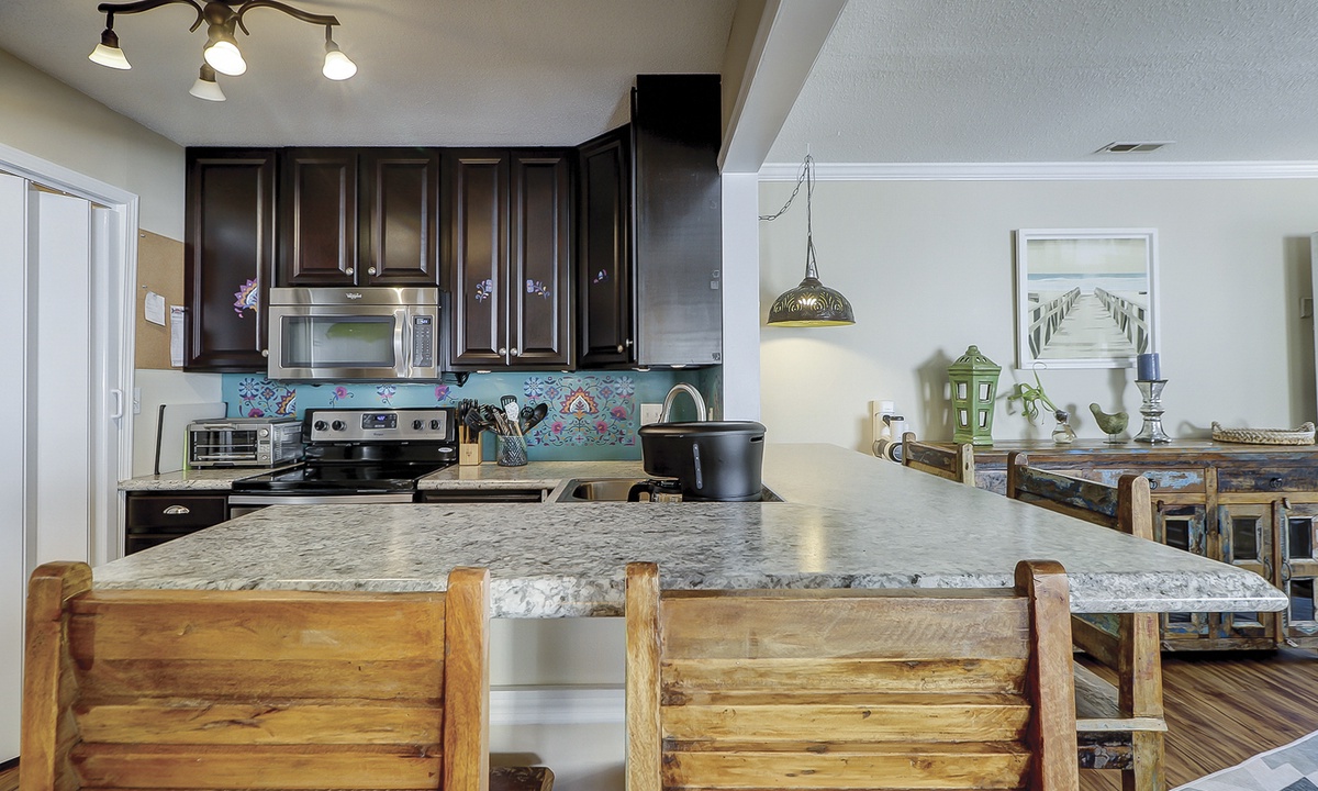 Step into beach style in this 2nd level villa! The open living room has a beachy feel with comfortable seating options, a flat screen TV, and access to the private deck through the sliding doors. This is the perfect space to come together with your family after a fun day on the beach and play a game or catch your favorite TV show (streaming; cable available). The chef in your group will enjoy the beautifully updated kitchen with stainless appliances, granite countertops, and breakfast bar with seating for four. When it's dinnertime, the dining room table hosts four comfortably or head out to the deck to dine al fresco.