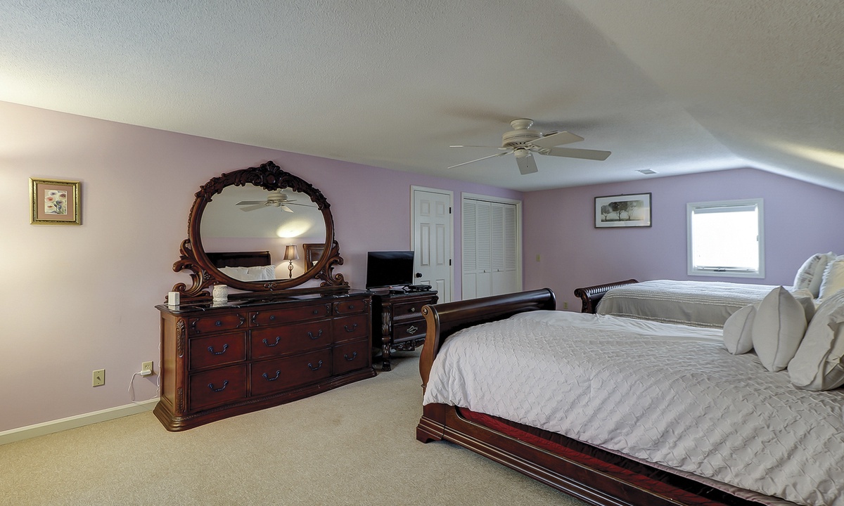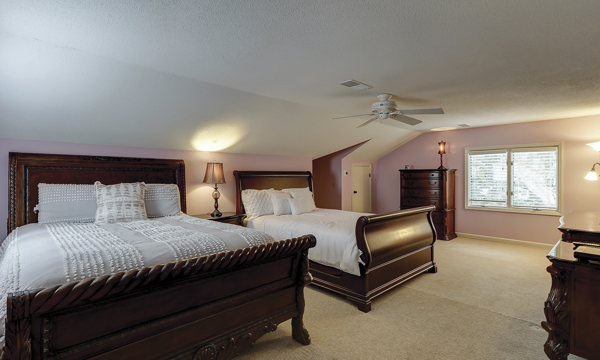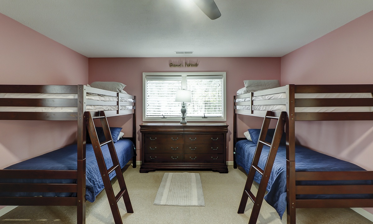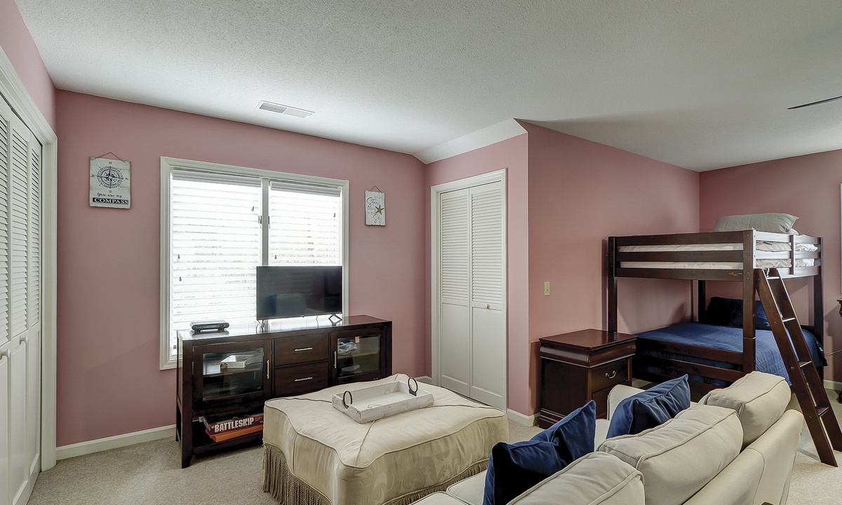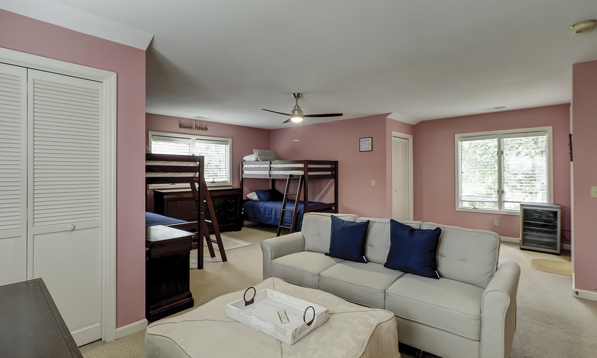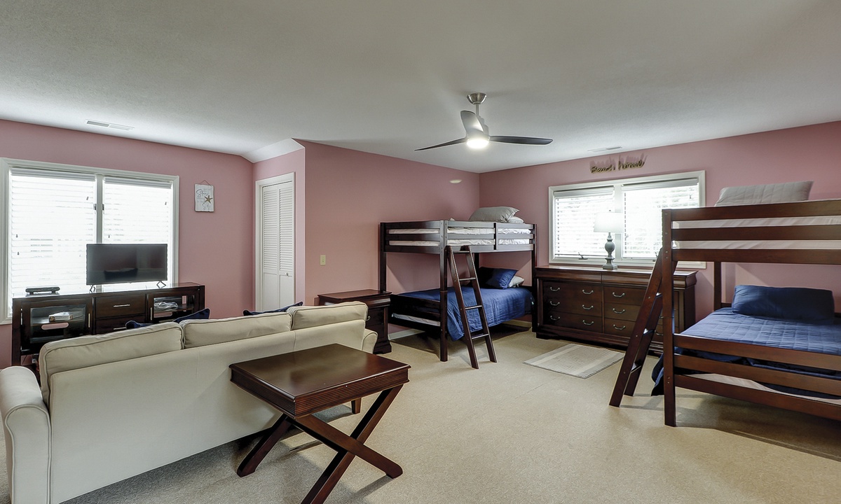 The second floor features a large, fun-filled bunk room with two sets of twin bunks, a sofa, a flat-screen Roku TV, and a variety of board games. Just off the bunk room, up a half-flight of stairs, is a room with two queen beds and a flat-screen Roku TV. Both rooms share a full bathroom.