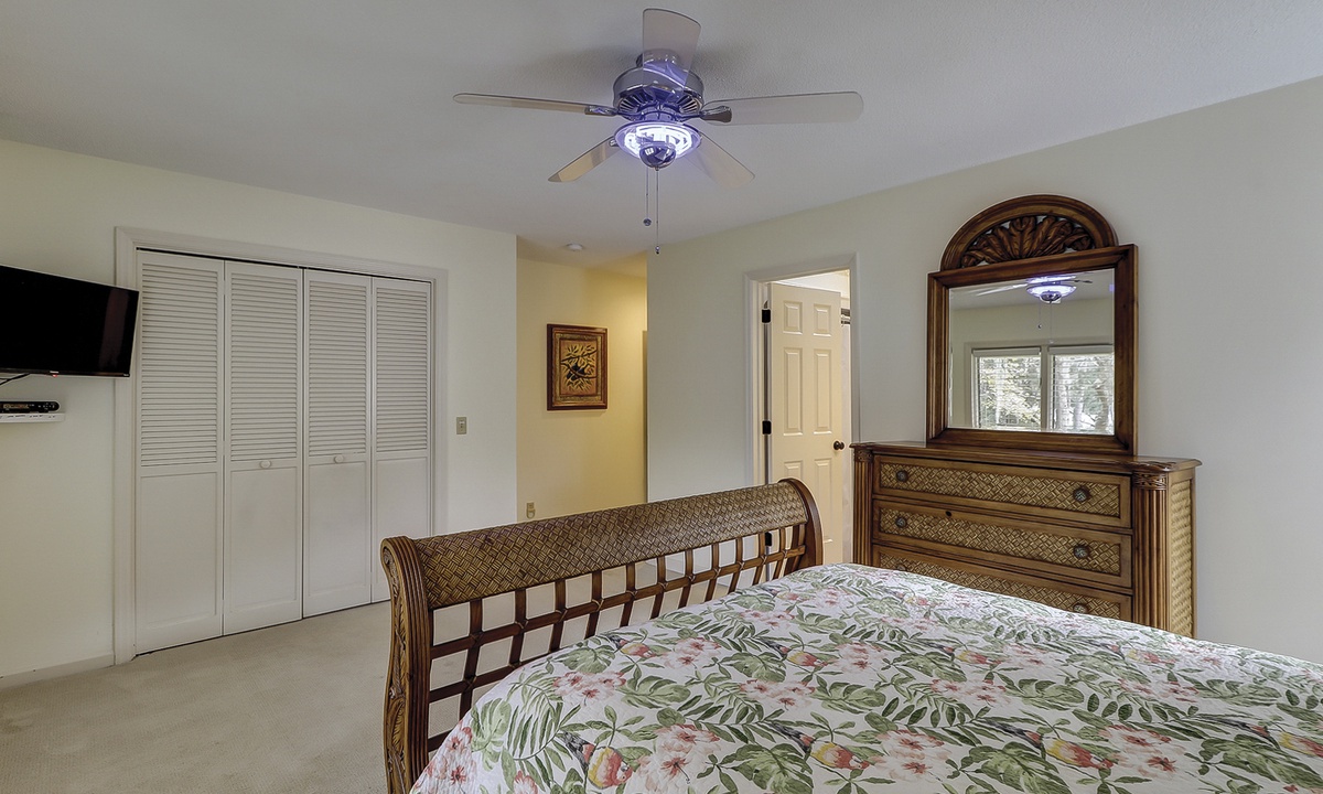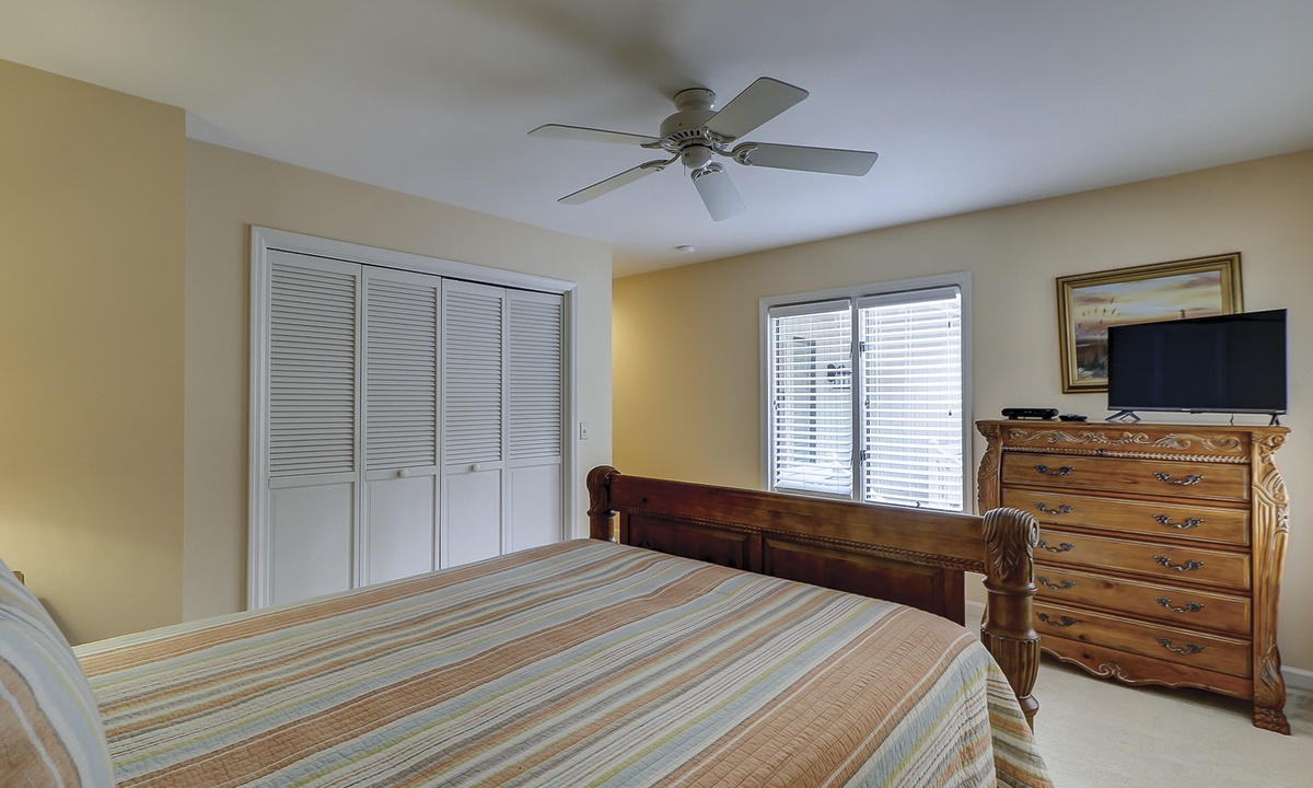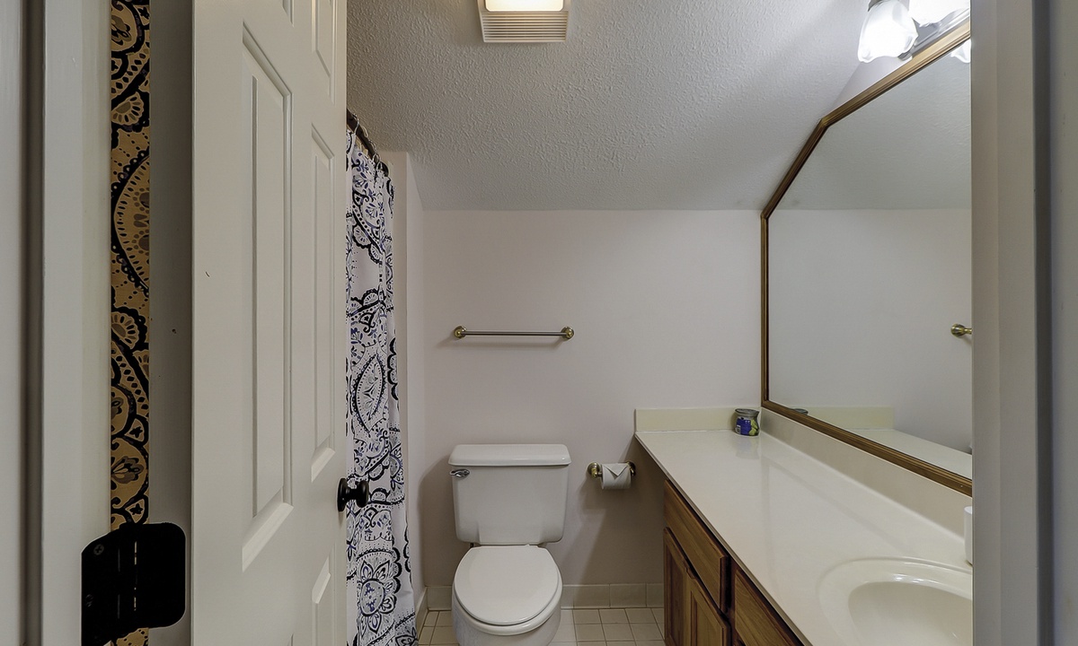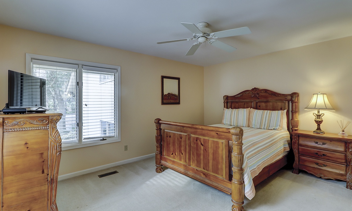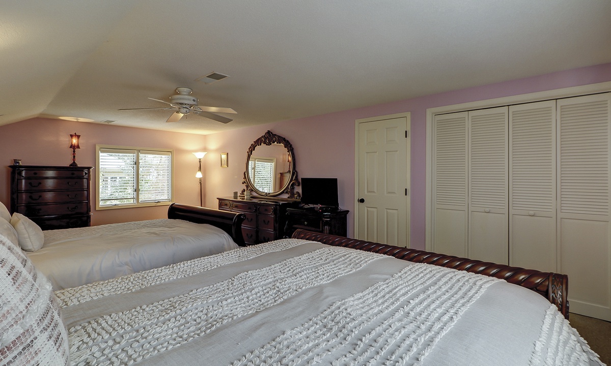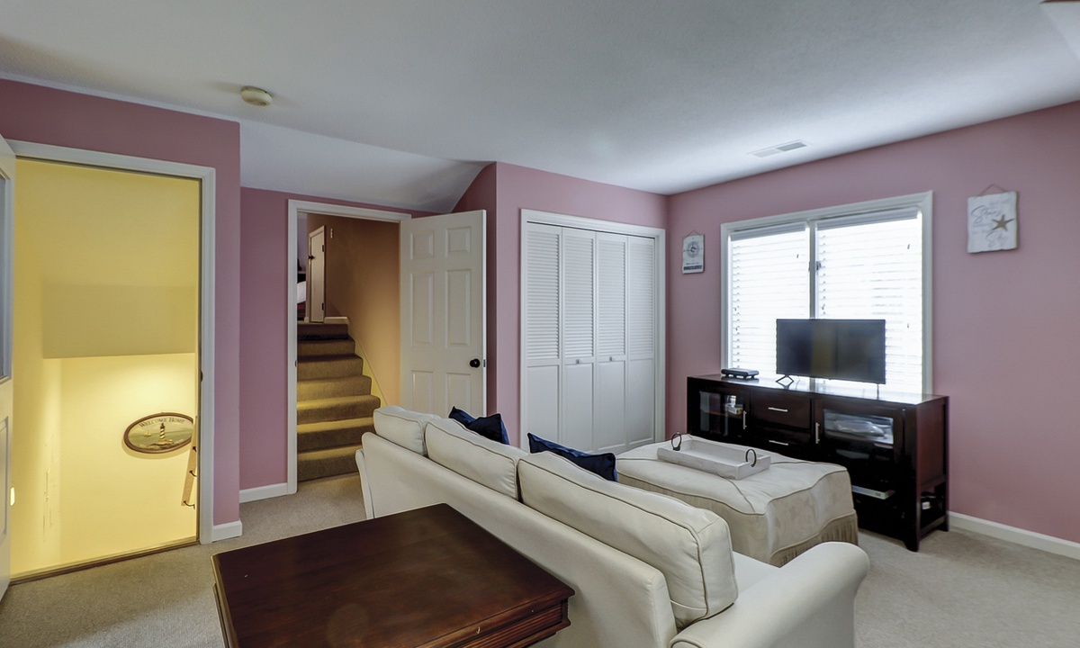 The second floor features a large, fun-filled bunk room with two sets of twin bunks, a sofa, a flat-screen Roku TV, and a variety of board games. Just off the bunk room, up a half-flight of stairs, is a room with two queen beds and a flat-screen Roku TV. Both rooms share a full bathroom.
