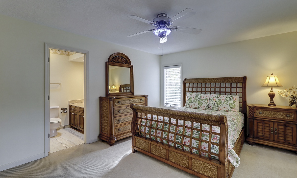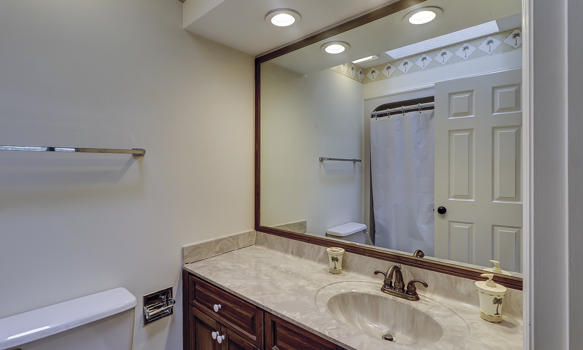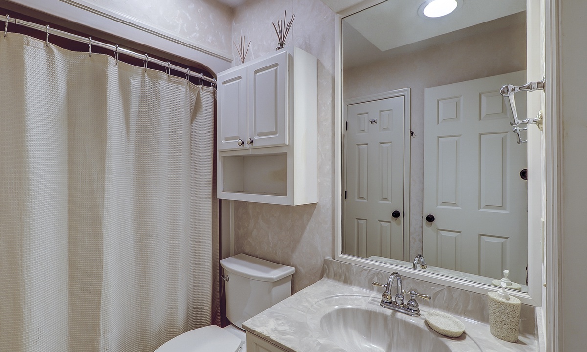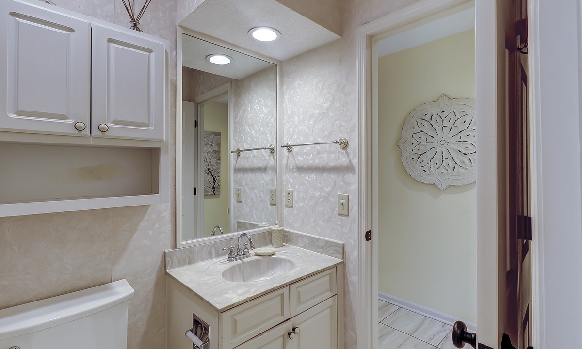 On the first level, you'll find three beautifully appointed bedrooms. The spacious primary bedroom offers a king bed, flat-screen TV, private access to the pool deck, and a luxurious en-suite bathroom with a dual vanity and large walk-in shower. Two additional queen bedrooms, each with its private bathroom and Roku-equipped TV, complete this level.