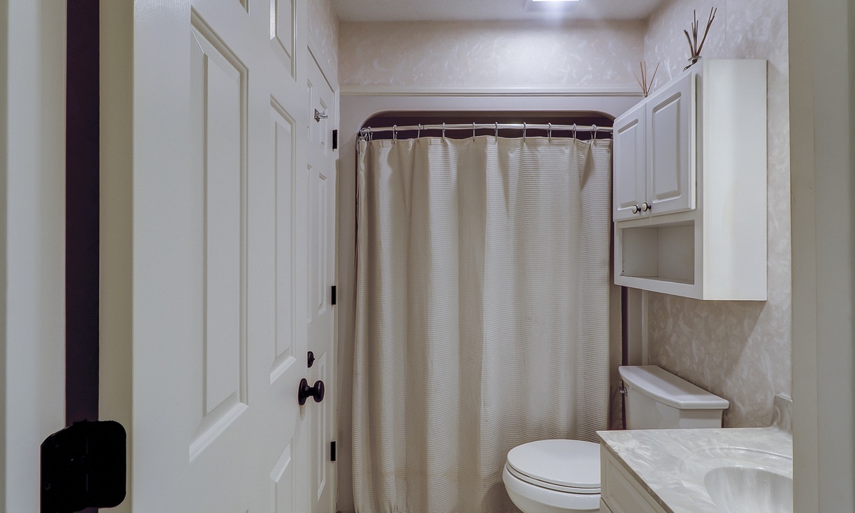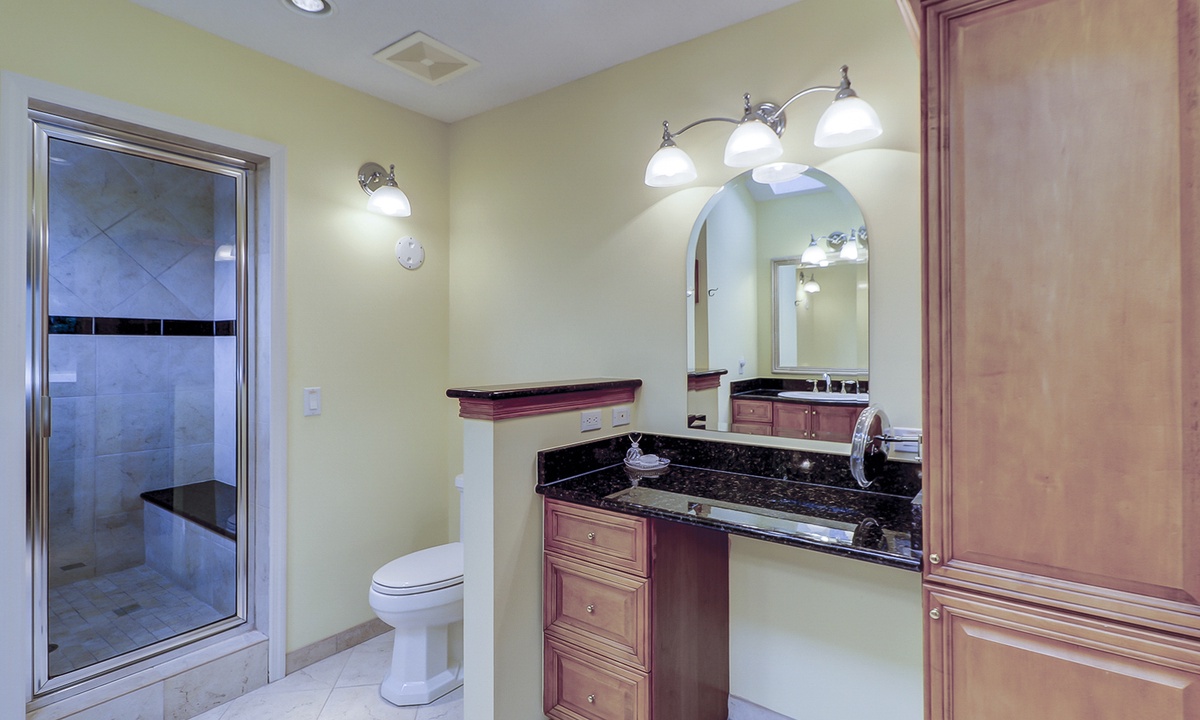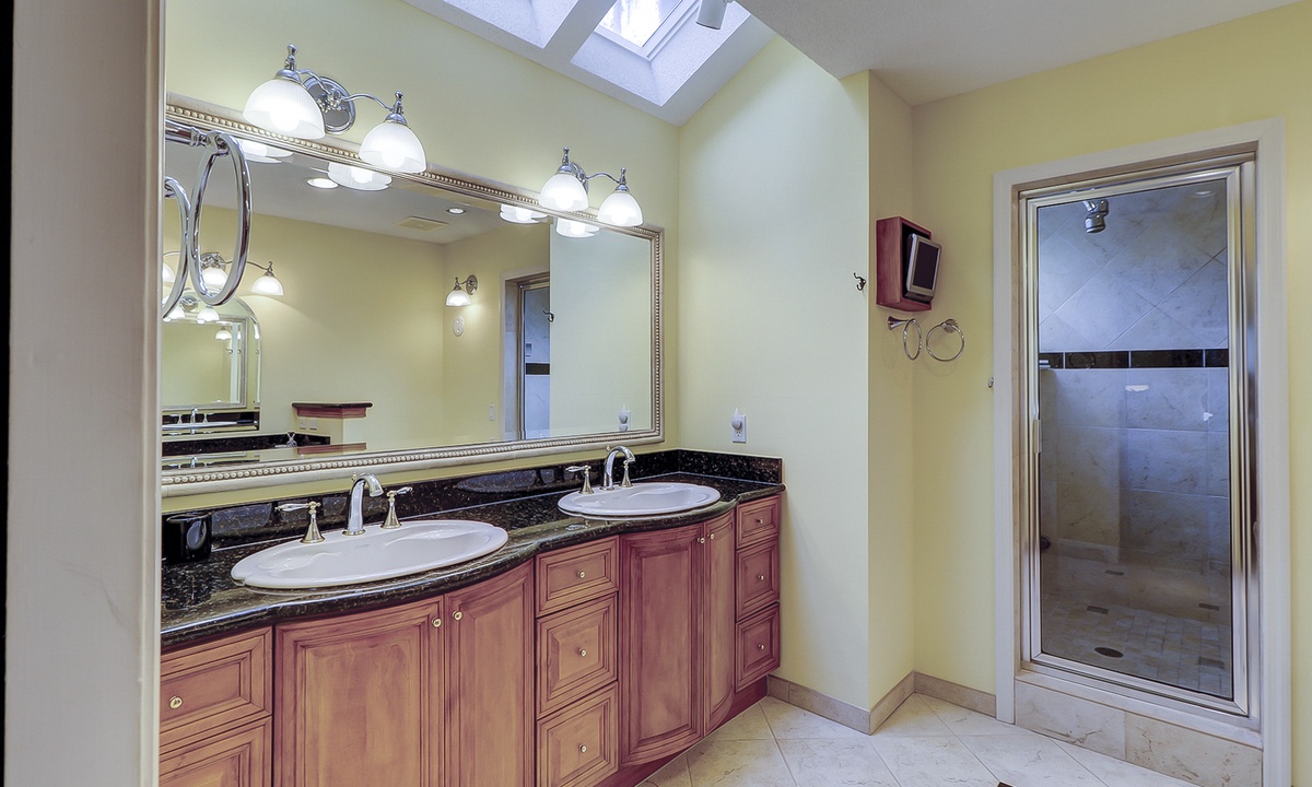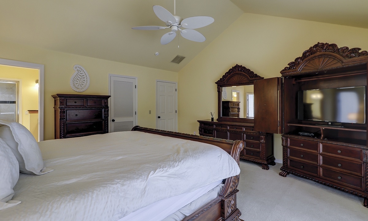 On the first level, you'll find three beautifully appointed bedrooms. The spacious primary bedroom offers a king bed, flat-screen TV, private access to the pool deck, and a luxurious en-suite bathroom with a dual vanity and large walk-in shower. Two additional queen bedrooms, each with its private bathroom and Roku-equipped TV, complete this level.