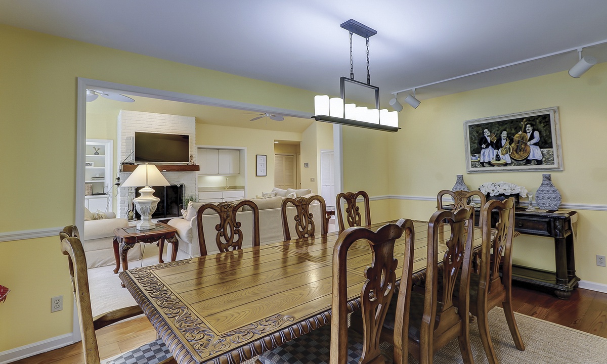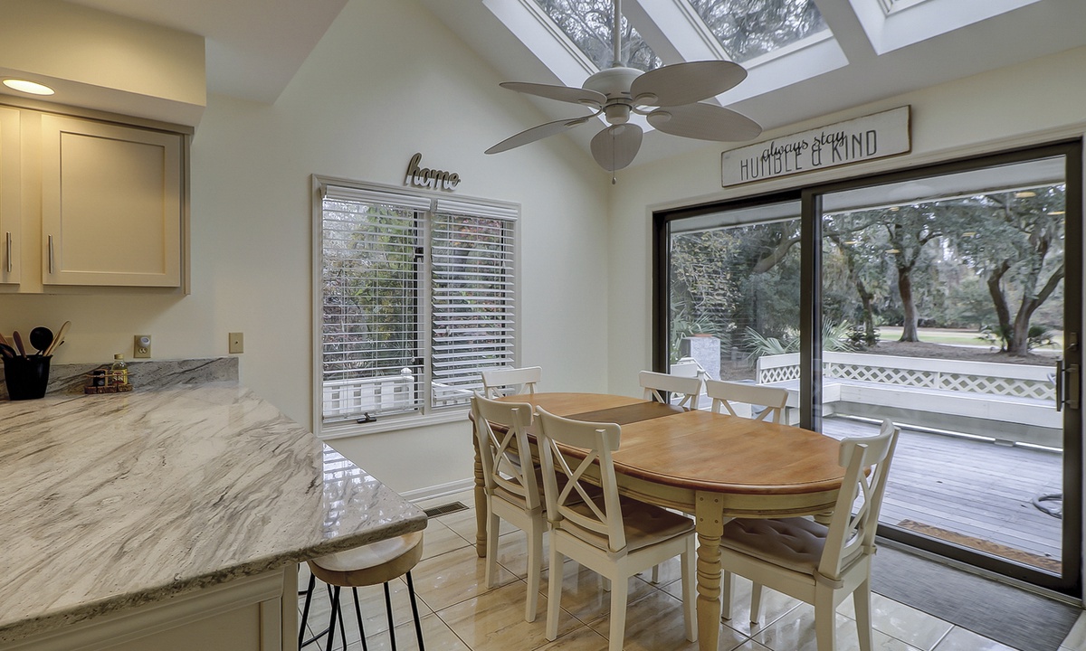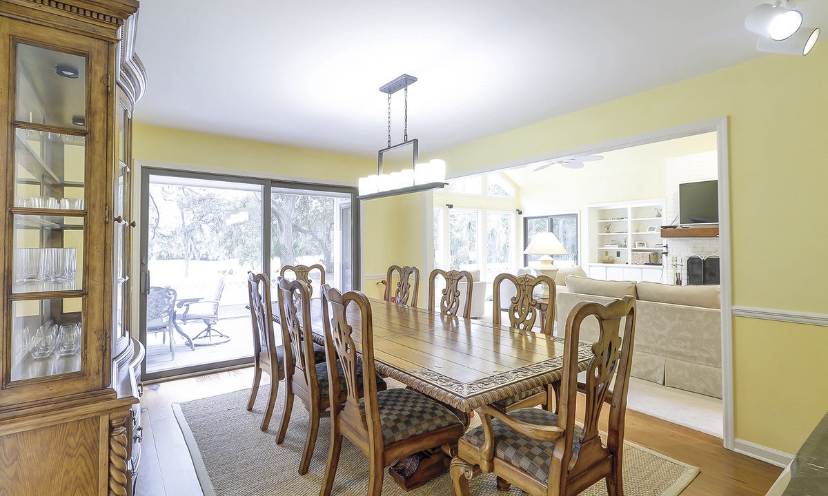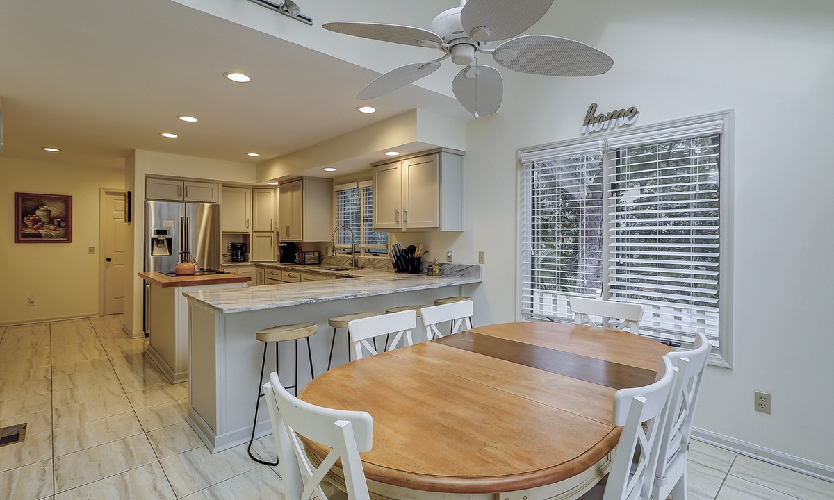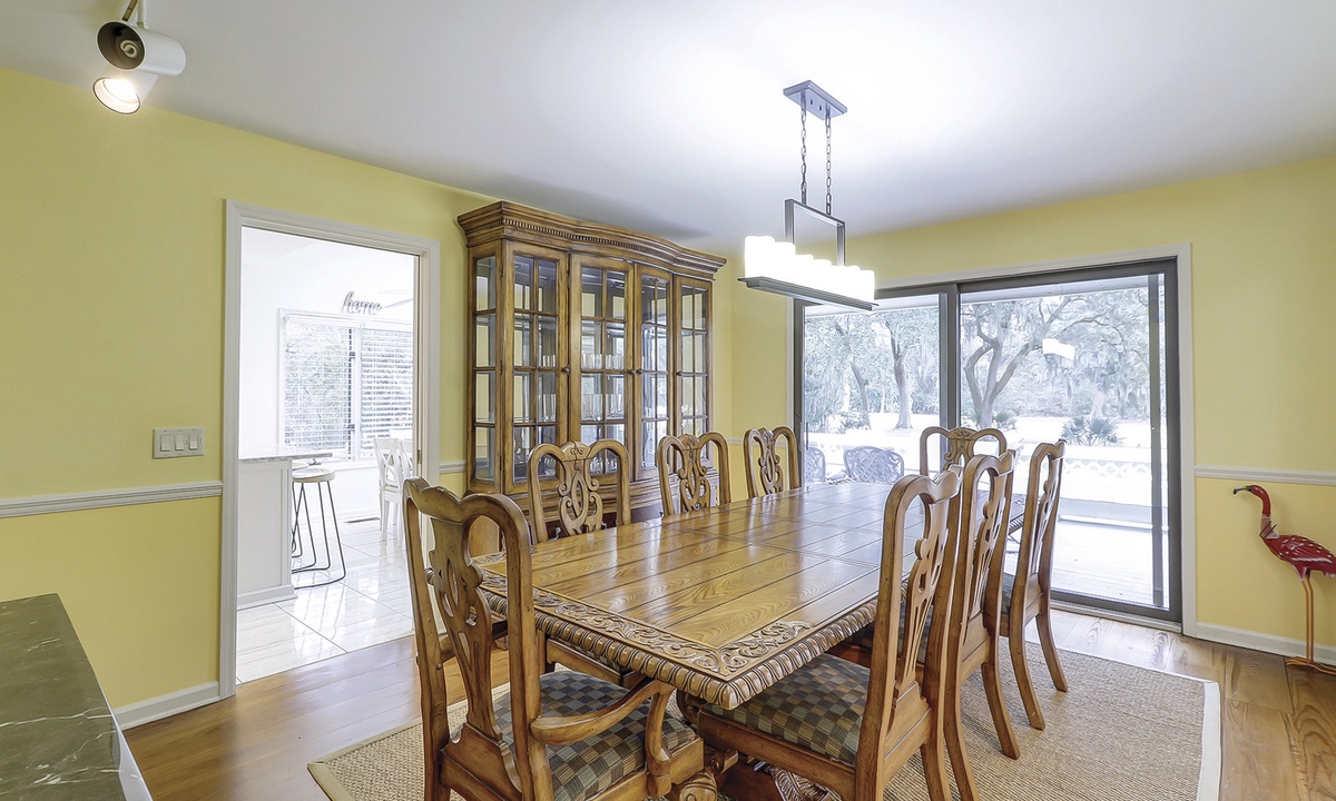 The open-concept living area offers plenty of seating, a large wall-mounted Smart TV, and sliding doors that open to an elevated deck. The deck showcases stunning views of the pool, backyard, and golf course. Whether you're enjoying meals at the formal dining table, breakfast nook, or kitchen bar, there's ample room for everyone to gather and relax.